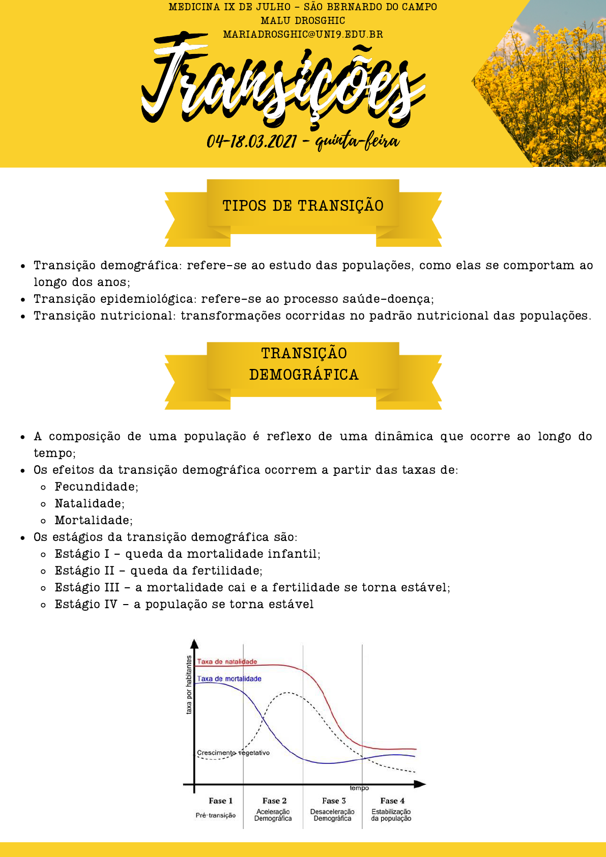 MEDICINA IX DE JULHO - SÃO BERNARDO DO CAMPO MALU DROSGHIC MARIADROSGHIC@UNI9.EDU.BR A composição de uma população é reflexo de uma dinâmica que ocorre ao longo do tempo; Os efeitos da transição demográfica ocorrem a partir das taxas de: Fecundidade; Natalidade; Mortalidade; Os estágios da transição demográfica são: Estágio I - queda da mortalidade infantil; Estágio II - queda da fertilidade; Estágio III - a mortalidade cai e a fertilidade se torna estável; Estágio IV - a população se torna estável TransiçõesTransiçõesTransiçõesTransições 04-18.03.2021 - quinta-feira TIPOS DE TRANSIÇÃO Transição demográfica: refere-se ao estudo das populações, como elas se comportam ao longo dos anos; Transição epidemiológica: refere-se ao processo saúde-doença; Transição nutricional: transformações ocorridas no padrão nutricional das populações. TRANSIÇÃO DEMOGRÁFICA A partir disso, pode-se dizer que a transição demográfica consiste na mudança de um cenário de altas taxas de mortalidade e natalidade para outro com baixas taxas de mortalidade e natalidade; Como resultado, ocorre aumento da expectativa de vida e incremento do número absoluto e proporcional de pessoas idosas. Transição espacial: ocorre com a modernização do campo, o que faz com que as pessoas deixem a área rural em direção aos grandes centros urbanos; Redução de fecundidade: ocorre com maior nível de escolaridade e oportunidades para as mulheres. TRANSIÇÃO DEMOGRÁFICA NO BRASIL Primeiro estágio (1903 - 1950): Grande número de nascimentos e de mortes; Início da urbanização; Maior desenvolvimento tecnológico; Implementação de medidas de controle de doenças; 1940: aumento da população em 2,3%; 1950: aumento da população em 3%, a mortalidade reduziu em 25%, decorrente de medidas sanitárias que ocasionariam no controle de doenças infecciosas; Segunda estágio (1950 - 1980): Início da redução da mortalidade e elevação da expectativa de vida; A taxa de fecundidade continua elevada, o que favorece o crescimento da população; Terceiro estágio (1980 - 2000): Redução da mortalidade se intensifica junto a redução da natalidade; Aumento de pessoas idosas; Diminuição da taxa de crescimento populacional; Quarto estágio (2000 - atualmente): Estabilização do crescimento populacional; Em 2000, a fecundidade foi de 2,4 filhos por mulher e, em 2006, de 2,0 filhos por mulher, valor inferior ao nível de reposição, que é de 2,1 filhos por mulher. CONSEQUEÊNCIAS DA TRANSIÇÃO DEMOGRÁFICA Envelhecimento da população; Na primeira fase a taxa de mortalidade cai, o que acarreta crescimento população porém na terceira fase, ocorre diminuição da taxa de natalidade. O que faz com que a renovação populacional não ocorra, aumentando a porcentagem de pessoas idosas; No Brasil o aumento da população geriátrica vem se processando em meio a pobreza e a desigualdade social. TRANSIÇÃO NUTRICIONAL Consiste em mudanças em como uma população se alimenta; A transição nutricional no brasil ocorreu da seguinte forma: 1970: surtos epidêmicos de fome, geográfico e socialmente localizados, ocorrendo formas graves de Desnutrição Energética Proteica (DEP); 1980: deficiência global de nutrientes em todo país; 1990: manutenção de DEP (norte e nordeste), acrescido de obesidade, debate e dislipidemias; Transição nutricional: O século XX foi marcado por mudanças nos padrões nutricionais; Surgimento de uma dieta rica em gorduras (principal de origem animal), açúcares e alimentos processado a reduzidos a carboidratos, menos grão e cereais e frutas; É uma dieta desequilibrada, com predomínio de alimentos calóricos e de fácil acesso; O predomínio dessa dieta tem contribuído, juntamente com o declínio progressivo de atividade física, para o aumento da obesidade; Ela também tem trazido doenças como câncer, doenças cardiovasculares e prevalência de obesidade nos estratos de renda e escolaridade mais baixos; Mudanças no padrão de consumo: Aumento no consumo de gorduras, carnes e açúcares; Diminuição no consumo de cereais, frutas e vegetais; Fatores que contribuíram para a mudança na alimentação: Mudanças nas relações familiares: mulher assume papel na sociedade como força de trabalho, se tornando chefe de família; Ausência na preparação de alimentos no lar: perda de identidade cultural; Modificação dos espaços físicos para o compartilhamento das refeições e as práticas para o preparo das refeições, o que ocasionou individualização do ritual alimentar; Consumo crescente de alimentos prontos, industrializados ou pré-preparados; Estilo de vida majoritariamente sedentário. É a transição das doenças que caracterizam o perfil epidemiológico de um país, cidade ou região; Períodos da transição epidemiológica: Período das pragas e da fome: níveis de mortalidade e fertilidade elevados, predomínio das doenças infecciosas e parasitárias, desnutrição, problemas de saúde reprodutiva; Período do desaparecimento das pandemias; Período das doenças degenerativas e das doenças provocadas pelo homem; Período do declínio da mortalidade por doenças cardiovasculares, envelhecimento populacional, modificações no estilo de vida, doenças emergentes e surgimento de doenças; Período da longevidade paradoxal, emergência de doenças enigmáticas e capacitação tecnológica para a sobrevivência do inapto. a. b. c. d. e. TRANSIÇÃO EPIDEMIOLÓGICA TRANSIÇÃO EPIDEMIOLÓGICA NO BRASIL Ocorreu sobreposição de modelos, fazendo com que ela tenha ocorrido de maneira distinta de outros países; Reaparecimento de doenças seculares (dengue, febre amarela, leishmaniose, tuberculose, hanseníase, dentre outras); Houve aumento expressivo de causas externas, como a violência urbana ou violência no trânsito; Aumento na prevalência das doenças cardiovasculares; No país, a transição demográfica ocorreu de uma fo