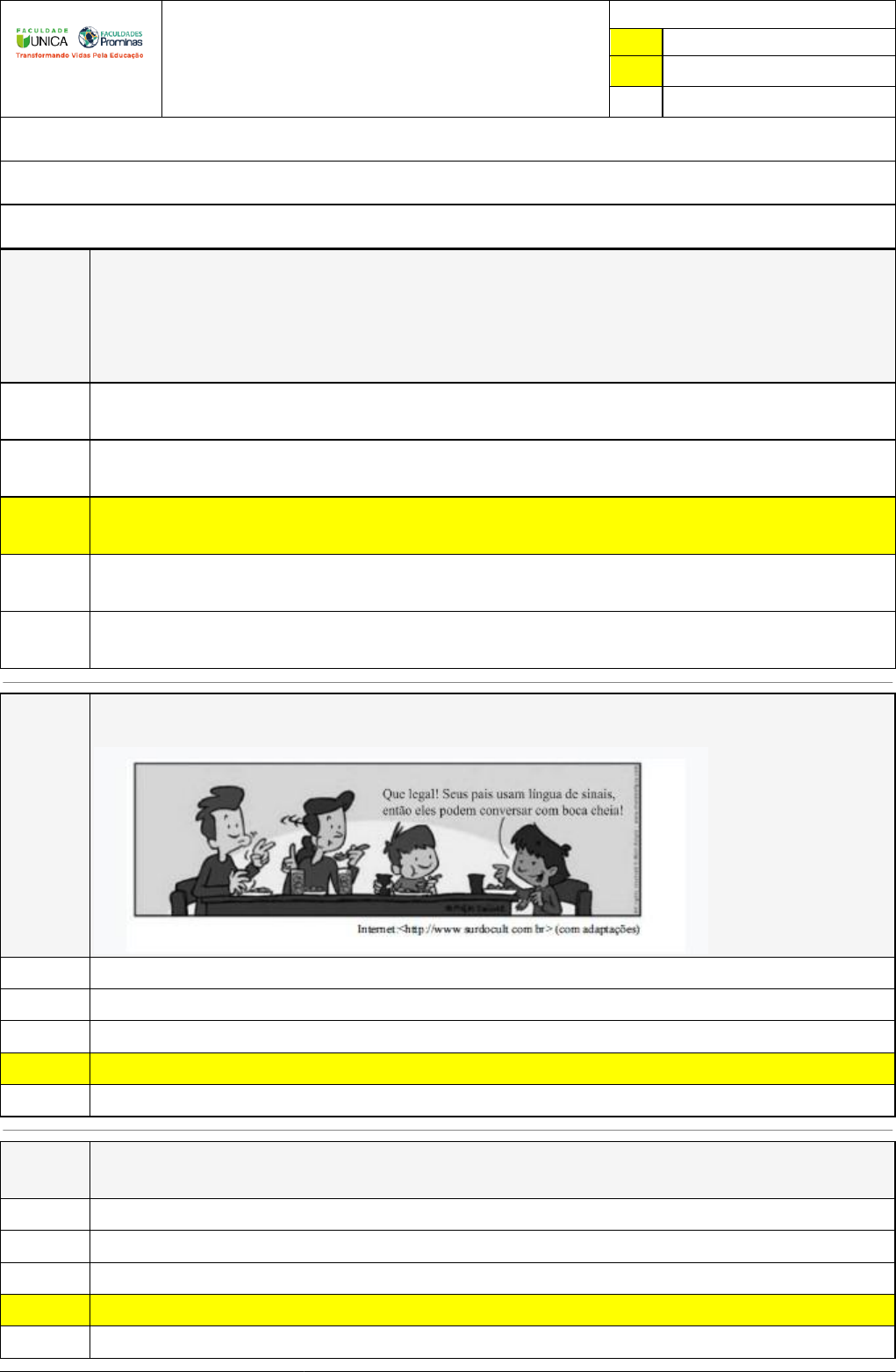 Pincel Atômico - 16/08/2021 17:05:29 1/4 Avaliação Online (SALA EAD) Atividade finalizada em 16/07/2021 18:23:34 (tentativa: 1) LEGENDA Resposta correta na questão # Resposta correta - Questão Anulada X Resposta selecionada pelo Aluno Disciplina: LÍNGUA BRASILEIRA DE SINAIS - LIBRAS [capítulos - 1,2,3] - Avaliação com questões, com o peso total de 30,00 pontos Turma: Segunda Graduação: Física para Licenciados - Grupo: ABRIL/2021 - SEGLIC-FIS/ABR21 [21785] Aluno(a): - Respondeu 8 questões corretas, obtendo um total de 24,00 pontos como nota Questão 001 (FGV – 2016) Em uma reunião de Conselho de Classe de uma escola de Ensino Fundamental, a professora instrutora de Libras junto com a professora da sala de recursos defende a aprovação de alguns alunos surdos na disciplina da Língua Portuguesa. Assinale a opção que apresenta o fundamento legal adotado pelas professo-ras. A maioria dos professores de Língua Portuguesa precisa ensinar a língua oral para os alunos surdos e posteriormente a Libras. A escola deve proporcionar um ambiente linguístico favorável promovendo somente atividades orais entre todos os alunos. X A educação para alunos surdos deve ser bilíngue, sendo o ensino da Língua Portuguesa como segunda língua na modalidade escrita. A escola deve fazer circular, em seu ambiente, a importância da Língua Portuguesa na modalidade oral para os alunos surdos. A educação para alunos surdos deve ser monolíngue, sendo somente ensina-do a Libras como a primeira língua de instrução. Questão 002 Acerca dos artefatos culturais que compõem a cultura surda, na concepção de Strobel, a tirinha precedente se refere aos artefatos vida esportiva e vida social. político e material. literatura surda e familiar. X linguístico e familiar. artes visuais e esportivo. Questão 003 Ao pensarmos na formação dos sons, e associar todo esse percurso à perda auditiva, podemos identificar três tipos diferentes de perdas auditivas Perda auditiva neurossensorial, perda auditiva mista, perda transitória da audição. Perda comum do som, perda transitória da audição e perda auditiva neurológica. Perda auditiva condutiva, perda auditiva neurológica e perda comum do som. X Perda auditiva condutiva, perda auditiva neurossensorial e perda auditiva mista. Perda auditiva condutiva, perda auditiva neurossensorial e perda leve. Pincel Atômico - 16/08/2021 17:05:29 2/4 Questão 004 (UERGS/RS – 2019) Conforme Strobel (2009) cultura surda é o jeito de o sujeito surdo entender o mundo e de modificá-lo a fim de torná-lo acessível e habitá-vel, ajustando-o com suas percepções visuais, que contribuem para a defini-ção de identidades surdas e das almas das comunidades surdas. Isso significa que ela abrange família, as ideias, as crenças, os costumes e os hábitos do povo surdo. X a língua, as ideias, as crenças, os costumes e os hábitos do povo surdo. a escola, a família, os costumes linguísticos e sociais do povo surdo. os amigos, a cultura e as viagens do povo surdo. a escola, a família, os costumes do povo surdo. Questão 005 Faziam parte de algumas práticas pedagógicas do oralismo, X comunicação total, desenvolvimento da fala, leitura labial. treinamento auditivo, comunicação total, leitura labial. treinamento auditivo, desenvolvimento da fala, bilinguismo, leitura labial. Bilinguismo, desenvolvimento da fala, leitura labial. Treinamento auditivo, desenvolvimento da fala, oralismo. Questão 006 O Congresso de Milão ocorreu em 1880, na Itália no período de 06 a 11 de setembro. Participaram desse congresso Alemanha, Bélgica, Canadá, Estados Unidos, França, Inglaterra, Suécia e Rússia, aproximadamente 182 pessoas, sua maioria ouvinte. O objetivo desse evento era discutir a acerca de educação surda, uma vez que a língua falada era superior a língua gestual, e que esta representava um retrocesso na evolução da linguagem, além disso, buscava-se garantir a supremacia e hegemonia do Oralismo. (SILVA et. al,2006). Durante o Congresso foram tomadas as seguintes resoluções: I. A oralidade era a forma mais adequada de inserção dos surdos na sociedade. II. Adoção parcial do Oralismo. III. Cabia ao Estado assegurar e garantir a educação dessas pessoas. IV. Os surdos só poderiam se comunicar por meio da fala. É CORRETO apenas o que se afirma em II, III e IV. X I, III e IV. I e II. I, II, III e IV. I, II e IV. Pincel Atômico - 16/08/2021 17:05:29 3/4 Questão 007 Receber um aluno Surdo na escola, é uma ação de extrema responsabilidade. Vale ressaltar, que documentos como o de audiometria e outros que o complementem são de extrema importância para a adaptação do currículo escolar, bem como o atendimento educacional especializado. A partir do trecho, avalie as afirmações a seguir e assinale a alternativa CORRETA. I. Os documentos médicos do aluno devem ser entregues na escola no ato da matrícula. II. Esses documentos devem fazer parte da pasta individual do aluno para que quando dúvidas surgirem, os envolvidos na escola possam consultá-lo. III. Esses documentos não interferem na solicitação do AEE. IV. Cabe à escola providenciar os documentos necessários que comprovem a necessidade do AEE. I, II e IV. I, III e IV. X I e II. II, III e IV. I, II, III e IV. Questão 008 A partir da imagem que representa o Congresso de Milão, avalie as afirmações a seguir e assinale a alternativa CORRETA. I. Neste período o que prevaleceu foi a supremacia da concepção oralista. II. Fatores históricos e os pressupostos filosóficos, políticos e religiosos alicerçaram a supremacia da linguagem oral. III. Os pressupostos filosóficos apregoavam a oralidade como uma abstração, enquanto o gestual se manifestava como ausência de pensamento. IV. Para os religiosos a ausência da oralidade não impedia os surdos de se confessarem. X I, II e III. I, II, III e IV. I e II. I, III e IV. II, III e IV. Pincel Atômico - 16/08/2021 17:05:29 4/4 Ques