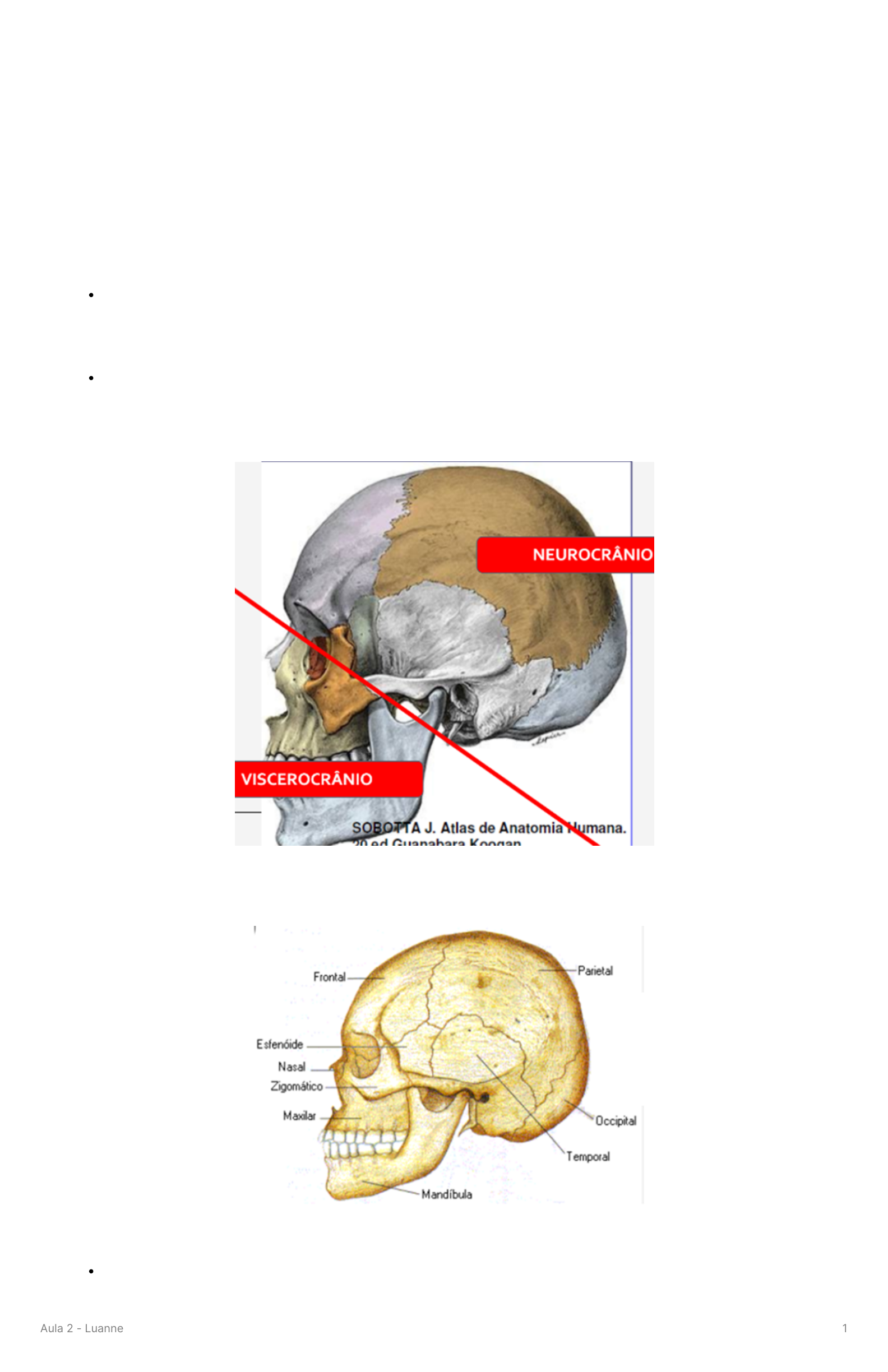 Aula 2 - Luanne 1 Aula 2 - Luanne 02/03/2021 - Mariana M. de Almeida Crânio Osteologia = estudo do crânio ESQUELETO AXIAL Classificação topográfica mediano, formando o eixo do corpo (crânio, hióide, coluna e caixa torácica). Ao todo, são 22 ossos: - 08 formando o neurocrânio (sustenta o encefalo) - 14 formando o viscerocrânio Os ossos do crânio são chatos (achatados, planos ou laminares) e com exceção da mandíbula, articulam-se entre si por junturas (articulações minúsculas) que NÃO PERMITEM MOBILIDADE = SUTURAS. Ossos do crânio Os ossos do crânio estão unidos firmemente para proteger o encéfalo; Aula 2 - Luanne 2 Ficam situados na parte mais alta do corpo humano, sustentados pela coluna cervical. O crânio humano é composto por 22 ossos e 3 ossículos no interior do ouvido (orelha). Pontos frágeis do crânio: olhos, ouvido, nariz, boca, nas suturas. *** Doença de Paget e Artrogripose. Na maturidade, as fibras da sutura são substituidas: SINOSTOSE Ferimento em borda superior do osso zigomático no lado direito. Em lesões nessa localização é importante ter cuidado, pois antes de suturar é preciso fazer radiografia para identificar se teve fratura ou afundamento de crânio. Aula 2 - Luanne 3 Corte Axial - além do mais, as dores de cabeça são bastante prevalentes em região temporal. E nas crianças, pessoas com deficiência no equilíbrio, as quedas acometem a região occipital. Plano 1 frontal/coronal e plano 2 lateral/sagital Plano 1 frontal/coronal e Plano 2 lateral/sagital Aula 2 - Luanne 4 Classificação das Articulações Sinartroses ou articulações fibrosas: são imóveis Anfiartroses ou articulações cartilagíneas: semi-móveis Diartroses ou cartilagens sinoviais: móveis As articulações que apresentam mobilidade restrita ou ainda as que não apresentam mobilidade são classificadas quanto ao tecido interposto (tecido conjuntivo que une as peças ósseas) e são do tipo: fibroso (suturas, nariz), cartilaginoso (cotovelo) e fibrocartilaginoso (orelha). A maioria das nossas articulações são cartilagonisosas. As articulações que apresentam amplos movimentos são classificadas quanto aos seus componentes anatômicos sendo denominadas sinoviais. o material cartilaginoso é para dar movimentação, o fibrocartiloginoso tem movimentação mas não tanta já o fibroso tem o intuito a resistência ao movimento. Articulações fibrosas do crânio: incluem todas as articulações onde as superfícies dos ossos estão quase em contato direto O grau de mobilidade, sempre pequeno, depende do comprimento das fibras interpostas. Aula 2 - Luanne 5 O crânio do homem vs. da mulher, difere que, possui medida craniana maior no homem, diferença no tamanho da mandíbula, Suturas planas: se encontram no plano sagital mediano do crânio. Ex: internasal, intermaxilar e interpalatina. Gonfoses - presente nos dentes Se a fontanela estiver abaulada, inchada, pode ser decorrente de trauma, meningite, infecção. E quando estiver rebaixada, significa que essa criança está desidratada. Portanto, é importante orientar o aleitamento. Não é recomendado para criança chupar dedo/bico devido a alterações na arcada dentária, fenda paliativa e alterações respiratórias. Aula 2 - Luanne 6 Gonfoses: é uma articulação fibrosa especializada à fixação dos dentes nas cavidades alveolares na mandíbula e maxilas. Articulação têmporo-mandibular ATM avaliar essa articulação no paciente com dor de cabeça, pedir para abrir/fechar a boca. Aspectos gerais: localizados abaixo da pele, camada muscular delgada, movimenta a pele e a mucosa, abrem/fecham orifícios, relacionados à pregas e rugas Aula 2 - Luanne 7 Músculos da ATM responsáveis pela mastigação: TEMPORAL MASSETER PTERIGÓIDEO MEDIAL PTERIGÓIDEO LATERAL A articulação têmporo-mandibular é responsável pelos movimentos da mandíbula (fonação e mastigação).