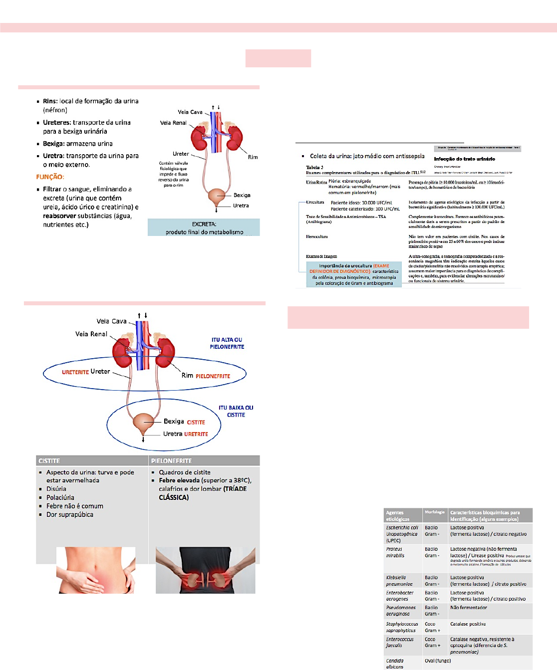 Trajeto da Urina -Polaciuria: aumento da frequência urinária, não necessariamente há aumento da quantidade de urina -Poliuria- aumento da quantidade de urina Tipos de ITU -A litíase renal (cálculos renais) refere-se à presença de “pedras” nos rins. É uma das causas mais frequentes de cólicas renais. Os cálculos renais podem ter diversas composições, sendo os mais frequentes os cálculos de oxalato de cálcio e de ácido úrico. Os cálculos renais podem causar perda de sangue na urina BGN fermentadores - enterobactérias BGN não fermentadores - pseudomonas e acinetobacter (patógenos oportunistas) Exames complementares (laboratoriais) Patógenos associados -A Escherichia coli uropatogênica (UPEC) permanece como o principal agente bacteriano em 70 a 95% dos episódios de infecção do trato urinário não complicados e 50% dos episódios de infecção do trato urinário relacionados ao uso de cateter vesical. -Outros bacilos Gram-negativos, Proteus mirabilis, Klebsiella pneumoniae, Enterobacter aerogenes, Pseudomonas aeruginosa e cocos Gram-positivos (Staphylococcus saprophyticus em até 10% dos casos e Enterococcus spp.) podem estar envolvidos. -No caso das infecções do trato urinário relacionadas ao cateter vesical, o uso prolongado deste dispositivo (superior a 30 dias) promove episódios polimicrobianos entre 77 e 95% dos casos, além da ocorrência de leveduras, especialmente do gênero Candida. As espécies de Candida são responsáveis por 10 a 15% dos casos, Infecção do Trato Urinário (ITU) Bactéria prevalecendo a Candida albicans, em 51% destes casos. Escherichia coli Uropatogênica (UPEC) características gerais • Pertence à família Enterobacteriaceae • Sorogrupos prevalentes : O1, O2, O6, O18 e O75 / Sorotipo importante: O18:K1:H7 • Características morfológicas: bacilo gram negativo não formador de endósporo, geralmente móvel • Fatores de crescimento: anaeróbio facultativo • Características bioquímicas (exemplos): lactose positivo, glicose positivo, catalase positivo etc. • Adesina: principal fator de virulência, pois permite adesão e invasão das células do trato urinário / ativa vias de sinalização nas bactéria e hospedeiro, facilitando liberação de proteínas bacterianas no tecido e promovendo a invasão bacteriana. Fatores de virulência E. coli • FÍMBRIA TIPO 1: adesão ao epitélio vaginal e da bexiga / formação de BIOFILMES e invasão celular (INTRACELULAR FACULTATIVO) • FÍMBRIA P: adesão ao epitélio renal também • FLAGELO: permite que as bactérias se movam de forma ascendente no trato urinário, desde a bexiga até os rins • EXOTOXINA α-HEMOLISINA: esfoliação das células da bexiga, apoptose e lesão tecidual (permite disseminação). Em outras células, pode se inserir na membrana citoplasmática formando poros que facilitam a liberação de nutrientes e íons ferro. Tem especificidade para uma variedade de tipos celulares como hemácias, fibroblastos, granulócitos, linfócitos e macrófagos. A ação sobre células fagocíticas permite que a bactéria escape das defesas hospedeiras • EXOTOXINA CNF 1 (fator citotóxico necrotizante tipo 1): ação necrotóxica (apoptose). Na bexiga, contribui para invasão do epitélio 1)Adesão ao epitélio da bexiga, através da fímbria do tipo 1 e também pode ser pela fímbria P 2)Invasão na célula epitelial, através da fímbria do tipoI 3)Multiplicação bacteriana intracelular (INTRACELULAR FACULTATIVA). Formação de comunidades bacterianas (proteção contra o sistema imune) 4)Esfoliação (degradação de células epiteliais) e apoptose: causado pela exotoxina α-hemolisina, aumentando a disseminação da UPEC. Algumas comunidade bacterianas intracelulares continuam intactas (possível causa de infecção recorrente) -Bactérias flageladas podem sair da comunidade e voltar para o lúmen vesical ou podem invadir células adjacentes. Nesse momento, há migração de leucócitos polimorfonucleares. Infecções não tratadas podem progredir de forma ascendente até alcançar os rins e próstata. O que vai depender? Expressão de flagelos e fímbria P (papel importante na aderência ao epitélio renal). A inflamação é mediada por citocinas, cuja produção é induzida pelo antígeno O, α-hemolisina etc. Pode atravessar epitélio renal, atingir corrente sanguínea. Leptospirose - via hematogênica
