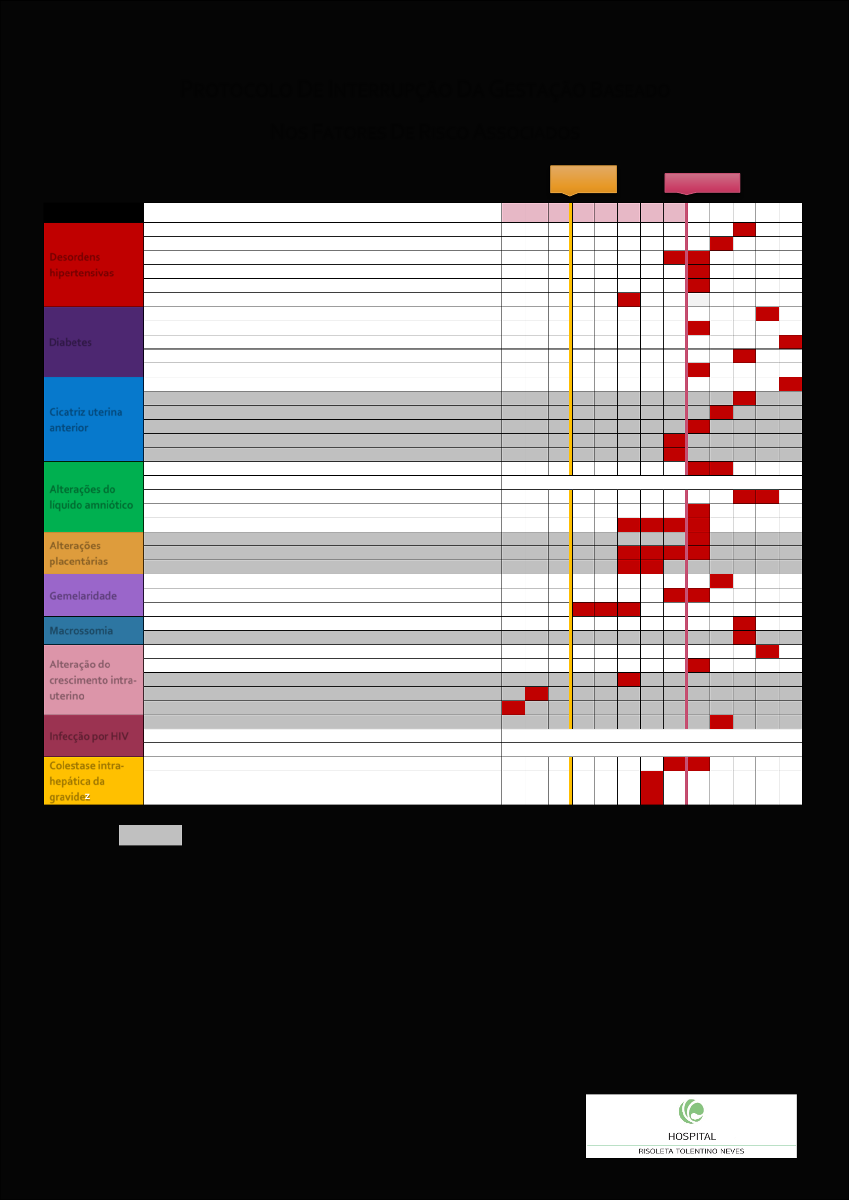 PROTOCOLO DE INTERRUPÇÃO DA GESTAÇÃO BASEADO NOS FATORES DE RISCO ASSOCIADOS CONDIÇÃO 26 30 31 32 33 34 35 36 37 38 39 40 41 Desordens hipertensivas HAC sem uso de anti-hipertensivos x HAC controlada com medicamentos x HAC de difícil controle x X Hipertensão gestacional x PE sem critérios de gravidade X PE com critérios de gravidade Diabetes DM pré gestacional com bom controle X DM pré gestacional com mau controle glicêmico ou vasculopatia X DMG bem controlado com dieta X DMG bem controlado com insulina ou hipoglicemiante oral x DMG com mau controle glicêmico x Cicatriz uterina anterior Uma cesariana anterior x Duas ou mais cesarianas anteriores X Miomectomia intramural prévia, uteroplastia X Rotura uterina anterior, à termo e segmentar, durante o trabalho de parto X Rotura uterina anterior, pré-termo ou anteparto X Cesariana clássica (corporal) anterior, miomectomia extensa prévia X Alterações do líquido amniótico Oligohidrâmnio idiopático x X Oligohidrâmnio – Outras causas Considerar a causa base Polidrâmnio Leve e Moderado X x Polidrâmnio Severo X Polidrâmnio Severo com sintomas maternos não responsivo ao tto clínico X x x x Alterações placentárias Placenta prévia total X Acretismo placentário X x x X Vasa prévia X x Gemelaridade Gemelar di/di não complicada x Gemelar mono/di não complicada x x Gemelar mono/mono x x Macrossomia PFE entre 4000 g e 4500 g X PFE >4500 g X Alteração do crescimento intra- uterino PIG Peso entre P 3 e P 10 com Doppler normal x CIUR Estágio I Peso < P 3, CPR < P 5, IP de AU > P 95, IP da ACM < P 5. , IP de Aa.Uterinas > P 95 x CIUR Estágio II AU: Diástole zero, Fluxo reverso em IAo x CIUR Estágio III AU: Diástole reversa , IP do ducto venoso > P 95 x CIUR Estágio IV Fluxo reverso no ducto venoso x Infecção por HIV Carga viral desconhecida ou maior que 1000 cópias/mL, após 34 semanas x Carga viral abaixo de 1000 cópias/mL, porém detectada, após 34 semanas Termo, via de parto obstétrica, indicada profilaxia c/ AZT venoso intraparto Paciente em uso de TARV, com carga viral indetectável sustentada Termo, via de parto obstétrica, SEM INDICAÇÃO de AZT venoso intraparto Colestase intra- hepática da gravidez Bem tolerada e não complicada X X Cursando com prurido intenso não responsivo ao tratamento clínico, icterícia, passado de decesso fetal decorrente de colestase X Legenda: REFERÊNCIAS: - ACOG Practice Bulletin Nº169: Multifetal gestations, 2018. - ACOG Practice Bulletin Nº202: Gestational Hypertension and Preeclampsia, 2018. - ACOG Practice Bulletin Nº203: Chronic Hypertension in Pregnancy, 2018. - ACOG Practice Bulletin Nº201: Pregestational Diabetes Mellitus, 2018. - ACOG Practice Bulletin Nº190: Gestational Diabetes Mellitus, 2018. - ACOG Practice Bulletin Nº173: Fetal Macrossomia, 2016. - Management of hypertension in pregnant and postpartum women, UpToDate, 2018. - Fetal Macrossomia, UpToDate, 2018. - Pregestacional Diabetes Mellitus: obstetrical issues and management, UpToDate, 2018. - Gestacional Diabetes Mellitus: obstetrical issues and management, UpToDate, 2018. - Polyhydramnios, UpToDate, 2018. - Oligohydramnios, UpToDate, 2018. - Uterine rupture: After previous cesarean delivery, UpToDate, 2018. - Repeat cesarean delivery, UpToDate, 2018. - Placenta previa: Management, UpToDate, 2018. - Management of the placenta accrete spectrum, UpToDate, 2018. - Velamentous umbilical cord insertion and vasa previa, UpToDate, 2018. - Intrahepatic cholestasis of pregnancy, UpToDate, 2018. - Update on the diagnosis and classification of fetal growth restriction and proposal of a stage-based management protocol; Figueiras F, Gratacos E, Fet Diag Ther, 2014;36:86 Elaboração: Daniele Carvalhais, Daniella Melo, Larissa Aquino, Larissa Volpini, Marcel Abreu, Satomi Shikanai, Thaís Caracas Design: Caroline Reis Gonçalves Aprovação: Marcel Henrique Coelho de Abreu – Referência Técnica em Obstetrícia Patrícia Pereira Rodrigues Magalhães – Coordenadora da Linha do Cuidado Materno Infantil Mônica Aparecida Costa - Diretoria Técnica Neuroproteção MgSO4 (31s+6s) Cesariana Corticoide (36s+6d) REFERÊNCIAS: - ACOG Practice Bulletin Nº169: Multifetal gestations, 2018. - ACOG Practice Bulletin Nº202: Gestational Hypertension and Preeclampsia, 2018. - ACOG Practice Bulletin Nº203: Chronic Hypertension in Pregnancy, 2018. - ACOG Practice Bulletin Nº201: Pregestational Diabetes Mellitus, 2018. - ACOG Practice Bulletin Nº190: Gestational Diabetes Mellitus, 2018. - ACOG Practice Bulletin Nº173: Fetal Macrossomia, 2016. - Management of hypertension in pregnant and postpartum women, UpToDate, 2018. - Fetal Macrossomia, UpToDate, 2018. - Pregestacional Diabetes Mellitus: obstetrical issues and management, UpToDate, 2018. - Gestacional Diabetes Mellitus: obstetrical issues and management, UpToDate, 2018. - Polyhydramnios, UpToDate, 2018. - Oligohydramnios, UpToDate, 2018. - Uterine rupture: After previous cesarean delivery, UpToDate, 2018. - Repeat cesarean delivery, UpToDate, 2018. - Placenta previa: Management, UpToDate, 2018. - Management of the placenta accrete spectrum, UpToDate, 2018. - Velamentous umbilical cord insertion and vasa previa, UpToDate, 2018. - Intrahepatic cholestasis of pregnancy, UpToDate, 2018. - Update on the diagnosis and classification of fetal growth restriction and proposal of a stage-based management protocol; Figueiras F, Gratacos E, Fet Diag Ther, 2014;36:86