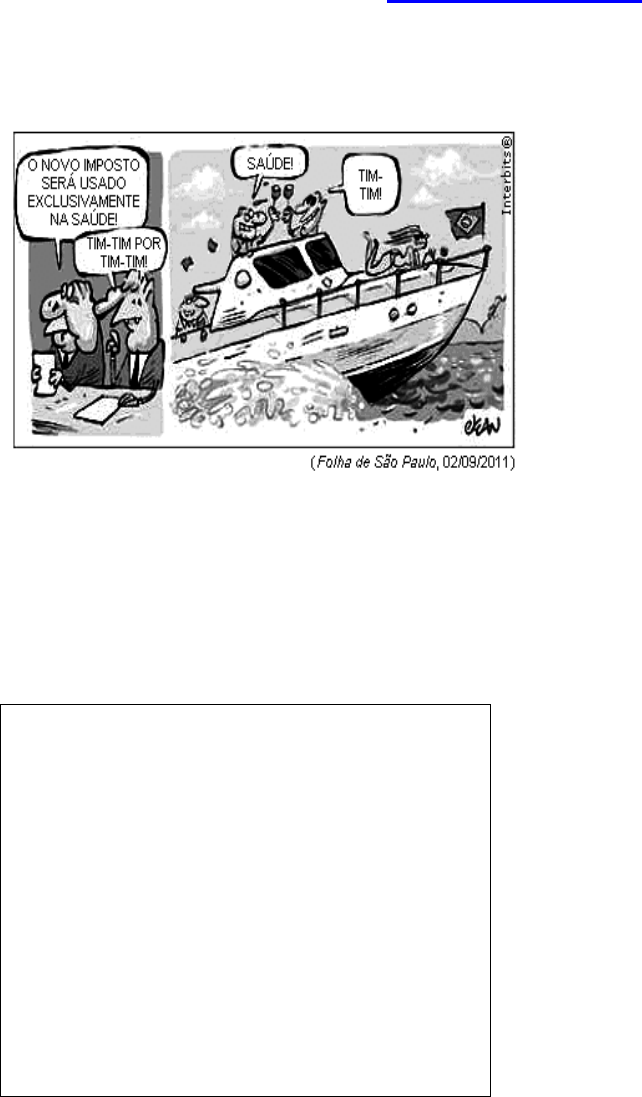 RELAÇÕES SEMÂNTICAS Questões comentadas Prof. Jorge Jr. www.profjorge.com.br ___________________________________________________________________________ 1. (Insper 2012) Para criticar a possķvel aprovaēćo de um novo imposto pelos deputados, o cartunista adotou como estratégias a) polissemia das palavras e onomatopeia. b) traços caricaturais e eufemismo. c) paradoxo e repetição de palavras. d) metonímia e círculo vicioso. e) preterição e prosopopeia. [A] - A palavra é usada com sentidos diferentes em momentos que retratam situações distintas. No primeiro, o personagem usa a palavra “saúde” como substantivo para referir-se de maneira genérica aos organismos públicos que cuidam do combate a doenças. No segundo, como uma interjeição para fazer um brinde ou saudação. Na última fala da charge, a interjeição “tim-tim”, palavra onomatopaica que reproduz o som de taças, é usada com o mesmo sentido, foneticamente semelhante à expressão “tim-tim por tim-tim” usada no primeiro enquadramento com o sentido de “sem omitir nada”. Assim, o cartunista adotou como estratégias a polissemia das palavras e a onomatopeia, como se afirma em [A]. TEXTO PARA A PRÓXIMA QUESTÃO: A palavra Tanto que tenho falado, tanto que tenho escrito − como não imaginar que, sem querer, 4feri alguém? Às vezes sinto, numa pessoa que acabo de conhecer, uma hostilidade surda, ou uma reticência de mágoas. 1Imprudente 5ofício é este, de viver em voz alta. 11Às vezes, também a gente tem o 6consolo de saber que alguma coisa que se disse por acaso ajudou alguém a se 9reconciliar consigo mesmo ou com a sua vida de cada dia; a sonhar um pouco, a sentir uma vontade de fazer alguma coisa boa. Agora sei que outro dia eu disse uma palavra que fez bem a alguém. Nunca saberei que palavra foi; deve ter sido alguma frase 7espontânea e distraída que eu disse com naturalidade porque senti no momento − e depois 3esqueci. Tenho uma amiga que certa vez ganhou um canário, e o canário não cantava. Deram-lhe receitas para fazer o canário cantar; que falasse com ele, cantarolasse, batesse alguma coisa ao piano; que pusesse a gaiola perto quando trabalhasse em sua máquina de costura; que arranjasse para lhe fazer companhia, algum tempo, outro canário cantador; até mesmo que ligasse o rádio um pouco alto durante uma transmissão de jogo de futebol... mas o canário não cantava. Um dia a minha amiga estava sozinha em casa, distraída, e assobiou uma pequena frase melódica de Beethoven − e o canário começou a cantar alegremente. Haveria alguma 8secreta ligação entre a alma do velho artista morto e o pequeno pássaro cor de ouro? 2Alguma coisa que eu disse distraído − talvez palavras de algum poeta antigo − foi 10despertar melodias esquecidas dentro da alma de alguém. Foi como se a gente soubesse que de repente, num reino muito distante, uma princesa muito triste tivesse sorrido. E isso fizesse bem ao coração do povo; iluminasse um pouco as suas pobres choupanas e as suas remotas esperanças. RUBEM BRAGA PROENÇA FILHO, Domício (org.). Pequena antologia do Braga. Rio de Janeiro: Record, 1997. 2. (Uerj 2012) Alguma coisa que eu disse distraído − talvez palavras de algum poeta antigo − foi despertar melodias esquecidas dentro da alma de alguém. (ref.2) O cronista revela que sua fala ou escrita pode conter algo escrito por “algum poeta antigo”. Ao fazer essa revelação, o cronista se refere ao seguinte recurso: a) polissemia b) pressuposição c) exemplificação d) intertextualidade [D] - Pode-se definir a intertextualidade como sendo a criação de um texto a partir de um outro já existente. O cronista, ao revelar que sua escrita pode conter algo escrito por “algum poeta antigo”, refere-se metalinguisticamente a esse tipo de diálogo entre textos, que pode acontecer de forma mais ou menos implícita. 3. (Fuvest 2009) Examine a tirinha e responda ao que se pede. a)O sentido do texto se faz com base na polissemia de uma palavra. Identifique essa palavra e explique por que a indicou. b) A tirinha visa produzir não só efeito humorístico mas também efeito crítico. Você concorda com essa afirmação? Justifique sua resposta. a) Trata-se da palavra "veículo", que pode significar meio usado para transportar ou conduzir pessoas, coisas, animais ou algo capaz de transmitir, propagar algo. No texto, o humor ocorre porque Mafalda troca um sentido pelo outro. b) Sim. O sentido crítico da tirinha provém da associação entre os ruídos emanados do televisor, que sugerem o conteúdo violento e "apelativo" da programação, e a ideia de cultura. 4. (Unicamp 2006) Na sua coluna diária do Jornal "Folha de S. Paulo" de 17 de agosto de 2005, José Simão escreve: "No Brasil nem a esquerda é direita!". a) Nessa afirmação, a polissemia da Iíngua produz ironia. Em que palavras está ancorada essa ironia? b) Quais os sentidos de cada uma das palavras envolvidas na polissemia acima referida? c) Comparando a afirmação "No Brasil nem a esquerda é direita" com "No Brasil a esquerda não é direita", qual a diferença de sentido estabelecida pela substituição de 'nem' por 'não'? a) A ironia está presente nas palavras "esquerda" e "direita". b) Esquerda: "tendência política ligada a reivindicações populares, trabalhistas, socialistas ou comunistas". Direita: "tendência política conservadora ou reacionária em relação às reformas sociais" e, como adjetivo, "correta, honesta." A polissemia criada pelo autor ironiza os partidos de esquerda que não agem com honestidade. c) "Nem", no contexto, expressa a ideia de adição e significa "inclusive não", "também não", ou seja, dá uma ideia de que todos são desonestos, inclusive a esquerda. Já o sentido de "não" é apenas de negação e entende-se que a esquerda não é honesta. TEXTO PARA A PRÓXIMA QUESTÃO: I. Esta terra, Senhor, parece-me que, da ponta que mais contra o sul vimos, até outra ponta que 