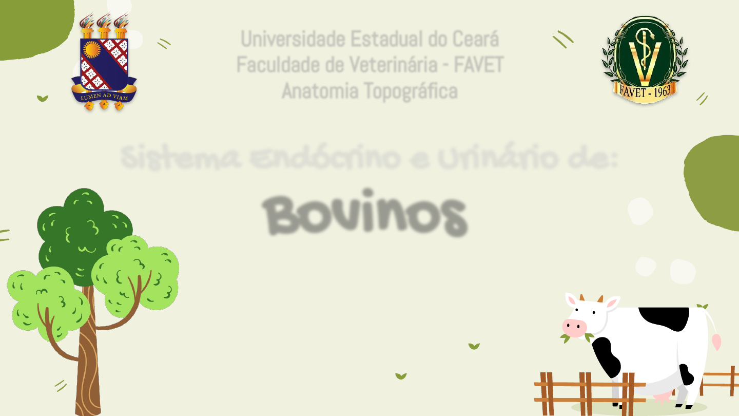 Universidade Estadual do Ceará Faculdade de Veterinária - FAVET Anatomia Topográfica Sistema Endócrino e Urinário de: Dayse Queiroz Hilda Lara Isabela Reis João Victor Rayane Araújo Vitória Nepomuceno Bovinos 02 Sistema Endócrino Glândulas: ➔ Hipófise ➔ Adrenais ● Órgãos individuais ● Subservientes ao SNC ● Produz, armazena e secreta hormônios ● Ação por meio de fluidos 03 Hipófise Formato: elipsóide Localização: fossa hipofisária abaixo do hipotálamo Hipófise Cerebelo Cérebro - Influência a outras glândulas endócrinas - Seios cavernosos e intercarvenosos - Produção de hormônios na adeno - Armazenamento e liberação pela neuro Adeno- hipófise Infundíbulo Neuro-hipófise Parte intermediária 04 Hipófise mm mm ● Influencia outras glândulas endócrinas ● Adeno: produção e secreção ● Neuro: apenas secreção Hormônios: ● STH (crescimento) ● TSH (tireóide) ● ACTH (glicocorticoides) Cortisol ● FSH (folículo) Estrógenos ● LH (luteinizante) Progesterona e testosterona ● PRL (prolactina) ● INTERMEDINA (melanócitos) ● OXI (Ocitocina) ● VASOPRESSINA (antidiurético) 05 Hipófise 06 Formato: Assimétricas e irregulares Localização: teto do abdomen, craniomedial ao rim ● Moldadas sobre vasos contíguos ● Ligadas aos vasos abdominais: - Aorta - Esquerda - Veia cava caudal - Direita (aderência em caso de deslocamento) Adrenais Hilo Medula Capsula Cortex 07 Hormônios ● Córtex: corticóides ✓ Cortisol e aldosterona ● Medula: adrenalina e noradrenalina Adrenais Sistema Urinário ➔ 2 Rins ➔ 2 Ureteres ➔ Bexiga ➔ Uretra ● Produz, armazena e excreta a urina ● Compartilha órgãos com o sistema reprodutor 08 Rim Localização: Direito: Ventral a última costela e 3º processo transverso lombar ● Ventral: fígado, pâncreas, duodeno. ● Cranial: Impressão renal do fígado. Esquerdo: Deslocado pelo rúmen → Caudal ao rim direito; Ventral a 3ª e 4ª vert. Lombar. ● Lateral: Rúmen. ● Ventral: Intestino. 09 Rim 1-ureter 2-veia renal 3-artéria renal 4-hilo Coloração: marrom-avermelhada Formato: ● Direito: elipsoide achatado ● Esquerdo: achatado no polo cranial e espessado caudalmente Superfície: ligeiramente convexa Depressão na margem medial: hilo Vascularização: ● Veia renal ● Artéria renal 10 Rim Cortex ---- ---------Cálice ------ ------ Pirâmides ----- ---------------Papila 11 Multipiramidal: superfície lobada com múltiplas pirâmides ● Divisões: Cortéx Medula ● Regiões: - Pirâmides: cada porção da medula - Papila: ápice de cada pirâmide - Cálice: local onde se encaixa a papila - Pelve: não está presente Ureter Formação: União das passagens curtas que saem dos cálices e confinam as papilas renais individuais Tubo muscular Localização: Caudalmente no espaço retroperitoneal na extensão da parede corporal dorsal. Ureter de um bovino com cálices renais (preparado de corrosão). 12 ● Formato e tamanho variáveis ● Reservatório dilatável Localização: Confinada à cavidade pélvica Vascularização: ➔ Artéria vaginal ou prostática ➔ Artérias umbilicais reduzidas Bexiga Urinária 13 ● Vesical (detrusor) Músculo: ● Formato pequeno e globular ● Repousa nos ossos pubianos ● Pregas na mucosa ● Cobertura serosa: ➔ Ligamentos vesicais laterais ➔ Ligamento vesical mediano Bexiga Urinária 14 1- Cólon 2- Útero 3- Bexiga 4- Lig. vesicais laterais 5- Lig. vesical mediano Contraída Frouxa ligação da Mucosa Vesical ● Formato de pêra ➔ Ápice ➔ Corpo intermediário ➔ Colo caudal ● 2 pregas resistem ● Trígono vesical e Crista uretral Bexiga Urinária Uretra Crista uretral Trígono vesical Óstio do ureter B 15 Ureter Dilatada Uretra Tubo que conduz a urina da bexiga para o meio externo Diferença entre os sexos: ● Macho: mais longa e curva ● Fêmea: mais curta e reta ● Uretra pélvica: presente em machos e fêmeas ● Uretra peniana: presente apenas em machos 16 Ureter Uretra Trígono da vesícula Óstio do ureter Uretra Macho ● Canaliza a urina, o sêmen e secreções seminais Localização: ● Se prolonga desde uma abertura interna no colo da vesícula urinária até uma abertura externa na extremidade do pênis. 17 Bexiga Ureter esquerdo Uretra peniana Uretra Fêmea ● Transporta exclusivamente urina Localização: ● Se projeta caudalmente no assoalho pélvico, ventral ao trato reprodutor ● Atravessa a parede da vagina em sentido oblíquo ● Se abre com o óstio externo da uretra ventralmente na união entre vagina e vestíbulo. 18 Bexiga Uretra Conclusão 19 Compreensão da anatomia dos órgãos ● Localização ● Distinção entre sexo Identificação de alterações e correlações clínicas O estudo possibilitou: Interligação entre a função das glândulas e órgãos constituintes de distintos sistemas. Organismo é uma unidade funcional única OBRIGADO!