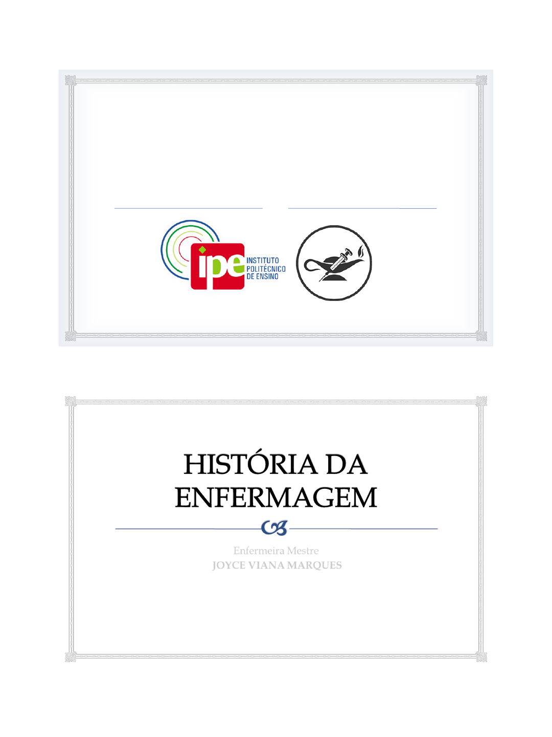 29/06/2020 1 FUNDAMENTOS DE ENFERMAGEM 1 Enfermeira Mestre JOYCE VIANA MARQUES 29/06/2020 2 "A compreensão do passado pode auxiliar o entendimento do presente" Autor desconhecido A enfermeira historiadora americana Olga Church afirma que estudantes de enfermagem que não tenham conhecimento de sua herança não estão adequadamente orientados para a profissão. 29/06/2020 3 O que é enfermagem? Quando surgiu? Origem do nome A palavra Enfermeira(o) se compõe de duas palavras do latim: “nutrix”, que significa Mãe, e do verbo “nutrire”, que tem como significados criar e nutrir. Essas duas palavras, adaptadas ao inglês do século XIX, acabaram se transformando na palavra NURSE que, traduzida para o português, significa Enfermeira. 29/06/2020 4 Doença era uma punição divina. Ex: Se a plantação não desse bons frutos é porque aquela população teria feito algo ruim e os Deuses estavam castigando. Prática de saúde baseada na pratica empírica. Eram realizadas oferendas e orações. ERA PRÉ-CRISTÃ (4000AC) As medidas terapêuticas adotadas eram: massagens, banho de água fria ou quente, purgativos, substâncias provocadoras de náuseas O papel da mulher era carregar e cuidar dos doentes durante as longas caminhadas ERA PRÉ-CRISTÃ (4000AC) 29/06/2020 5 Domínio do Império Greco Romano; Cultura clássica; O cuidar na antiguidade era praticado somente no círculo familiar. Na Grécia e Roma antiga, os deuses eram responsabilizados por influenciar a cura e quem cuidava dos doentes eram as mulheres da nobreza. Esse tipo de trabalho, com o passar dos tempos, foi relegado aos escravos e às mulheres camponesas IDADE ANTIGA Com o advento do cristianismo, as mulheres que cuidavam dos enfermos passam a ter um maior reconhecimento e respeito, dando início à Ordem das Diaconisas. IDADE ANTIGA 29/06/2020 6 Mesmo assim, em várias partes do mundo, os homens ainda eram considerados mais capacitados para o cuidar. Na Índia, as mulheres eram consideradas impuras. Somente os homens tinham permissão para realizar massagens nos enfermos, dar banhos e ajudar a caminhar. E na Arábia Saudita eram consideradas incapacitadas para cuidar dos enfermos Hipócrates -> A prática de saúde, antes mística passa a ser baseada na experiência, no conhecimento da natureza, no raciocínio lógico limitada, entretanto, pela ausência quase total de conhecimentos anatomo- fisiológicos. IDADE ANTIGA Reconheceu doenças, tais como: tuberculose, malária, histeria, neurose, luxações e fraturas. Seu princípio fundamental na terapêutica consistia em “não contrariara natureza, porém auxilia-la a reagir.” Utilizava como tratamento: massagens, banhos, ginásticas, dietas, sangrias, ventosas, vomitórios, purgativos e calmantes, ervas medicinais e medicamentos minerais. IDADE ANTIGA 29/06/2020 7 Feudalismo; divisão de classes em nobres/ clero/ camponeses; Absolutismo; mercantilismo, cristianismo ... IDADE MÉDIA (V - XV) Esta época corresponde ao aparecimento da Enfermagem como prática leiga, desenvolvida por religiosos A abnegação, o espírito de serviço, a obediência e outros atributos que dão à Enfermagem, não uma conotação de prática profissional, mas de sacerdócio. IDADE MÉDIA (V - XV) 29/06/2020 8 Na idade média, com o declínio dos grandes impérios, houve o fortalecimento da religiosidade, a ascensão da igreja católica. Período que ficou marcado por grandes epidemias. IDADE MÉDIA (V - XV) 29/06/2020 9 A doença era vista e pregada pela igreja como um castigo de Deus, redenção dos pecados ou, no caso dos distúrbios mentais, como uma possessão demoníaca, por isso, os cuidados para com os doentes foi adotado pela igreja como uma prática de caridade. O tratamento do enfermo era pautado em exorcismos, penitências e orações para afastar os maus espíritos, para a purificação da alma e as funções de sacerdotes e médico eram acumuladas pelos clérigos. IDADE MÉDIA (V - XV) 29/06/2020 10 29/06/2020 11 29/06/2020 12 A igreja considerava as ciências, em especial, a medicina, como blasfêmia perante o evangelho, por isso não haviam pesquisas científicas. As práticas médicas eram consideradas desnecessárias, as medidas terapêuticas foram substituídas pelo conforto espiritual, portanto, a morte era considerada uma libertação do sofrimento. IDADE MÉDIA (V - XV) Os médicos tinham pouco entendimento da anatomia humana e menos ainda sabiam sobre técnicas de anestesia e assepsia. Muitas vezes, as infecções eram mais mortais que a doença original. Para aliviar a dor, os pacientes eram submetidos a mais sofrimentos. 29/06/2020 13 A catarata era tratada por “procedimento cirúrgico”. O cirurgião inseria uma faca ou de uma agulha pela córnea, forçando as lentes do olho até o fundo do órgão. Depois, uma seringa era usada para extrair por sucção a catarata. 29/06/2020 14 Quem tinha hemorroidas passava por um sofrimento exponencial. O tratamento era queima-las com ferro quente. Há até uma história sobre um monge que, sofrendo com suas hemorroidas enquanto trabalhava no jardim, sentou se em uma pedra que, milagrosamente, o curou do problema. A bexiga obstruída ou retenção urinária era muito comum, consequência da sífilis e de outras doenças venéreas em uma época. Para sanar o mal ,cateteres metálicos um tubo de metal, era enfiado na bexiga através da uretra . 29/06/2020 15 Os médicos medievais acreditavam que a maioria das doenças do homem eram causadas pelo excesso de fluido no corpo [esses fluidos eram chamados humores]. A cura consistia em remover o excesso de fluido drenando grandes quantidades de sangue. Dois métodos eram usados para sangrar os pacientes: sanguessugas ou corte de uma veia Ainda no período medieval, as ordens monásticas criaram os primeiros hospitais, que abrigavam e também excluíam os doentes e os pobres. O hospital, já negligenciado, passa a ser um insalubre depósito de doentes, onde homens, mulheres e crian