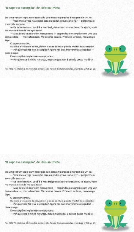 QUESTIONÁRIO – LEITURA E PRODUÇÃO DE TEXTOS – AULA 04 – MÚSICA · Leia o texto abaixo: O gênero textual representado pelo texto é: Resposta Marcada : Fábula. PONTUAÇÃO TOTAL: 1PONTUAÇÃO OBTIDA 1 · O sapo e o escorpião Embora seja um texto preponderantemente narrativo, é possível encontrar outras sequências discursivas no texto “O sapo e o escorpião”. A respeito disso, o tipo textual que está corretamente associado ao exemplo é a opção: Resposta Marcada : Injunção: “Você me carrega nas costas para eu poder atravessar o rio?” PONTUAÇÃO TOTAL: 1PONTUAÇÃO OBTIDA 1 · O sapo e o escorpião Qual das frases abaixo poderia sintetizar a moral da história “O sapo e o escorpião”? Resposta Marcada : A ignorância é o pior de todos os males. PONTUAÇÃO TOTAL: 1PONTUAÇÃO OBTIDA 0 · Quanto aos tipos de discurso, no fragmento abaixo é possível identificar: “E o escorpião simplesmente respondeu: – Por que esta é minha natureza, meu amigo sapo. E eu não posso mudá-la.” Resposta Marcada : Discurso direto e indireto. PONTUAÇÃO TOTAL: 1PONTUAÇÃO OBTIDA 1 · O Sapo e o escorpião Quanto à estrutura textual, o item que faz uma relação equivocada entre a passagem e a parte na narrativa do texto “O sapo e o escorpião” é: Resposta Marcada : A complicação – do 3º ao 7º parágrafo. PONTUAÇÃO TOTAL: 1PONTUAÇÃO OBTIDA 1