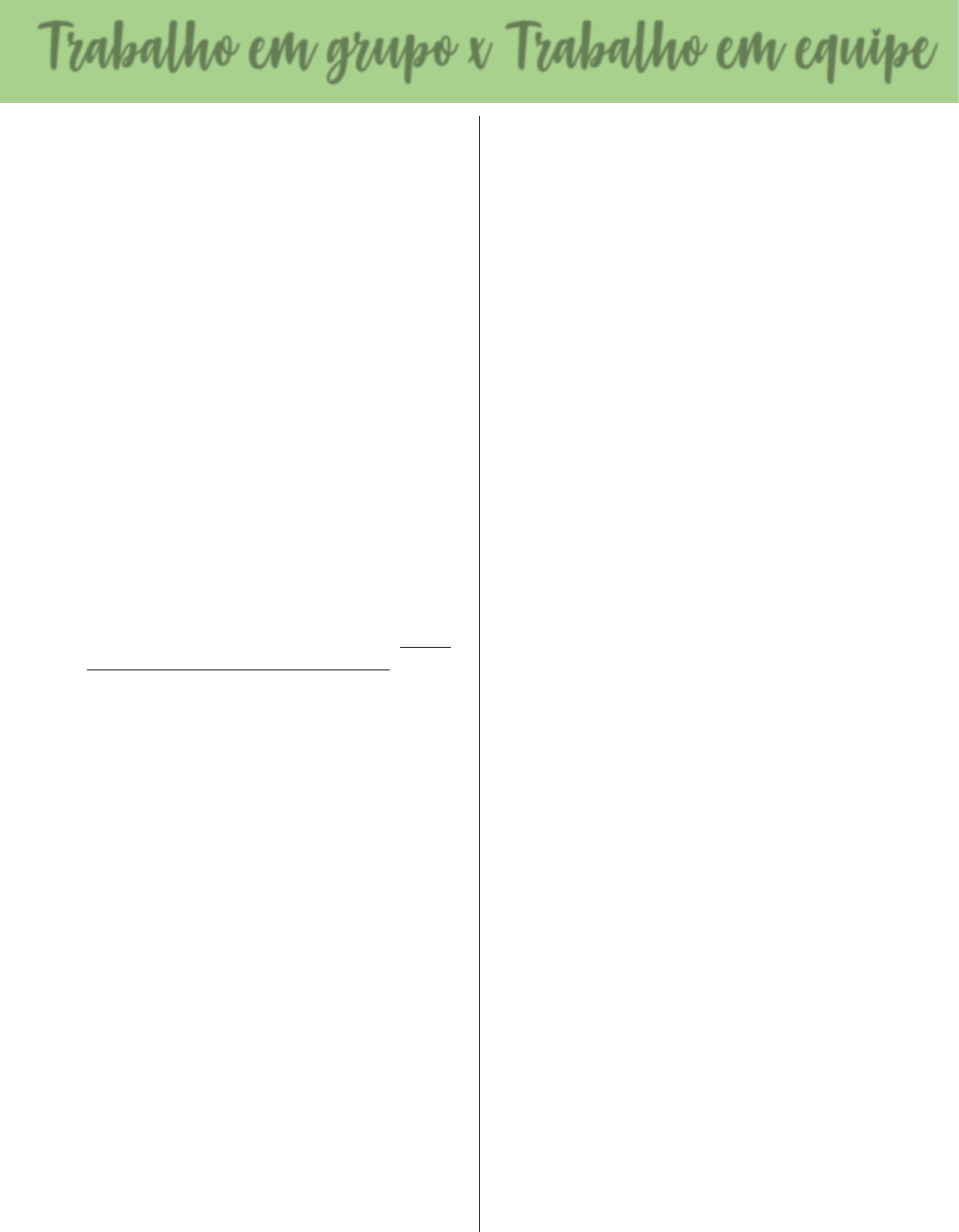 Trabalho em grupo Trabalho em grupo: alunos trabalhando juntos em grupos pequenos de modo que todos possam participar de uma atividade com tarefas claramente atribuídas. Além disso, é esperado que os alunos desempenhem suas tarefas sem supervisão direta e imediata do professor. Trabalho em grupo não é a mesma coisa que agrupamento por habilidade, no qual o professor divide a sala por critério acadêmico para que possa ensinar para grupos mais homogêneos. (COHEN; LOTAN, 2017) A filosofia vigente na década de 1970, incentivou-se a estruturação e utilização da aprendizagem cooperativa – trabalho de estudantes em pequenos grupos heterogêneos que trocam informações e compartilham materiais, com papéis previamente definidos - como um recurso que fomenta rendimento acadêmico, interdependência positiva, responsabilidade individual e de grupo, interação estimuladora, competências sociais, além de aumento de autoestima. (CONCEIÇÃO; MORAES, 2018) Quando a professora propõe aos alunos uma atividade em grupo e permite que eles se esforcem sozinhos e cometam erros, ela delega autoridade. Essa é a primeira característica-chave do trabalho em grupo. Delegar autoridade em uma atividade é fazer com que os alunos sejam responsáveis por partes específicas de seu trabalho; os alunos estarão livres para cumprir suas tarefas da maneira que decidirem ser a melhor, mas ainda são responsabilizados pela entrega do produto final à professora. Delegar autoridade não significa que o processo de aprendizagem está sem controle; a professora mantém controle por meio de avaliação do produto final do grupo e do processo pelo qual os alunos passaram para chegar àquele produto. (COHEN; LOTAN, 2017) Uma segunda característica-chave do trabalho em grupo é a de que, em algum nível, os participantes precisam uns dos outros para completar a atividade; eles não conseguem fazer todas as partes sozinhos. Os alunos assumem o papel de professores quando sugerem o que os outros devem fazer, quando ouvem o que os outros estão dizendo e quando decidem como finalizar o trabalho, dado o tempo e os recursos limitados estabelecidos pelo instrutor. (COHEN; LOTAN, 2017) Alunos que trabalham em grupo falam entre si sobre sua atividade. Eles fazem perguntas, explicam, fazem sugestões, criticam, ouvem, concordam, discordam e tomam decisões coletivas. A interação também pode ser não verbal, como apontar, mostrar como fazer, acenar com a cabeça, fazer careta ou sorrir. Esse processo de interação de grupo pode ser muito interessante para os alunos. Alguns, que em geral fariam de tudo menos aquilo que lhes foi pedido, quando são envolvidos no trabalho em grupo, passam a se engajar ativamente em seu trabalho e se mantêm nele por meio da ação do grupo. Existem inúmeras razões para isso. Interações cara a cara demandam respostas ou, pelo menos, um comportamento mais atento. Além disso, os alunos se importam com a avaliação de seus colegas; frequentemente, não se recusam a participar e não querem decepcionar o grupo. (COHEN; LOTAN, 2017) Apesar do trabalho em grupo ter potencial para apoiar o aprendizado, este mesmo tipo de trabalho, se feito de maneira não estruturada, pode acarretar uma série de problemas. Não necessariamente os estudantes e os próprios adultos sabem como trabalhar em conjunto de forma exitosa, por isso, é necessário aprender como se trabalhar assim. Esses problemas podem ser superados com o planejamento adequado de atividades e por meio da preparação dos próprios alunos. (COHEN; LOTAN, 2017) O trabalho em grupo é uma técnica eficaz para atingir certos tipos de objetivos de aprendizagem intelectual e social. É excelente para o aprendizado conceitual, para a resolução criativa de problemas e para o desenvolvimento de proficiência em linguagem acadêmica. Socialmente, melhora as relações intergrupais, aumentando a confiança e a cordialidade. Ensina habilidades para atuar em equipe que podem ser transferidas para muitas situações, sejam escolares ou da vida adulta. O trabalho em grupo é também uma estratégia para enfrentar problemas comuns na condução da sala de aula, como manter os alunos envolvidos com sua atividade. Mais importante ainda, o trabalho em grupo torna mais acessíveis as tarefas de aprendizagem para um número maior de alunos em salas de aula com grande diversidade de competências acadêmicas e proficiência linguística. O trabalho de grupo produtivo aumenta e aprofunda a oportunidade de aprender conteúdos e desenvolver a linguagem e, portanto, tem o potencial para formar salas de aula equitativas. (COHEN; LOTAN, 2017) Trabalho em equipe Umas das mudanças mais significativas de nossa época é a passagem da ação individual para o trabalho em grupo. Trabalho em grupo x Trabalho em equipe @jumorbeck No mundo de hoje podemos identificar vários tipos de grupos trabalhando nas mais diferentes situações. Alguns conseguem tornar-se equipes e outros permanecem apenas como grupos. (PIANCASTELLI, FARIA, SILVEIRA, 2000) A ideia de equipe advém da necessidade histórica do homem de somar esforços para alcançar objetivos que, isoladamente, não seriam alcançados ou seriam de forma mais trabalhosa ou inadequada. (PIANCASTELLI, FARIA, SILVEIRA, 2000) De fato, existe apenas uma única pergunta-chave a fazer a si próprio, quando estiver tentando decidir se seu grupo constitui ou não uma equipe: Será que todos os membros de meu grupo compartilham, pelo menos, de um objetivo que só pode ser atingido pelo esforço conjunto de todos? O objetivo ou objetivos comuns são a diferença entre um grupo e uma equipe. (HARDINGHAM, 2000) Exemplo de equipe: o time de futebol, os componentes desta equipe têm objetivos comuns – marcar gols, vencer jogos -, habilidades diferentes (o goleiro, o beque, o atacante), uma coordenação (o técnico) e um plano de trabalho (o esquema tático); (PIANCASTELLI, FARIA, SILVEIRA, 200) Quando os grupos sã