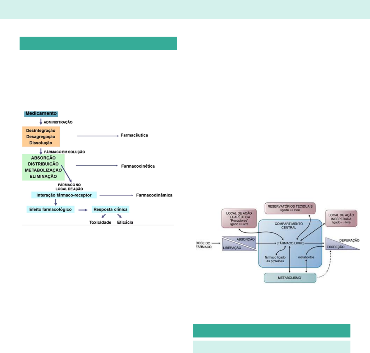 FARMACOLOGIA EAD Camilla Lavadores – Turma XX FARMACOCINÉTICA Professora Paula Lima do Carmo – 01 de julho de 2021 INTRODUÇÃO À FARMACOLOGIA A farmacologia se divide em duas grandes áreas: a farmacocinética – que é como o nosso corpo reage sobre determinado fármaco, seus processos de absorção, distribuição, metabolização e eliminação – e a farmacodinâmica – como o fármaco age no organismo diretamente, em quais proteínas, enzimas, etc. Denominamos o composto, o fármaco de medicamento (Ex: dipirona – comercializada na forma de gotas, comprimido, xarope). Normalmente não usamos a palavra droga, pois dá a sensação que é uma substancia ilícita. Se for administrado na forma de comprimido, o medicamento passa por um processo de desintegração, desagregação e dissolução, como caracterizado na imagem. O processo de absorção nada mais é que a chegada desse fármaco na corrente sanguínea. Uma vez que ele já esteja nela, ele vai ser distribuído para todos os tecidos (os do alvo no tratamento farmacológico e também em outros tecidos). O processo de metabolização ocorre através de enzimas onde o fígado constitui o principal órgão dessa ação. Posteriormente, estudaremos o processo de eliminação (principalmente pela urina, mas também fezes, suor, ar expirado). Os processos da farmacocinética são divididos apenas didaticamente. Às vezes uma parte do fármaco está sendo dissolvida, enquanto a outra parte já está sendo metabolizada, etc. Uma vez que o fármaco esteja no seu local de ação, ele irá interagir com o receptor (interação fármaco-receptor) gerando o efeito farmacológico e então uma resposta clínica. A partir dela, observamos a eficácia da medicação e uma possível toxicidade (efeitos colaterais não pretendidos). Como o fármaco foi administrado, ele precisa passar por esses processos de absorção para que chegue no sangue. No sangue em si o fármaco pode se encontrar ligado a proteínas plasmáticas (onde permanece circulando e não consegue se ligar a receptores, isto é, agir no tecido) e/ou em fração livre (onde efetivamente terá acesso aos tecidos). Os tecidos inclusos são: os que possuem ação terapêutica, os tecidos com reação inesperada e os reservatórios teciduais, que acumulam esse fármaco (o principal, por exemplo, é o tecido adiposo = o que pode implicar em dificuldades no tratamento de pacientes obesos). A fração livre dos fármacos também terá acesso aos órgãos de metabolização ou biotransformação para que sejam gerados metabolitos e estes sejam excretados. Podemos ter, também, a excreção do fármaco sem passar pelo processo de metabolização, isto é, excreção do fármaco na forma in natura. Os fármacos vão atravessar as células por meio dos transportes celulares já estudados: transporte ativo, difusão passiva, difusão facilitada, junções lacunares, etc. FATORES QUE INFLUENCIAM NA ABSORÇÃO AS PROPRIEDADES QUÍMICAS DO FÁRMACO - Natureza química: os fármacos ou são ácidos ou bases fracas. - Lipossolubilidade/hidrossolubilidade: as células são compostas por uma bicamada lipídica e para que o fármaco consiga ultrapassar essa MP, ele precisa se encontrar na forma lipossolúvel. - Grau de ionização do fármaco: é correlacionado o pKa do fármaco e o pH do meio. - Tamanho das partículas e formulação farmacêutica: temos fármacos de forma liquida e na forma de comprimido, FARMACOLOGIA EAD Camilla Lavadores – Turma XX onde a forma líquida não precisa passar pelo processo de dissolução. FATORES FISIOLÓGICOS - Ph local e fluxo sanguíneo no sítio de absorção - Tamanho da área de superfície disponível para absorção - Tempo de contato com a superfície de absorção - Espessura da membrana do tecido - Eliminação pré-sistêmica = efeito do metabolismo de primeira passagem (antes dele ser absorvido, será metabolizado e eliminado) FATORES RELACIONADOS AO PACIENTE - Idade: o bebê, por exemplo, não consegue tomar um comprimido (fármaco precisa estar na forma líquida) - Doenças: em pacientes com vômito, por exemplo, não se indica fármaco por via oral, pois esse será eliminado - Uso de outros medicamentos: interação medicamentosa FORMAS DE APRESENTAÇÃO DE FÁRMACOS SÓLIDAS: pó, cápsulas, comprimidos, drágeas ou comprimido revestido, comprimido efervescente, preparações de liberação controlada, granulados, pastilhas, pílula, supositório, óvulos, adesivos. ➔ Não podemos alterar essa formulação, isto é, abrir a cápsula e tomar só o conteúdo ou esfarelar o comprimido e tomar o pó, pois os fármacos foram pensados e estruturados tendo em vista a ação com o tempo. LÍQUIDAS: soluções, injeções, infusões, xaropes, emulsões, suspensões, colírios, loções. SEMISSÓLIDAS: pomadas, pastas, creme, geleia, gel. GASOSAS: aerossóis, pulveirizantes. TAMANHO DAS PARTÍCULAS, GRAU DE SOLUBILIDADE E FÓRMULA MOLECULAR Se triturarmos o comprimido estaremos acelerando o processo de absorção e a chegada na corrente sanguínea, ou seja, alterando o processo do fármaco. Os fármacos podem ser ácidos ou bases fracas. Dependendo do pH que se encontram, eles vão formar moléculas ionizadas ou não ionizadas. As moléculas não ionizadas são preferenciais pois são mais lipossolúveis e, com isso, capazes de se difundir pela membrana celular. O que vai determinar se o fármaco vai estar na forma mais ionizada ou não ionizada? O pKa do fármaco e o ph do meio. O pKa é uma propriedade particular de cada fármaco e é um valor numérico. Exemplo: o pKa do fármaco é 6. Se o fármaco for para um meio de ph 6, ele se desintegrará 50% em moléculas ionizadas e 50% em não ionizadas. Essa relação advém da equação de Henderson-Hasselbach. Assim, avaliando essas equações chegamos a uma seguinte conclusão: - Os fármacos ácidos vão ser absorvidos mais facilmente quando o ph também estiver ácido, porque calculando na equa