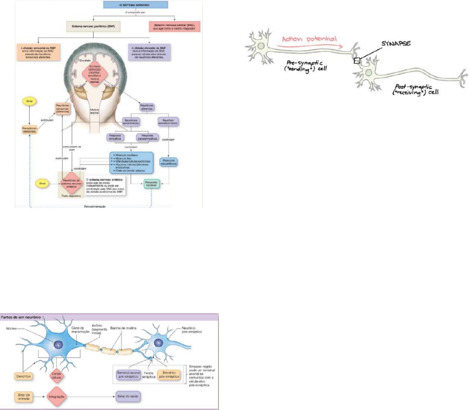 Sinapses Esse resumo está baseado na aula e nos slides da Profª Aletheia Lacerda. Esses processos descritos na imagem são de suma importância para a compreensão desse tema. SINAPSE: Região especializada de contato que permite a comunicação e a transmissão de mensagens entre neurônios com outros neurônios, células musculares e glândulas. Vale ressaltar que o PA se inicia no cone de implantação. As três estruturas que compõem uma sinapse: · Terminal axonal pré sináptico; · Fenda Sináptica; · Membrana pós sináptica; Transmissão sináptica: A maior parte da informação transmitida para o SNC é na forma de potenciais de ação (impulsos elétricos) Tipos de Neurônios Sinapse Elétrica: · Comunicação direta entre duas células,comunicação muito próxima. · Junção de 6 conexinas, formando o conéxon · Dois conéxons formam o canal intercelular e muitos desses canais formam uma junção comunicante, os citoplasmas se comunicam. · Espaço muito pequeno entre eles,as junções comunicantes formam canais e os citoplasmas se comunicam,elas podem trocar materiais citosólicos, passagem do potencial de ação de uma célula pra a outra. · Vantagem desse tipo de sinapse: A velocidade de transmissão é muito rápida. · Para haver um potencial de ação tem que haver uma despolarização. · As despolarizações das células auto excitáveis (no coração) se propagam rapidamente. Sinapse química No terminal pré sináptico há a presença de bastantes mitocôndrias, presença de neurotransmissores que ficam armazenados em vesículas, há bastantes canais de cálcio dependente de voltagem na membrana pré sináptica. · Na membrana pós sináptica existem receptores: ionotrópicos e metabotrópicos: · Tipo de canal iônico e controlado por ligantes – Ligação de um ligante químico: · Cátion: receptor nicotínico (é um tipo de receptor cujo o ligante é o acetilcolina- Receptor para a acetil colina,ele se encontra em célula muscular esquelética) · Quando o canal se abre há a passagem de sódio (Na+) – Cátion– Acetilcolina se liga nesse receptor e abre receptor nicotínico - com a entrada de Na+ há a despolarização. · Canal aniônico – GABA,na ligação desse receptor há a entrada de cloreto,sendo assim,há a hiperpolarização · Toda reposta mediada por canal iônico é extremamente rápido. · Tem que ter um ligante químico(neurotransmissor) intermediando a SINAPSE QUIMICA · Nesse tipo de sinapses existem respostas rápidas e lentas. Na elétrica existem apenas as rápidas. · Sempre tem que ter um potencial de ação chegando ao terminal pré sináptico (lembrando que ele viajou todo o neurônio). O canal de cálcio só abre se o potencial de ação vier,para abrir esses canais dependentes de voltagem.Esse canal de cálcio impulsiona as vesículas sinápticas para que elas liberem os neurotransmissores,se fundindo com a membrana,ocorrendo a exocitose. · Depois disso, os neurotransmissores se ligam a um receptor alvo presente na célula pós sináptica ou célula vizinha. Ao ligar no receptor alvo ele gera uma resposta. · Receptores metabotrópico- existe toda uma cascata intracelular- é menos rápido. · Sistema de segundos mensageiros; · Ex: receptores muscarínicos, receptores adrenérgicos, receptores para fatores de crescimento. Existem diferenças claras entre os dois tipos de sinapses. Como podemos ver no quadro abaixo: ( Sinapse Física Sinapse Química ) Junções comunicantes; Envolve na liberação de neurotransmissores excitatórios ou inibitórios. O potencial de ação é rapidamente transmitido de uma célula para outra; Célula pós sináptica contém receptores ionotrópicos ou metabotrópicos; Sinal elétrico é bidirecional; Sinal químico é unidirecional Permite a coordenação d atividade de células interconectadas; Os sinais químicos são direcionados para alvos específicos Existem principalmente no SNC; Respostas mais lentas. Respostas mais rápidas; Sinapse química – Etapas da Neurotransmissão 1. Um potencial de ação despolariza o terminal axonal; O potencial chega ao terminal axonal. 2. A despolarização abre canais de Ca+2 dependentes de voltagem,e o Ca+2 entra na célula. 3. A entrada de cálcio inicia a exocitose do conteúdo das vesículas sinápticas. 4. O neurotransmissor difunde-se através da fenda sináptica e se liga os receptores na célula pós sináptica. 5.A ligação do neurotransmissor inicia uma reposta na célula pós sináptica. Término da ação dos neurotransmissores 1. Os neurotransmissores podem retornar aos terminais axonais para reutilização ou para serem transportadas para as células da glia. 2. As enzimas inativam os neurotransmissores 3. Os neurotransmissores podem difundir-se pra fora da fenda sináptica por difusão. 4. As vesículas e neurotransmissores pequenos normalmente são reciclados. Proteínas SNARE e fusão vesicular Precisa se fundir e fixar, e passam neurotransmissores - entrada de cálcio para ter o entrelaçamento das proteínas e ter a fusão. Eventos elétricos durante a excitação e inibição neuronal O potencial excitatório pós sináptico é ocasionado pela distribuição dos íons sódio, potássio e cloreto através da membrana do corpo celular neuronal. A: Neurônio em repouso, com potencial intraneuronal normal de −65 milivolts. B: Neurônio no estado excitado, com potencial intraneuronal menos negativo (−45 milivolts) C: Neurônio no estado inibido, com potencial intraneuronal mais negativo (−70 milivolts). Se o Na+ entra no terminal pós-sináptico através dos canais abertos, a membrana despolariza. A mudança resultante no potencial de membrana (Vm), registrada pelo microeletrodo na célula, é o PEPS. PEPS · Secreção de neurotransmissor excitatório · Despolarização · PEPS: potencial menos negativo gerado na célula pós-sináptica, causado pelo influxo de sódio · Aproxima o potencial da membrana ao limiar de excitaç