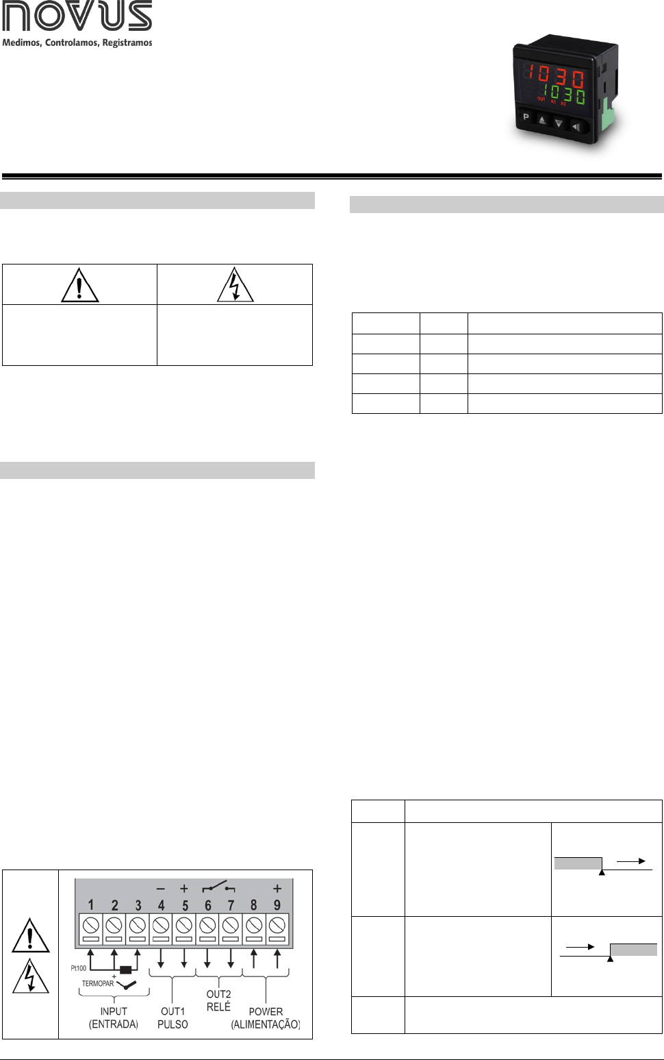 NOVUS PRODUTOS ELETRÔNICOS LTDA. RS: (51) 3323-3600 SP: (11) 3097-8466 Campinas/SP: (19) 3372-7992 PR: (41) 3244-0514 1/4 Controlador N1030 CONTROLADOR DE TEMPERATURA - MANUAL DE INSTRUÇÕES – V1.0x ALERTAS DE SEGURANÇA Os símbolos abaixo são usados no equipamento e ao longo deste manual para chamar a atenção do usuário para informações importantes relacionadas com segurança e o uso do equipamento. CUIDADO: Leia o manual completamente antes de instalar e operar o equipamento CUIDADO OU PERIGO: Risco de choque elétrico Todas as recomendações de segurança que aparecem neste manual devem ser observadas para assegurar a segurança pessoal e prevenir danos ao instrumento ou sistema. Se o instrumento for utilizado de uma maneira distinta à especificada neste manual, as proteções de segurança do equipamento podem não ser eficazes. INSTALAÇÃO / CONEXÕES O controlador deve ser fixado em painel, seguindo a seqüência de passos abaixo: • Fazer um recorte de 46 x 46 mm no painel; • Retirar a presilha de fixação do controlador; • Inserir o controlador no recorte pelo frontal do painel; • Recolocar a presilha no controlador pressionando até obter uma firme fixação. RECOMENDAÇÕES PARA A INSTALAÇÃO • Condutores de sinais de entrada devem percorrer a planta separados dos condutores de saída e de alimentação, se possível em eletrodutos aterrados. • A alimentação dos instrumentos eletrônicos deve vir de uma rede própria para instrumentação. • É recomendável o uso de FILTROS RC (supressor de ruído) em bobinas de contactoras, solenóides, etc. • Em aplicações de controle é essencial considerar o que pode acontecer quando qualquer parte do sistema falhar. Os dispositivos internos do controlador não garantem proteção total. CONEXÕES ELÉTRICAS A disposição dos recursos no painel traseiro do controlador é mostrada na Fig. 01: Fig. 01 - Conexões das entradas, saídas e alimentação RECURSOS ENTRADA DE SINAL (INPUT) O tipo de entrada a ser utilizado pelo controlador é definido na configuração do equipamento. A Tabela 01 apresenta as opções de entrada disponíveis ao usuário, dentre as quais uma deve ser selecionada durante a configuração do controlador. TIPO CÓDIGO FAIXA DE MEDIÇÃO Termopar J Tc j Faixa: -110.0 a 950.0 °C (-166.0 a 1742 °F) Termopar K Tc k Faixa: -150.0 a 1370 °C (-238.0 a 2498 °F) Termopar T Tc t Faixa: -160.0 a 400.0 °C (-256.0 a 752.0 °F) Pt100 Pt Faixa: -200.0 a 850.0 °C (-328.0 a 1562 °F) Tabela 01 - Tipos de entradas SAÍDAS O controlador possui duas saídas. Estas saídas podem ser configuradas pelo usuário para operarem como Saída de Controle ((trl) ou Saída de Alarme (al). SAÍDA OUT1 - Saída Pulso de Tensão elétrica, 5 Vcc / 25 mA SAÍDA OUT2 - Saída Relé SPST-NA SAÍDA DE CONTROLE ((TRL) A Saída de Controle do processo pode operar em modo ON/OFF ou em modo PID. Para operar em modo ON/OFF, o valor definido no parâmetro PB deve ser 0.0. Com valores diferentes de zero no parâmetro PB, o controlador operar em modo PID. Os valores para os parâmetros do PID podem ser definidos automaticamente com a auxilio da Sintonia Automática (ATvN). SAÍDA DE ALARME (AL) O controlador possui um alarme que pode ser direcionado para quaisquer das saídas. O alarme quando habilitado, pode ser configurado para operar com uma das diferentes funções descritas na Tabela 02. off Alarme desligado. lo Alarme de Valor Mínimo Absoluto. Liga quando o valor da PV (temperatura) estiver abaixo do valor definido pelo Setpoint de alarme (SPAL). SPAL PV ki Alarme de Valor Máximo Absoluto. Liga quando o valor da PV estiver acima do valor definido pelo Setpoint de alarme. SPAL PV dif Alarme Diferencial. Nesta função, SPAL representa um erro (diferença) entre PV e SP de CONTROLE. Controlador N1030 NOVUS PRODUTOS ELETRÔNICOS LTDA. RS: (51) 3323-3600 SP: (11) 3097-8466 Campinas/SP: (19) 3372-7992 PR: (41) 3244-0514 2/4 SP PV SP + SPAL SP – SPAL SP PV SP – SPAL SP + SPAL SPAL positivo SPAL negativo difl Alarme Diferencial Mínimo. Dispara quando o valor de PV estiver abaixo do ponto definido por SP-SPAL. SP PV SP – SPAL SP PV SP – SPAL SPAL positivo SPAL negativo difk Alarme Diferencial Máximo. Dispara quando o valor de PV estiver acima do ponto definido por SP+SPAL. SP PV SP + SPAL SP PV SP + SPAL SPAL positivo SPAL negativo ierr Alarme de Sensor Aberto (Sensor Break Alarm). Atua quando a Entrada apresenta problemas como sensor rompido, mal conectado, etc. Tabela 02 – Funções de alarme BLOQUEIO INICIAL DE ALARME A opção de bloqueio inicial inibe o acionamento do alarme caso exista uma condição de alarme no processo no momento em que o controlador é ligado. O alarme somente é habilitado após o processo passar por uma condição de não-alarme. O bloqueio inicial é útil, por exemplo, quando um dos alarmes está configurado como alarme de valor mínimo, o que pode causar o acionamento do alarme logo na partida do processo; comportamento muitas vezes indesejado. O bloqueio inicial não é válido para a função ierr (Sensor Aberto). OFFSET Recurso que possibilita ao usuário realizar pequeno ajuste na indicação de PV. Permite corrigir erros de medição que aparecem, por exemplo, na substituição do sensor de temperatura. OPERAÇÃO O painel frontal do controlador, com seus elementos, pode ser visto na Fig. 02: Fig. 02 - Identificação do painel frontal Display: Apresenta a variável medida, símbolos dos parâmetros de configuração e seus respectivos valores/condições. Sinalizador TUNE: ligado enquanto o controlador está em processo de sintonia. Sinalizador OUT: sinaliza o estado instantâneo da(s) saída(s) de controle. Sinalizadores A1 e A2: sinalizam a ocorrência de uma condição de alarme. Tecla P: Tecla utilizada para avançar aos sucessivos parâmetros e ciclos de parâmetros. Tecla de incremento e Tecla de Decremento: Estas teclas permitem alterar os valores dos parâmetros. T