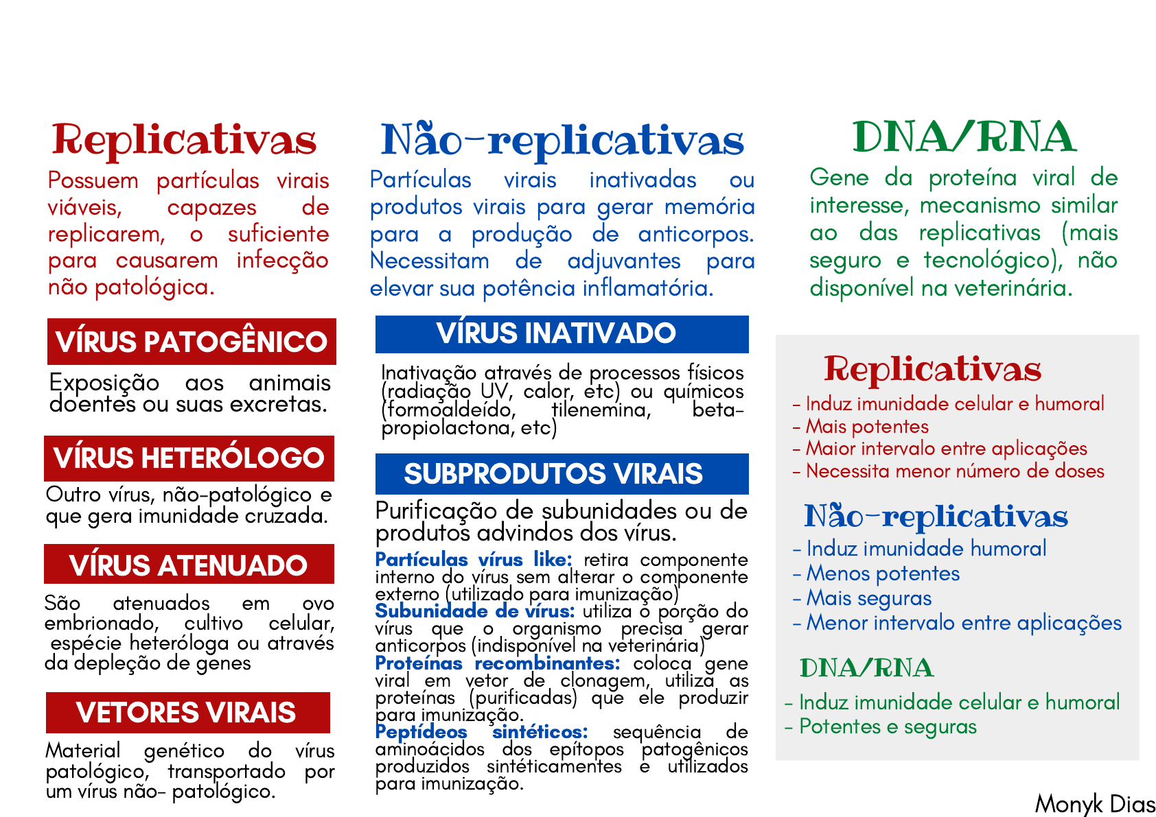 Classificação das vacinas virais Possuem partículas virais viáveis, capazes de replicarem, o suficiente para causarem infecção não patológica. Replicativas Não-replicativas DNA/RNA Partículas virais inativadas ou produtos virais para gerar memória para a produção de anticorpos. Necessitam de adjuvantes para elevar sua potência inflamatória. Gene da proteína viral de interesse, mecanismo similar ao das replicativas (mais seguro e tecnológico), não disponível na veterinária. VÍRUS PATOGÊNICO VÍRUS HETERÓLOGO VÍRUS ATENUADO VETORES VIRAIS Exposição aos animais doentes ou suas excretas. Outro vírus, não-patológico e que gera imunidade cruzada. São atenuados em ovo embrionado, cultivo celular, espécie heteróloga ou através da depleção de genes Material genético do vírus patológico, transportado por um vírus não- patológico. VÍRUS INATIVADO Inativação através de processos físicos (radiação UV, calor, etc) ou químicos (formoaldeído, tilenemina, �beta- propiolactona, etc) SUBPRODUTOS VIRAIS Purificação de subunidades ou de produtos advindos dos vírus. Partículas vírus like: retira componente interno do vírus sem alterar o componente externo (utilizado para imunização) Subunidade de vírus: utiliza o porção do vírus que o organismo precisa gerar anticorpos (indisponível na veterinária) Proteínas recombinantes: coloca gene viral em vetor de clonagem, utiliza as proteínas (purificadas) que ele produzir para imunização. Peptídeos sintéticos: sequência de aminoácidos dos epítopos patogênicos produzidos sintéticamentes e utilizados para imunização. Replicativas - Induz imunidade celular e humoral - Mais potentes - Maior intervalo entre aplicações - Necessita menor número de doses Não-replicativas - Induz imunidade humoral - Menos potentes - Mais seguras - Menor intervalo entre aplicações DNA/RNA - Induz imunidade celular e humoral - Potentes e seguras Monyk Dias