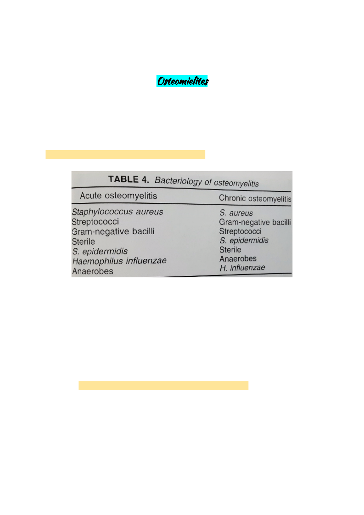 AFP - Thayná Martins Osteoa�trite� � �steomielite� Osteomielites - Acometimento inflamatório do osso esponjoso e cortical, além da medula óssea - Clínica: sintomas podem ser vagos em adultos, pode cursar com febre e dor por meses - Crianças apresentam irritabilidade por causa da dor, febre e sintomas/sinais localizatórios (vermelhidão, edema..) - Principais agentes etiológicos: bactérias - Fungos, parasitas também pode causar osteomielite - 10% de osteomielite aguda cronificam - Osteomielite aguda predominam neutrófilos, já na Osteomielite crônica há sinais de reparo, fibrose, exsudato de linfocitos, macrófagos.. Vias de entrada desses agentes: 1. Traumática: fratura que expõe o osso, manipulação cirúrgica, biópsia ósseas, colocação de prótese - Inoculação direta 2. Contiguidade: infecção de pele/partes moles levando o agente para o osso; - Pacientes diabéticos possuem um grande risco (infecção de pele > isquemia > necrose > infecção do tecido ósseo por contiguidade) 3. Hematogênica: ossos longos são os mais acometidos (tíbia proximal, fêmur distal, tíbia distal..) - Fatores predisponentes da osteomielite hematogênica: - Trauma - Lesões de pele, articulações com disseminação para a circulação - Infecções do TGI, TU.. 1 AFP - Thayná Martins - Endocardite bacteriana - Leucopenia (risco maior de infecções) - Queimaduras - Iatrogênico (ex. punção venosa profunda) - Complicações da gravidez - Anemia falciforme (S. aureus, salmonella) - Terapia imunossupressora - Hemodiálise - Capilares da região metafisária é o primeiro local acometido pela infecção; é onde o fluxo fica mais lento (ver imagem) Local comum de abscesso ósseo por disseminação hematogênica; pus no espaço entre a cortical e o periósteo Reação periosteal (aspecto semelhante de lesões neoplásicas agressivas > necessidade de biópsia); tumefação de partes moles fora da lesão (necessidade de biópsia guiada radiologicamente) 2 AFP - Thayná Martins Osteomielite purulenta aguda - Mais comum em crianças e adolescentes - Lesão mal delimitada, extensa, reação periosteal - Sinais e sintomas: febre, mal estar, calafrios, leucócitos, dor, rubor e tumefação de partes moles adjacentes - Hemocultura positiva em 60% dos casos - Mais comum em ossos longos - Agente etiológico: Estafilococos coagulase positiva (80 a 90%) - A via principal de disseminação é hematogênica, depois contiguidade e depois por via direta - Abscesso de Brodie (tipo de osteomielite crônica, clínica frustra, mais comum em crianças) > lembra a imagem do osteoma osteóide (ddx) Fundo rosa > colágeno; infiltrado inflamatório com neutrófilos Aproximação: infiltrado neutrofílico com núcleos em cariorrexe 3 AFP - Thayná Martins Infiltrado neutrofílico corroendo a trabécula óssea Osteomielite purulenta crônica - Duram de meses a anos - Predomínio de infiltrado de mononucleares, reparo com fibrose e hiperostose - Pode acontecer como evolução de osteomielite aguda ou reativação de uma osteomielite aguda que foi subtratada Mais fibrose, II de mononucleares; deposição de osso novo Inflamação inespecífica: a morfologia não permite pensar em um agente próprio Inflamação específica: quando a morfologia permite pensar em determinados agentes. Ex: inflamação granulomatosa associada a necrose caseosa > pensamos em tuberculose 4 AFP - Thayná Martins Tuberculose óssea - Mycobacterium tuberculosis - Mais frequente em crianças e adultos jovens - Em 14% dos casos é extrapulmonar, nesses casos 15 a 30% dos casos envolvem o esqueleto - Via hematogênica é a mais comum a partir do foco pulmonar - Localização: corpos vertebrais (mal de pott > hiperostose, fibrose.. emendando os corpos vertebrais), extremidade proximal do fêmur e proximal da tíbia - Morfologia: Inflamação crônica granulomatosa com necrose caseosa - Evolução crônica, insidiosa, destrutiva e de difícil controle Nódulos brancos granulomatosos com centro friável; inflamação granulomatosa se estendendo para as partes moles Granuloma epitelióide, Macrófagos epitelióides na periferia; necrose no centro (área sem núcleo); coroa de núcleos 5 AFP - Thayná Martins Sífilis - Processo infeccioso crônico que pode acometer os ossos - É uma doença sexualmente transmissíveis - Necrose gomosa, aspecto de goma, aparece na fase terciária - Fase primária: cancro duro - Fase secundária: roséolas sifilíticas - Fase terciária: gomas (osso, SNC, estômago, aorta..) - Agente etiológico: Treponema pallidum - Forma congênita: leva a uma metafisite (inflamação da metáfise óssea), osteoperosite (espessamento do periósteo) e osteomielite diafisária - Transmissão vertical: mãe > criança - Crianças extremamente irritáveis devido a dor - Luxação epifisária, pseudoparalisia de Parrot - Desaparecem com um ou dois anos - Manifestações tardias: tíbia de em sabre, lesões gomosas (fase terciária) no crânio, no nariz, na metáfise de ossos longos, dentes de Hutchinson Dentes de hutchinson - Forma adquirida (DSTs): - Acometimento ósseo na fase tardia - Lesões gomosas e arteriolite de vasos do periósteo, em ossos do crânio e ossos longos do MMII Micoses - Paracoccidioidomicose - Actinomicose - Mucormicose - Aspergilose - Candidíase - Esporotricose 6 AFP - Thayná Martins Sarcoidose - Maior acometimento de ossos dos pés e das mãos - Inflamação crônica granulomatosa sarcoídica (duro, sem necrose) - Lesões osteolíticas (áreas radiotransparentes) - Envolvimento ósseo ocorre em cerca de 5% dos casos - Tratamento: corticóide - É um diagnóstico diferencial; tenho que descartar tuberculose e outras possibilidades Acometimento das falanges; lesões radiotransparentes H&E: Granulomas sem necrose > não é específico Artrites Processo inflamatório da cavidade articular; geralmente tem por continuidade uma inflamação da sinóvia Artrite purulenta - Vias de acesso: - Hematogênic
