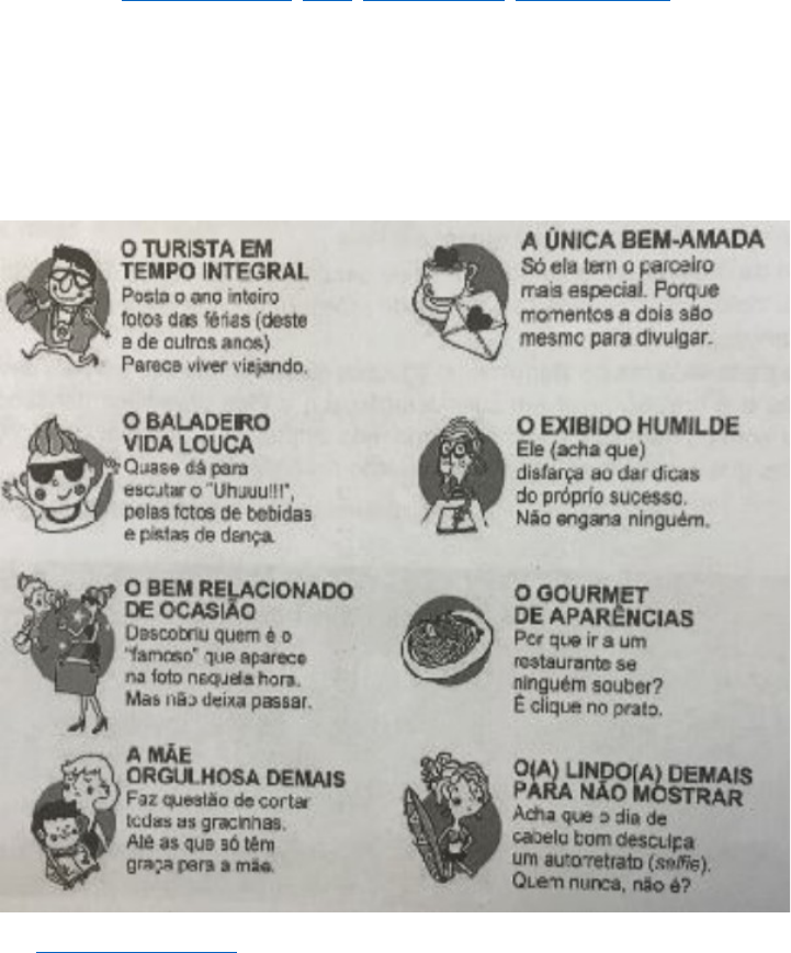 GABARITO ENEM / 2019 / PRIMEIRO DIA / CADERNO AZUL QUESTÃO 17 Os tipos cheios de si O difícil é encontrar quem nunca cruzou com (ou se passou por) um desses on-line. Disponível em: http://epoca.globo.com. Acesso em: 20 mar. 2014. De acordo com esse infográfico, as redes sociais estimulam diferentes comportamentos dos usuários que revelam · exposição exagerada dos indivíduos. · comicidade ingênua dos usuários. · engajamento social das pessoas. · disfarce do sujeito por meio de avatares. · autocrítica dos internautas. Comentário da questão Todas as representações aludem à exposição excessiva nas redes sociais. Equipe Descomplica A melhor equipe de professores do Brasil ;) Gabarito da questão Opção A