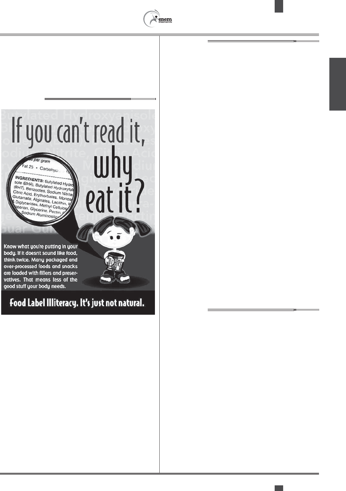 2014 LINGUAGENS, CÓDIGOS E SUAS TECNOLOGIAS Questões de 91 a 135 Questões de 91 a 95 (opção inglês) QUESTÃO 91 Implementar políticas adequadas de alimentação e nutrição é uma meta prioritária em vários países do mundo. A partir da campanha If you can´t read it, why eat it?, os leitores são alertados para o perigo de A acessarem informações equivocadas sobre a formulação química de alimentos empacotados. B consumirem alimentos industrializados sem o interesse em conhecer a sua composição. C desenvolverem problemas de saúde pela falta de conhecimento a respeito do teor dos alimentos. D incentivarem crianças a ingerirem grande quantidade de alimentos processados e com conservantes. E ignorarem o aumento constante da obesidade causada pela má alimentação na fase de desenvolvimento da criança. QUESTÃO 92 Languages and cultures use non-verbal communication which conveys meaning. Although many gestures are many others are not shared. A good example of this is the ubiquitous “Thai smile”. The “smile” carries a far wider range of meanings in Thai than it does in English culture. This can sometimes lead to serious communication breakdowns between Thais and English speakers. An example from my own early experience in Thailand illustrates the point. When confronting the Thai owner of a language school with administrative problems, complaints regarding student numbers in the class were met by a beaming smile and little else. I took this to mean lack of concern or an attempt to trivialise or ignore the problem. I left the discussion upset and angry by what appeared to be the owner’s offhand attitude to my problems. It was only later when another native speaking English teacher, with considerably more experience of Thailand, explained that a smile meant an apology and the fact that the following day all my complaints had been addressed, that I fully understood the situation. Disponível em: www.spring.org.uk. Acesso em: 11 jul. 2011 (fragmento). Viver em um país estrangeiro pode ser uma experiência pelo choque cultural. A experiência relatada pelo autor do texto revela diferentes atribuições de sentido a um determinado comportamento, mostrando que naquela situação o sorriso indicava um(a) A forma educada de fazer uma reclamação. B modo irônico de reagir a uma solicitação. C jeito de reconhecer um erro e se desculpar. D tentativa de minimizar um problema. E estratégia para esconder a verdade. QUESTÃO 93 Tennesse Mountain Properties Description Own a renovated house for less than $290 per throughout and tile in entry way and bathroom), kitchen cabinets, counter top, back door, fresh paint and laundry Em jornais, há diversos anúncios que servem aos leitores. O conteúdo do anúncio veiculado por este texto interessará a alguém que esteja procurando A emprego no setor imobiliário. B imóvel residencial para compra. C serviço de reparos em domicílio. D pessoa para trabalho doméstico. E curso de decorador de interiores. *CINZ25DOM3* 2014 LC - 2º dia | Caderno 6 - CINZA - Página 4 QUESTÃO 94 locomotion for various species on the planet. The condor in with a rather unimpressive showing about a third of the way down the list ... That didn’t look so good, but then someone at Scientific American had the insight to test the efficiency of locomotion for a man on a bicycle. And a man on a bicycle blew the condor away. That’s what a computer is to me: the computer is the most remarkable tool that we’ve ever come up with. It’s the equivalent of a bicycle for our minds. JOBS, S. Disponível em: www.msnbc.msn.com. Acesso em: 28 fev. 2012 (adaptado). Ao abordar o deslocamento de várias espécies, com base em um estudo que leu, Steve Jobs apresenta o computador como uma ferramenta que A amplia a quantidade de energia gasta no planeta. B alcança a mesma velocidade de uma bicicleta. C altera a velocidade com a qual nos movemos. D E aumenta o potencial de nossas mentes. QUESTÃO 95 Turning Brown A four-year-old boy was eating an apple in the back seat of the car, when he asked, “Daddy, why is my apple turning brown?” “Because,” his dad explained, “after you ate the skin off, the meat of the apple came into contact with the air, which caused it to oxidize, thus changing the molecular structure and turning it into a different color.” There was a long silence. Then the son asked softly, “Daddy, are you talking to me?” Disponível em: http://hayspost.com. Acesso em: 10 nov. 2011. Considerando os participantes da conversa nessa piada, nota-se que o efeito de humor é obtido em função A B de o pai dizer que a maçã tem carne e que muda de cor em contato com o ar. C de um menino de quatro anos entender uma D do fato de a criança não saber por que a maçã que estava comendo era marrom. E da escolha inadequada do tipo de linguagem para se conversar com uma criança. LINGUAGENS, CÓDIGOS E SUAS TECNOLOGIAS Questões de 91 a 135 Questões de 91 a 95 (opção espanhol) QUESTÃO 91 El candombe es participación Bastaría nombrar al tambor en nuestro país, y ya estaría implícita la referencia al candombe, patrimonio cultural uruguayo y, desde setiembre del 2009, las Naciones Unidas para la Educación, la Ciencia y la Cultura — Unesco. Proceso que se remonta a la época colonial, cuando era tenido como un mero baile de negros algunos diccionarios antiguos y no tanto, viéndolo como divertimento de pésima categoría por su procedencia racial. Esto fue cambiando merced al combate sin tregua a los prejuicios, siempre en crecimiento su aceptación por el conjunto de la sociedad, hasta llegar a nuestros días, cuando el Gobierno progresista en el 2006 promovió la Candombe, la Cultura Afrouruguaya y la Equidad Racial, cultural de la República Oriental del Uruguay al candombe, caracterizado por el toque de los tambores denominados chico, repique y piano, su danza y canto, creado por los afrouruguayos a partir del legado ancestral africano, s