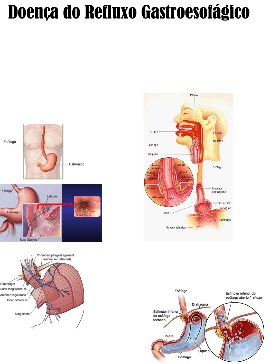 DRGE (doença do refluxo gastresofágico) · “Afecção crônica decorrente do fluxo retrógado de parte do conteúdo gastroduodenal para o esôfago ou órgãos adjacentes a ele, acarretando um espectro variável de sintomas e/ou sinais esofagianos e/ou extra-esofageanos, associados ou não a lesões teciduais”. · Acomete 12% da população brasileira Esofagite de refluxo: inflamação que danifica o esôfago. As causas incluem acumulo de ácidos do estomago dentro do esôfago, infecção, alguns medicamentos e alergias. · Episódios de refluxo são normais · Refluxo noturno esofagite Fisiopatologia · Esfíncter esofágico inferior (EEI) Esfíncter: músculos circulares que fecham as cavidades a que correspondem · Papel fundamental: impedir o refluxo do conteúdo gástrico para o esôfago · Entidade fisiológica única · Identificada claramente como uma zona de alta pressão durante a avaliação manométrica Quando acontece o refluxo? São duas condiçoes basicas: · A pressão intraesofagica é baixa demais e então a pressão intragastrica maior faz que o conteudo passa no sentido contrario Ex. de quando o conteúdo intra-abdominal tem a pressão maior do que o conteúdo esofágico: gestação, ascite, obesidade · O ensfincter esofagico inferior e incompetente apresenta relaxamento espontâneo não associado a uma onda peristáltica do corpo esofágico Esofagite · Acido gástrico · Pepsina · Sais biliares Refluxo gastresofágico Fisiopatologia · Principal barreira de proteção é o esfíncter esofagiano inferior (EEI) Situações que causam refluxo 1) Relaxamentos Transitórios do EEI 2) Baixa Pressão de repouso 3) Aumentos Transitórios na Pressão Intra-abdominal · Medidas posturais são muito importantes: · Evitar deitar após as refeições · Evitar de ingerir alimentos com volume muito grande para não exceder a capacidade gástrica de armazenamento · Evitar a ingestão de liquido durante as refeições (principalmente gasificado) · 80% dos pacientes com refluxo importante possuem hérnia de Hiato por deslizamento. Hérnia Hiatal por Deslizamento (hérnia do tipo I) · Junção cardioesofágica + Fundo do Estomago deslocados para dentro do Mediastino Posterior Mucosa do estomago acima do pinçamento diafragmático Tudo aquilo que saiu de dentro da cavidade abdominal e foi pra dentro da cavidade torácica: H. tipo I Qual a implicação da Hérnia hiatal do tipo I? · A junção gastroesofágica não é mantida na cavidade abdominal pela membrana frenoesofágica. Visão endoscópica da Hérnia hiatal Todo segmento entre o pinçamento diafragmático (aonde a parede do diafragma está fechando o hiato) e a linha Z, é considerado uma hérnia Hérnia por rolamento ou paraesofágica (Hérnia do tipo II) · Junção gastroesofágica encontra-se ancorada no abdome · O defeito hiatal, geralmente grande, fornece espaço para as vísceras migrarem para dentro do mediastino · A pressão relativamente negativa dentro do tórax facilita a migração visceral · Geralmente, é o fundo do estômago que migra para o mediastino; entretanto, o cólon e o baço podem ser ocasionalmente identificados. Junção esofagogástrica ainda está lá, mas o defeito do hiato permite que o fundo do estômago migre para dentro do tórax. Redução dessa hérnia: tratamento cirúrgico Hérnia do tipo III · Combinação das duas hérnias, onde a junção gastresofágica e a tuberositária (ou outra víscera) estão livres para mediastino “subiu tudo” A presença de uma hérnia de hiato: · Não é necessária nem suficiente para fechar o diagnostico de DRGE (posso ter um paciente que tem a doença do refluxo mas não tem a hérnia de hiato) · Não constitui uma indicação para correção cirúrgica · Como principal efeito, a cárdia e o esôfago distal tem o potencial de serem expostos à pressão negativa da cavidade torácica diminui a pressão do EEI, facilitando, dessa forma, a ocorrência do refluxo. Quadro clinico 1) Pirose (azia) · Dor retroesternal e epigástrica em queimação · Piora pós-prandial (apos refeição) e no decúbito · Melhora com água e em ortostase · Simula angina · Sem irradiação para as costas · Não é caracteristicamente descrita como uma sensação de pressão 2) Regurgitação · Indica progressão da doença (alimentos ingeridos) 3) Anemia e vômitos · Principalmente em lactentes 4) Disfagia (dificuldade para engolir) · Fase avançada da doença · Edema inflamatório estenose (estreitamento ou constrição de um ducto ou passagem) refluxo é tratado com: alimentação, medicação e cirurgia (mais raro) Diagnóstico 1) Imagem · Seriografia Esôfago-gastroduodenal · Avalia com precisão ESTENOSE · Avaliação grosseira da MOTILIDADE 2) Endoscopia digestiva alta com biopsia (mais comumente realizado) · Determinar a presença e o grau da esofagite · Tem valor na sua habilidade para excluir outras doenças, especialmente tumores, e em documentar a presença de lesão péptica no esôfago No exame endoscópico, o medico pode utilizar duas classificações para saber o grau da esofagite: 1) Savary-Miller 2) Los Angeles (mais utilizado) Savary-Miller classification of reflux esophagitis · Grade 1: single erosion above gastro-esophageal mucosal junction. · Grade 2: multiple, non-circumferential erosions above gastro-esophageal mucosal junction. · Grade 3: circumferential erosion above mucosal junction. · Grade 4: chronic change with esophageal ulceration and associated stricture. · Grade 5: Barrett's esophagus with histologically confirmed intestinal differentiation within columnar epithelium. Classificação de Los Angeles (1994) · Objetivo: separar as lesões da esofagite erosiva de acordo com a gravidade, para que assim seja decidido o tratamento Grau A Grau B pode evoluir para uma area de estenose Diagnostico 1) Manometria esofágica (EMN) Procedimento que mede a força e a função dos músculos do esôfago Normalmente feita junt
