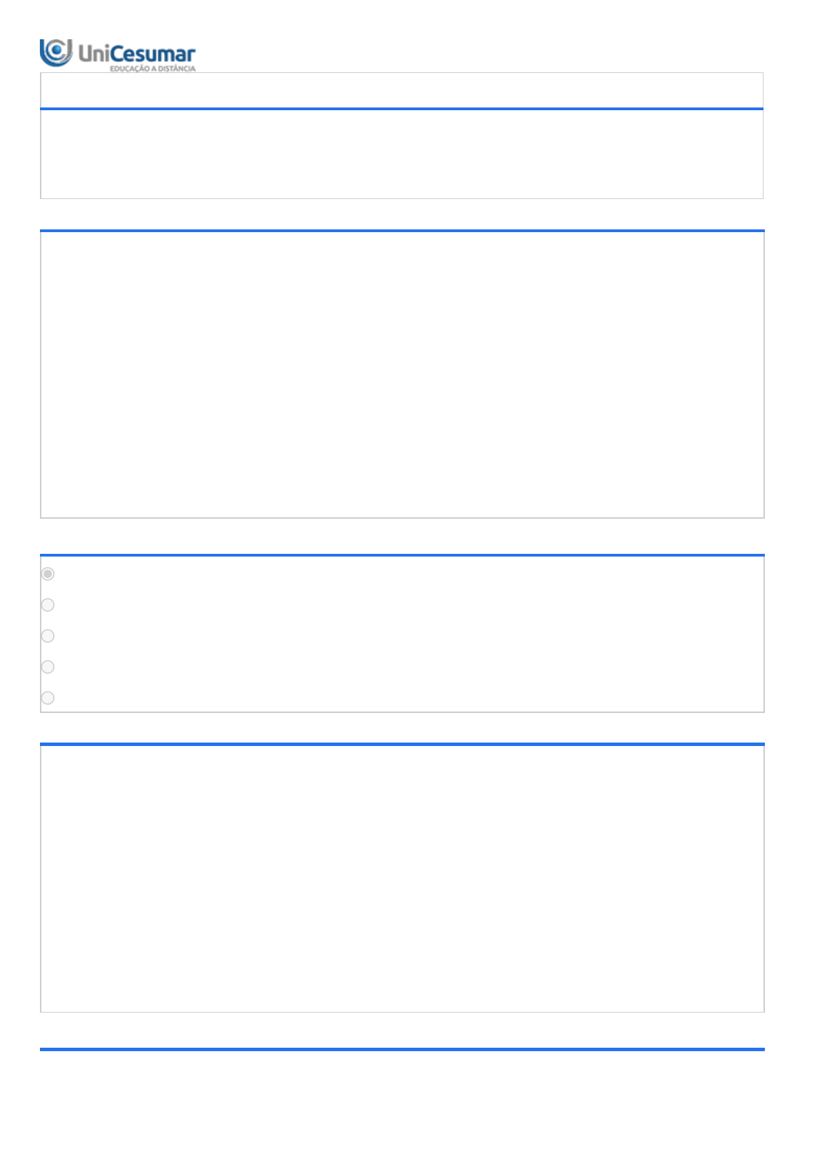 19/08/2021 Unicesumar - Ensino a Distância 1/6 ATIVIDADE 3 - MAT - PRÁTICA DE ENSINO: NOVAS TECNOLOGIAS E JOGOS DIDÁTICOS - 53/2021 Período:02/08/2021 08:00 a 20/08/2021 23:59 (Horário de Brasília) Status:ABERTO Nota máxima:1,50 Gabarito:Gabarito será liberado no dia 21/08/2021 00:00 (Horário de Brasília) Nota obtida: 1ª QUESTÃO Um dos desafios atuais do professor é estabelecer estratégias que vão ao encontro dos objetivos específicos e das metodologias adequadas para a promoção do ensino e da aprendizagem significativa com as novas mídias. A respeito da formação de professores para o século XXI e suas implicações no âmbito da sala de aula, avalie as asserções a seguir e a relação proposta entre elas. I. A designação “professor mediador” pressupõe que o professor deve garantir a dinâmica do processo de aprendizagem, ou seja, colaborar para que os alunos consigam superar suas dificuldades, quando colocados diante de questões éticas, sociais e profissionais. PORQUE II. A sociedade contemporânea requer que a centralidade do processo de ensino seja a aprendizagem e não o ensino, ou seja, não basta que a transmissão de informações aos alunos e sim promover a aprendizagem cognitiva profunda. A respeito dessas asserções, assinale a opção correta. ALTERNATIVAS As asserções I e II são proposições verdadeiras e a II é uma justificativa correta da I. As asserções I e II são proposições verdadeiras, mas a II não é uma justificativa correta da I. A asserção I é uma proposição verdadeira e a II é uma proposição falsa. A asserção I é uma proposição falsa e a II é uma proposição verdadeira. As asserções I e II são proposições falsas. 2ª QUESTÃO A Gamificação é compreendida como a inserção de princípios de design de jogos, em contextos não relacionados com jogos, com o intuito de potencializar o engajamento dos envolvidos e otimizar resultados de aprendizagem. Com base em seus conhecimentos sobre gamificação, avalie as premissas a seguir. I. A Gamificação é uma ferramenta que pode ser utilizada na educação, pois ela permite que os alunos tenham um aprendizado prazeroso, considerando que essa ferramenta utiliza elementos dos jogos de vídeo games para o processo de aprendizagem. II. A Gamificação requer obrigatoriamente a utilização de consoles, dispositivos móveis, realidade virtual e objetos materiais específicos com a finalidade de construir um ambiente com a presença de videogames. III. Elementos de design de jogos (feedback, recompensas, diversão e interatividade) em práticas de ensino, em geral, potencializam a aprendizagem de nossos alunos. É correto o que se afirma em: ALTERNATIVAS 19/08/2021 Unicesumar - Ensino a Distância 2/6 I, apenas. III, apenas. I e II, apenas. II e III, apenas. I e III, apenas. 3ª QUESTÃO A Base Nacional Comum Curricular (BNCC) enfatiza a importância das tecnologias educacionais em uma das competências gerais da Educação básica a ser desenvolvida com os estudantes: compreender, utilizar e criar tecnologias digitais de informação e comunicação de forma crítica, significativa, reflexiva e ética nas diversas práticas sociais (incluindo as escolares) para se comunicar, acessar e disseminar informações, produzir conhecimentos, resolver problemas e exercer protagonismo e autoria na vida pessoal e coletiva (BRASIL, 2018, p. 9). BRASIL. Ministério da Educação. Base Nacional Comum Curricular. Brasília, 2018. Disponível em: https://basenacionalcomum.mec.gov.br/images/BNCC_EI_EF_110518_versaofinal_site.pdf. Acesso em: 07 abril 2021. Neste contexto da formação do indivíduo e suas competências para o século XXI, leia e avalie as afirmativas a seguir: I. Na sociedade moderna, diversos fatores estão interligados e os processos são cada vez mais interdependentes e, neste contexto, aprender a viver junto é um dos pilares mais importantes do processo educativo do século XXI. II. Aulas atrativas e significativas para o aluno sempre necessitam a utilização de tecnologia, pois é impossível idealizar uma boa aula utilizando as metodologias ativas e não utilizar a tecnologia. III. O conhecimento pode ser internalizado, transportado, criado, ampliado ou aperfeiçoado por uma pessoa, sendo esta a responsável também pelo uso deste conhecimento, podendo ser usado para o bem ou para o mal. É correto o que se afirma em: ALTERNATIVAS I, apenas. II, apenas. III, apenas. I e III, apenas. II e III, apenas. 4ª QUESTÃO 19/08/2021 Unicesumar - Ensino a Distância 3/6 A plataforma Kahoot permite a construção de jogos baseados em aprendizagem por meio de quizzes e, consequentemente, pode ser incorporado em práticas de Gamificação do processo de ensino. Neste contexto, avalie as premissas a seguir: I. O Kahoot foi projetado para ser utilizado em qualquer dispositivo para potencializar a participação ativa durante a construção da aprendizagem. II. O Kahoot permite a utilização de kahoots prontos (disponível em “Discover/ Descobrir”) e também a construção do zero (opção “Crio”/“Create”). III. O Kahoot apresenta um feedback a respeito do percentual de acertou ou erro apenas no final de todas as questões do Quizz. É correto apenas o que se afirma em: ALTERNATIVAS I, apenas. II, apenas. III, apenas. I e II, apenas. I e III, apenas. 5ª QUESTÃO A Gamificação possui uma polissemia conceitual e epistemológica a respeito de sua definição. Assim, requer a existência de alguns princípios básicos para que uma determinada estratégia se configure como tal. Neste contexto, avalie as asserções a seguir e a relação proposta entre elas. I. O conceito de Gamificação teve seus primórdios no setor educacional e, devido ao grande sucesso escolar, expandiu a sua aplicabilidade para treinamentos empresariais e outras situações corporativas. PORQUE II. A Gamificação é compreendida como a inserção de princípios de design de jogos, em c