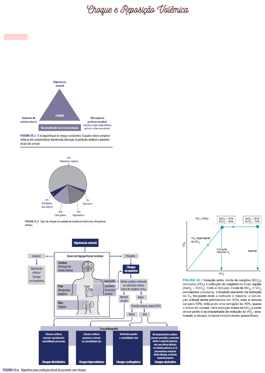CHOQUE é a expressão clínica da falência circulatória que resulta em oxigenação celular inadequada. É uma condição comum nos pacientes críticos, estando associada a alta morbidade e mortalidade, podendo afetar em torno de um terço dos pacientes das unidades de tratamento intensivo (UTIs). DO2 = Débito Cardíaco x CaO2 x 10 Onde DC (débito cardíaco) = volume sistólico x frequência cardíaca. O débito cardíaco (DC), produto do volume sistólico pela frequência cardíaca, é o contribuinte mais importante para a DO2 aos tecidos. Depende da pré-carga, da pós-carga e da contratilidade cardíaca. CaO2 (conteúdo arterial de oxigênio) = 1,34 x Hb x SaO2 + 0,003 x PaO2 Hb: hemoglobina em gramas por 100 mL de sangue (14-15 g/dL); SaO2: % oxiemoglobina – saturação fracional de hemoglobina; 1,34: número de mililitros de oxigênio ligados a 1g de Hb saturada; 0,003: solubilidade do O2 no plasma, vol% mmHg. VO2 = C(a-v)O2 x DC O VO2 é produto do DC pela diferença arteriovenosa do conteúdo de oxigênio (a-v) e, em condições normais, não depende da oferta. Porém, à medida que a DO2 diminui, o VO2 é mantido à custa do aumento da taxa de extração tecidual. AVALIAÇÃO DA PERFUSÃO TECIDUAL • Microcirculação (SvcO2, lactato); • Microcirculação/hemodinâmica (cateter de artéria pulmonar, variação da pressão de pulso, Doppler, ecocardiograma). Cateter de Swan-Ganz Análise da pressão de pulso: O volume sistólico e o DC podem ser estimados pela análise do contorno da onda de pulso arterial, geralmente derivada de um cateter arterial. É o princípio usado por alguns equipamentos disponíveis no mercado, como FloTrac (Edwards Lifesciences), PiCCO (PULSION Medical System) e LidCO (LiDCO Ltd). Eles medem a flutuação da pressão arterial e estimam a variação do volume sistólico (VVS), que é usada para predição de responsividade volêmica. A melhor acurácia na medida do DC por esse princípio encontra-se nos pacientes com ritmo regular, em ventilação mecânica e sem suporte de vasopressor ou inotrópicos. TERAPIA GUIADA POR METAS A terapia guiada por metas (TGM) ou objetivos (a sigla em inglês é GDT, goal directed therapy) pode ser definida como a otimização hemodinâmica no período perioperatório por meio de fluidoterapia e agentes vasoativos com o intuito de reduzir complicações e mortalidade. Esse conceito surgiu da observação de que os valores de DC e DO2, quando elevados a valores normais ou supranormais, reduziram a hipoxemia tecidual e disfunção de órgãos em pacientes críticos. Fluído responsividade: ‘ • PVC entre 8 e 12 mmHg; • Pressão arterial média (PAM) > 65 mmHg; • Débito urinário (DU) > 0,5 mL/kg/h; • Saturação de oxigênio da veia cava superior (ScvO2) > 70%; • Normalização de lactato.