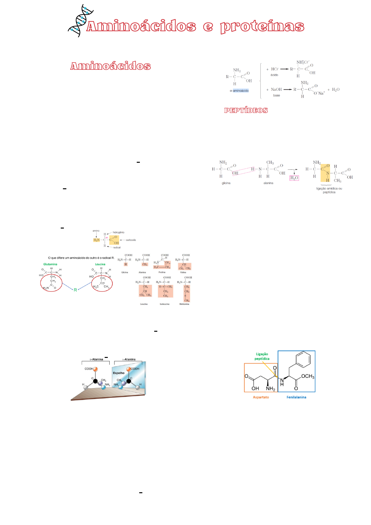 Aminoácidos e proteínasAminoácidos e proteínas AminoácidosAminoácidos São moléculas responsáveis por formar as diversas proteínas que tem função de melhorar o funcionamento do organismo. É Um tipo de substância essencial à vida, que apresenta o grupo amina em sua estrutura são os aminoácidos. Os mais importantes são os a(alfa)-aminoácidos, por serem os responsáveis pela síntese de proteínas. Todos os a-aminoácidos apresentam o grupo carboxila (– COOH), o grupo amino (–NH2), um hidrogênio e um radical ligados a um mesmo átomo de carbono, chamado carbono a: Com exceção da glicina, todos os a-aminoácidos possuem atividade óptica devido à presença de um carbono quiral (carbono a). Pode-se perceber que os aminoácidos têm duas funções em suas estruturas: função amina: grupo amino (–NH2) – caráter básico; função ácido carboxílico: grupo carboxílico (–COOH) – caráter ácido. Assim, por apresentarem simultaneamente caracteres ácido e básico, os a-aminoácidos são denominados compostos anfóteros e são capazes de reagir tanto com ácidos como com bases: PEPTÍDEOSPEPTÍDEOS Peptídeos são compostos formados pela união de dois ou mais aminoácidos através de ligações peptídicas. Os peptídeos são classificados em: Oligopeptídeos (ou simplesmente peptídeos): De 2 a 30 aminoácidos. 2 aminoácidos: Dipeptídeo. 3 aminoácidos: Tripeptídeo. 4 aminoácidos: Tetrapeptídeo. Polipeptídeos: De 31 a 50 aminoácidos. Proteínas: Acima de 50 aminoácidos. Exemplo de dipeptídeo: Aspartame (formado pela união entre uma molécula de aspartato e uma molécula de fenilalanina). ExercíciosExercícios 1. A tirosina, cuja molécula está abaixo representada, é um exemplo de: a) peptídeo. b) aminoácido. c) proteína. d) ácido nucléico. e) carboidrato. 2. A fenilalanina pode ser responsável pela fenilcetonúria, doença genética que causa o retardamento mental em algumas crianças que não apresentam a enzima fenilalanina-hidroxilase. A fenilalanina é utilizada em adoçantes dietéticos e refrigerantes do tipo “light”. Sua fórmula estrutural é representada abaixo: Pode-se concluir que a fenilalanina é um: a) glicídio. b) ácido carboxílico. c) aldeído. d) lipídio. e) aminoácido. 3. Um estudante recebeu um quebra-cabeça que contém peças numeradas de 1 a 6, representando partes de moléculas. Para montar a estrutura de uma unidade fundamental de uma proteína, ele deverá juntar três peças do jogo na seguinte sequência: a) 1, 5 e 3 b) 1, 5 e 6 c) 4, 2 e 3 d) 4, 2 e 6. a) proteínas. b) aminas. c) lipídios. d) ácidos carboxílicos. e) hidratos de carbono. 5. Os aminoácidos possuem a capacidade de condensar. Na formação de um peptídeo, a carboxila de uma molécula liga-se ao grupo amino de outra molécula. Essa ligação é denominada: a) estereoscópica. b) racêmica. c) peptídica. d) dativa. e) azeotrópica. 6. Dentre os elementos abaixo, qual está presente apenas em alguns dos aminoácidos constituintes das proteínas? a) carbono b) hidrogênio c) nitrogênio d) oxigênio e) enxofre. 7. A albumina, que é uma macromolécula de massa molecular em torno de 42.000 u e encontrada na clara do ovo, é uma proteína formada pela reação entre: a) ésteres. b) amidas. c) aminas. d) aminoácidos. e) ácidos carboxílicos. 8. Qual dos materiais abaixo tem a maior percentagem de nitrogênio? a) Amido . b) Banha. c) Celulose. d) Clara de ovo. e) Óleo vegetal. 9. São dadas as fórmulas dos seguintes aminoácidos: 4. Apresentam ligação peptídica: Escreva a fórmula estrutural de um fragmento de proteína GLI-ALA-GLI. 10. Um peptídeo é formado por dois ou mais aminoácidos que se ligam covalentemente por meio de ligações peptídicas (ou amidas). Tais ligações são formadas pela reação entre um grupo amina de um aminoácido e um grupo ácido carboxílico de um outro aminoácido com saída de uma molécula de água. Assinale a estrutura do dipeptídeo formado pela reação de condensação entre os aminoácidos metionina e glicina. 11. Os a-aminoácidos são moléculas que têm um grupo amino e um grupo carboxila ligados a um mesmo átomo de carbono. Um dos vinte a-aminoácidos encontrados em proteínas naturais é a alanina. Esta molécula produz também um átomo de hidrogênio e um grupo metila ligados ao carbono a. Na formação de proteínas, que são polímeros de aminoácidos, estes se ligam entre si através de ligações chamadas peptídicas. A ligação peptídica forma-se entre o grupo amino de uma molécula e o grupo carboxila de uma outra molécula de aminoácido, com a eliminação de uma molécula de água. Com base nestas informações, pede-se: a) a fórmula estrutural da alanina. b) a equação química que representa a reação entre duas moléculas de alanina formando uma ligação peptídica. 12. O ácido para-amino-benzoico (PABA) já foi utilizado em protetores solares, por conseguir absorver uma parte de radiação ultravioleta oriunda da luz solar. O PABA pode ser considerado como derivado do benzeno, no qual um hidrogênio foi substituído por um grupo carboxila e outro por um grupo amino. a) Escreva a fórmula estrutural do PABA. b) Um dipeptídeo é uma molécula formada pela união entre dois aminoácidos através de uma ligação peptídica. Escreva a fórmula estrutural de uma molécula que seria formada pela união de duas moléculas de PABA através de uma ligação peptídica. 13. Ainda hoje persiste a dúvida de como surgiu a vida na Terra. Na década de 50, realizou-se um experimento simulando as possíveis condições da atmosfera primitiva (pré-biótica), isto é, a atmosfera existente antes de originar vida na Terra. A ideia era verificar como se comportariam quimicamente os gases hidrogênio, metano, amônia e o vapor d'água na presença de faíscas elétricas, em tal ambiente. Após a realização do experimento, verificou-se que se havia formado um grande número de subst