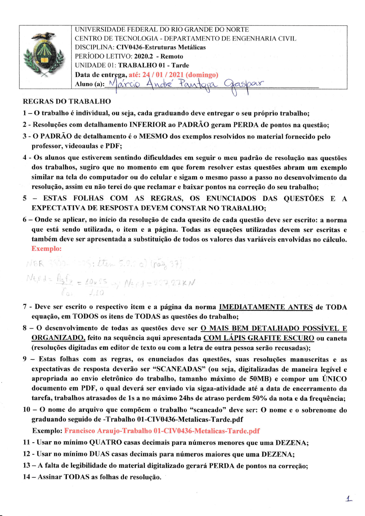 UNryERSIDADE FEDERAL DO RIO GRANDE DO NORTE CENTRO DE TECNOLOGIA. DEPARTAMENTO DE ENGENT{ARIA CIVL DISCIPLINA: CtV0436-Estruturas Metálicas PERÍODO LETTVO: 2*20j - REMOTO IINIDADE 01: TRÀBÂLHO 01 - Tarde Data de entrpga, atéz 24 I 0l I 2021(dotningo) Aluno tulr Vldrcio À rnáte ?ar \o,:a- REGRAS DO TRÂBALHO 1- O trabalho é individual, ou seja, eada graduando deve entregar o seu próprio trabalho; 2 - Resoluções com detalhamento INFERIOR ao PÂDRÃO gerem PERDA de pontas na questão; 3 - O PADRÃO de detalhamento é o ME§M0 dos exemplos resotyidos no material fornecido pelo professoro videoaulas e PDF; 4 - Os alunos que estiverem sentindo di{iculdades em seguir o meu padrão de resolução nas questões dos trabalhos, sugiro que no momento em que forem resolver estas questões abram um exemplo similar na tela do computador ou do celular e sigam o mesmo pâsso a passo no desenvolvimento da resolução, assim eu não terei do que reclamar e baixar pontos aa correção do seu trabalho; 5 ESTAS FOLHÀS COM A§ REGRA§, OS ENUNCIAI}OS DAS QUESTÕES E A EXPECTATIVA DE RESPO§TÀ DEYEM CONSTAR NO TRABALHO; 6 - Onde se aplicar, no início da resolução de cada quesito de cada questão deve ser escrito: a norma que está sendo utilizada, o item e a página. Todas as equações utilizadas devem ser escritas e também deve ser apresentada a substituição de todos os valores das variáveis envolvidas no cálculo. Exemplo: i,i , {. l'/ 7 - Deve ser escrito o respectivo item e a página da normr IMEDIAIAMENTE ANTE§ de TODA equação, em TODOS os itens de TODAS as questões do trabalho; I - O desenvolvimento de todas as questões deve ser g,MAI§ BEM DETALII4.DÇ POSSÍYEI,,.E OnC,q.NIZADO. feito na sequência aqui apres.o*"Or ou eaneta (resoluções digitadas em editor de texto ou com a letra de outra pessoa serão recusadas); 9 - Estas folhas com as regras, os enunciados das questões, suas resoluções manuscritas e as expectativas de resposta deverão ser "SCAIIEAIIAS" (ou seja, digitalizadas de maneira legível e apropriada ao envio eletrônico do trabalho, tamanho máximo de 50MB) e compor um {INICO documento em PDF, o qual deverá ser enviado via sigaa-atividade até a data de encerramento da tarefa, trabalhos atrasados de ls a no máximo 24hs de atraso perdem 507" da nota e da frequência; 10 - O nome do arquivo que compõem o trabalho "scaneado" deve ser: O nome e o sobrenome do graduando seguido de -Trabalho 01-ClV0436-Metalicas-Tarde.pdf Exemplo: Francisco Araujo-Trabalho 01-CM436-Metalicas-Tarde.pdf 11 - Usar no mínimo QUATRO câsas decimais para nirmgros menores que umã DEZENA; 12 * Usar no mínimo DUAS casas decimais para números maiores que uma DEZENA; 13 - A falta de legibitidade do material digitalizado gerará PERIIA de pontos na correção; 14 - Assinar TODAS as folhas de resolução. _4_ 0l) Um galpão industrial metálico tem cobertura com inclinaçâo muito pequena (< 25o), o que permite considerar as terças de cobertura trabalhando a Ílexão retâ, ou seja, despreza-se a componente transversal horizonlal das forças gravitacionais. A terça que participa do contravento horizontal além de está submetida às cargas gravitacionais também esta submetida a uma cargâ de compressão causada pelo vento afuante no fechamento, sendo seu valor característico /V"51 = 20kJV. Na tabela a seguir tem-se as taxas dos carregamentos gravitacionais apoiados nas terças do contravento e também a taxa da força de sucção do vento (puxando a cobertura para cima). Sabendo-se que as terças estão espaçadas de L,BOm e tem 9,0m de comprimento pede-se: Carregamento Taxa (kNlm') Carregamento Taxa (t$.[/m1 Sobrecarga acidental de norma 0,25 Peso próprio das terças 0rl0 Sobrecarga de utilidades 0,20 Correntes e travamentos 0,03 Telhas metálicas de cobertura 0,08 Vento de sucção (t) 0,60 a) Para cada uma das combinações últimas normais de cálculo Fdz, Fdz, Fd*, Fas ç Fdo, montar um modelo de uma terça submetida ao carregamento axial e ao cilrega:nento transversal combinados, tal qual o modelo abaixo; ? Fdz = 1,25PP + L,ZíCPM + 1, 35CP + 1, 50SC F dt = t,25PP + l,zSCPM + 1, 35CP + t,4CIVE F d+ = 1,0PP + L,0CP M + 1, OfP + L,4OVE F ds = 1,25PP + 1,25CP M + 1, 35CP + 1, SOSC + 1, 40(O, 6yE) F do = !,ZSPP + !,ZíCPM + 1, 35CP + !,&OVE + 1, 50(O, B§C) b) Para cada uma das combinações última normais do item anterior calcular o respectivo esforço mráximo solicitante de cálculo paÍa a verificação do dimensionamento e preencher a tabela úaixo. Combinação lV.";íkM ysd(ktv) Msa(kM.m) Faz o -i" ffizÍ 11, @ Faz 2fr 4, o+?8 ,tAr 5'.Q, Fat ,tfi 5, íO3 t 1,4& Fas ,í 6,8 3,5 í l,+ r,qM§ Fad 1,ô ü, &ü3§ ç,68W onde: N c,sd,- Esforço normal de compressão solicitante de ciâlculo; Vsa* Esforço cortante solicitante de cálculo; Msa* Momento fletor solicitante de calculo; 4 02) Um galpão industrial metiálico tem cobertura em duas águas siméticas com inclinação múto pequena, o que permite considerar que as forças do vento nesta cobertura atuam na direção vertical. Nas figuras abaixo tem-se os modelos do pórtico típico submetidos aos caÍTegamentos característicos. Pede-se, montar um modelo do pórtico típico submetido ao carregamento combinado: Fds: L,?SPP + L,ZíCPM + 1,35CP + 1,50§C + 1,40(0,6V8). 0,SklIJrm 0,8k1{Inr í,9kHlnr ,,4*t *1 7,Skl{Im ?,0kHtnr 7,6k?*írn 5,5kHIm il,0kHlm ã!m ,l!,3rt 5m ü O,Amt *1 {,$kHnm il,0kiüJtn 4 03) Calcular as taxas de trabalho das estruturas abaixo para o ELS de deslocamento excessivo. Para as estruturas isostáticas calcular o deslocamento através do Anexo D de Timoshenko&Gere: a) Travessa de fechamento com três linhas de b) Travessa de fechamento com três linhas de correntes, deslocamento entre os tirantes ; correntes, deslocamento perpendicular ao fechamento, perfil Ue25O x 100 x 25 x 2,65; vl l,tx )e Feers = PP+CPM+GP vl vx \a z 2,2*ít c) Terça de cobertura com três linhas de correntes, deslocamento vertic