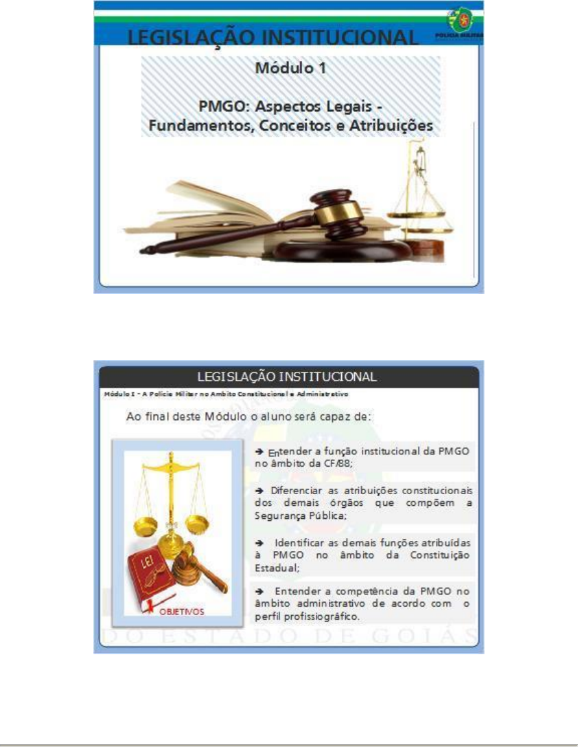 Legislação Institucional ead.sspj.go.gov.br 1. Módulo 1 1.1 Módulo 1 1.2 Módulo 1 - Objetivos Legislação Institucional ead.sspj.go.gov.br 1.3 Aula 01 - Breves noções de Direito Administrativo e Constitucional na PMGO 1.4 Aula 01 - PMGO: Aspectos Legais - Fundamentos, Conceitos e Atribuições Legislação Institucional ead.sspj.go.gov.br Direito Constitucional (Slide Layer) Direito Administrativo. (Slide Layer) Legislação Institucional ead.sspj.go.gov.br 1.5 Aula 01 - PMGO: Aspectos Legais - Fundamentos, Conceitos e Atribuições 1.6 Aula 01 - PMGO: Aspectos Legais - Fundamentos, Conceitos e Atribuições Legislação Institucional ead.sspj.go.gov.br 1. Supremacia do interesse público sobre o particular (Slide Layer) 2. Indisponibilidade do interesse público (Slide Layer) Legislação Institucional ead.sspj.go.gov.br 3. Legalidade (Slide Layer) 4. Impessoalidade (Slide Layer) Legislação Institucional ead.sspj.go.gov.br 5. Moralidade (Slide Layer) 6. Publicidade (Slide Layer) Legislação Institucional ead.sspj.go.gov.br 7. Eficiência (Slide Layer) 8. Continuidade (Slide Layer) Legislação Institucional ead.sspj.go.gov.br 9. Autotutela (Slide Layer) 1.7 Aula 02 - Constituição Federal Legislação Institucional ead.sspj.go.gov.br 1.8 Aula 02 - Constituição Federal 1.9 Aula 02 - Constituição Federal Legislação Institucional ead.sspj.go.gov.br § 4º (Slide Layer) § 5º (Slide Layer) Legislação Institucional ead.sspj.go.gov.br § 6º (Slide Layer) § 7º (Slide Layer) Legislação Institucional ead.sspj.go.gov.br § 8º (Slide Layer) § 9º (Slide Layer) Legislação Institucional ead.sspj.go.gov.br I - polícia federal; (Slide Layer) II - polícia rodoviária federal; (Slide Layer) Legislação Institucional ead.sspj.go.gov.br III - polícia ferroviária federal; (Slide Layer) 1.10 Aula 03 -Constituição Estadual de Goiás Legislação Institucional ead.sspj.go.gov.br 1.11 Aula 03 -Constituição Estadual de Goiás 1.12 Aula 03 -Constituição Estadual de Goiás Legislação Institucional ead.sspj.go.gov.br § 1º (Slide Layer) § 2º e 3º (Slide Layer) Legislação Institucional ead.sspj.go.gov.br § 4º (Slide Layer) § 5º (Slide Layer) Legislação Institucional ead.sspj.go.gov.br § 6º (Slide Layer) § 7º (Slide Layer) Legislação Institucional ead.sspj.go.gov.br § 8º (Slide Layer) § 9º (Slide Layer) Legislação Institucional ead.sspj.go.gov.br § 11 (Slide Layer) § 12 (Slide Layer) Legislação Institucional ead.sspj.go.gov.br § 13 e 14 (Slide Layer) 1.13 Aula 03 -Constituição Estadual de Goiás Legislação Institucional ead.sspj.go.gov.br 1.14 Aula 03 -Constituição Estadual de Goiás 1.15 Aula 03 -Constituição Estadual de Goiás Legislação Institucional ead.sspj.go.gov.br 1.16 Aula 04 - Perfil Profissiográfico na PMGO 1.17 Aula 04 - Perfil Profissiográfico na PMGO Legislação Institucional ead.sspj.go.gov.br Direito Constitucional (Slide Layer) 1.18 Aula 04 - Perfil Profissiográfico na PMGO Legislação Institucional ead.sspj.go.gov.br 1.19 Aula 04 - Perfil Profissiográfico na PMGO 1.20 Aula 04 - Perfil Profissiográfico na PMGO Legislação Institucional ead.sspj.go.gov.br Polícia Ostensiva (Slide Layer) Poder de Polícia Ostensiva (Slide Layer) Legislação Institucional ead.sspj.go.gov.br Ordem de polícia (Slide Layer) Consentimento de polícia (Slide Layer) Legislação Institucional ead.sspj.go.gov.br Licença (Slide Layer) Autorização (Slide Layer) Legislação Institucional ead.sspj.go.gov.br 1.21 Aula 04 - Perfil Profissiográfico na PMGO Fiscalização (Slide Layer) Legislação Institucional ead.sspj.go.gov.br Sanção de polícia (Slide Layer) Policiamento Ostensivo (Slide Layer) Legislação Institucional ead.sspj.go.gov.br Preservação da Ordem Pública (Slide Layer) Ordem Pública (Slide Layer) Legislação Institucional ead.sspj.go.gov.br Perturbação da Ordem (Slide Layer) 1.22 Aula 04 - Perfil Profissiográfico na PMGO Legislação Institucional ead.sspj.go.gov.br Autoridade Policial Militar (Slide Layer) Missão da Polícia Militar (Slide Layer) Legislação Institucional ead.sspj.go.gov.br Chefe de Polícia Ostensiva (Slide Layer) Policial Militar (Slide Layer) Legislação Institucional ead.sspj.go.gov.br 1.23 Aula 04 - Perfil Profissiográfico na PMGO I,II,III (Slide Layer) Legislação Institucional ead.sspj.go.gov.br IV,V,VI,VII (Slide Layer) VIII,IX,X,XI (Slide Layer) Legislação Institucional ead.sspj.go.gov.br XII,XIII,XIV (Slide Layer) XV,XVI,XVII,XVIII (Slide Layer) Legislação Institucional ead.sspj.go.gov.br XIX,XX,XXI (Slide Layer) 1.24 Aula 04 - Perfil Profissiográfico na PMGO Legislação Institucional ead.sspj.go.gov.br I,II,III (Slide Layer) IV,V,VI,VII (Slide Layer) Legislação Institucional ead.sspj.go.gov.br VIII,IX,X,XI (Slide Layer) XII,XIII,XIV (Slide Layer) Legislação Institucional ead.sspj.go.gov.br XV,XVI,XVII,XVIII (Slide Layer) 1.25 Exercício de fixação (Essay, 0 points, 1 attempt permitted) Legislação Institucional ead.sspj.go.gov.br 1.26 Exercício de fixação (Essay, 0 points, 1 attempt permitted) 1.27 Exercício de fixação (Essay, 0 points, 1 attempt permitted) Legislação Institucional ead.sspj.go.gov.br 1.28 Final