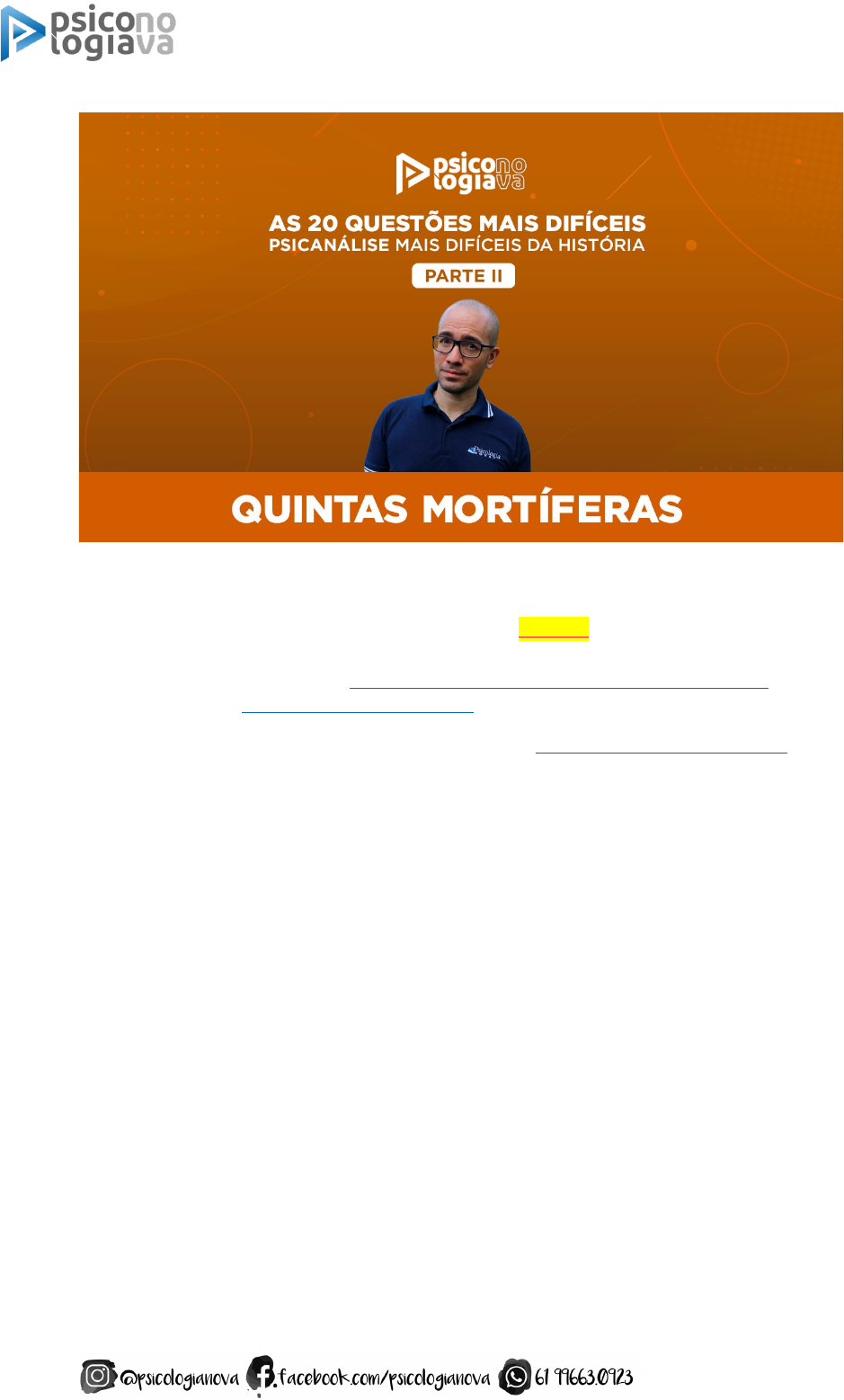Professor Alyson Barros Quintas Mortíferas (01/07/2021) 1 As 20 questões de PSICANÁLISE mais difíceis da história! REGRAS A transmissão NÃO ficará gravada. Se você perder a transmissão, não PERCA TEMPO pedindo o link do vídeo ou os gabaritos. Essa é a regra do jogo. A transmissão ocorrerá exclusivamente no dia 01/07, 19 horas, no youtube. Tente resolver as questões antes de assistir a transmissão. LINK DA TRANSMISSÃO: https://www.youtube.com/watch?v=CVdeeQSdOe4 Grupo do telegram: https://t.me/psicologianova Site dos melhores cursos de Psicologia para concursos: https://psicologianova.com.br QUESTÕES 11. CONSULPLAN - 2017 - TRE-RJ - Analista Judiciário - Psicologia A afetividade é um tema de importância para a compreensão de psicopatologias. Os afetos consistem, pois, em estados psíquicos subjetivos que se caracterizam pela propriedade de serem agradáveis ou desagradáveis. Nesse sentido é possível afirmar que o conceito de afetividade abrange emoções, sentimentos, paixões e humor. Tendo em vista tais considerações sobre a afetividade, assinale a afirmativa correta. (A) Na mania ocorre, entre outras coisas, dificuldade do controle da raiva, labilidade e incontinência afetiva. (B) No transtorno de personalidade borderline ocorrem sintomas depressivos, ansiosos, irritabilidade e estados delirantes. (C) As contribuições da psicanálise são enfáticas e taxativas para o estudo da afetividade, haja vista que o afeto é expresso por mímica, olhar, gestos, postura e tom de voz. (D) Os comportamentos de apego podem ser verificados no primeiro mês após o nascimento e tendem a perdurar durante a vida toda, mas, considerando, sobretudo, as fases iniciais do protesto, desespero e distanciamento. Professor Alyson Barros Quintas Mortíferas (01/07/2021) 2 12. CONSULPLAN - 2017 - TRE-RJ - Analista Judiciário - Psicologia Para a perspectiva psicodinâmica do estudo da psicopatologia, a compreensão e a conscientização da doença são parte do sintoma, assim como são prerrogativas fundamentais para um plano de tratamento e um prognóstico. Com base nessa perspectiva, analise as afirmativas a seguir. I. É por meio do manejo da transferência, instrumento principal para reprimir a compulsão do paciente à repetição, transformando-a em um motivo para recordar os fenômenos de sua moléstia, podendo, assim, ser curado pelo trabalho terapêutico. II. Pela proposta de recordar, repetir e elaborar é possível viabilizar ao paciente uma mudança de atitude consciente para a mudança, ou seja, de um habitual contentamento em lamentar, desprezar e subestimar a importância da doença; passa a compreensão das repressões que adotava ao que a tenha originado. III. Com o emprego da interpretação para identificar as resistências evidenciadas em inibições, atitudes inúteis, traços patológicos de caráter e sintomas, tornando-as conscientes de modo que sua enfermidade se faça desprezível, é possível, em um procedimento psicodiagnóstico, fornecer uma nova tônica psíquica ao paciente. IV. Com a instrução ao paciente a uma nova atitude em relação à doença, evitando intensificar os conflitos e pôr em evidência sintomas até o momento nebuloso, tais como manifestações fóbicas, ideias ou impulsos obsessivos, é possível proporcionar consolo ao paciente diante de agravamentos necessários e explicitados pela repetição. Acerca do psicodiagnóstico de fundamentação psicodinâmica, estão corretas apenas as afirmativas (A) I e II. (B) III e IV. (C) I, II e III. (D) II, III e IV. 13. VUNESP - 2017 - TJ-SP - Psicólogo Judiciário A partir de estudos de base psicanalítica sobre relações dos educadores de instituições-abrigo e crianças abrigadas, Almeida de Sousa e colaboradores (In: Ferreira e Ghirardi, 2016) observam que o caráter de transitoriedade da instituição- abrigo (A) promove a desvalorização da instituição em relação à família e pode ser visto como impedimento para o estabelecimento de vínculos. (B) aumenta a probabilidade de adaptação e disponibilidade afetiva da criança à família que venha a abrigá-la definitivamente no futuro. (C) justifica o desestímulo à formação de vínculos afetivos da criança com profissionais das instituições, a fim de evitar novas rupturas de laços vivenciada por ela. (D) fundamenta a necessidade de uma atuação dos profissionais focada no aqui- agora, compatível com a curta duração do vínculo com a criança. Professor Alyson Barros Quintas Mortíferas (01/07/2021) 3 (E) legitima a prioridade do regime disciplinar nas instituições-abrigo, com vistas a aumentar a probabilidade de êxito de uma adoção por família estruturada e funcional. 14. VUNESP - 2017 - TJ-SP - Psicólogo Judiciário Diante da multiplicidade de configurações da família contemporânea, para além do arranjo representado pela união de um homem e uma mulher que desejam ou não ter filhos, Isabel Gomes se pergunta (In: Fères-Carneiro, 2016), se ainda seria válida a visão de Sigmund Freud sobre as mulheres e seu papel na família: centrado na figura masculina, trazendo à tona a incompletude emocional e social. A autora conclui que (A) a ausência de referenciais de apoio para a subjetividade contemporânea e a consequente variedade de arranjos interpessoais tornam as ideias de Freud obsoletas. (B) o modelo tradicional de casamento, influenciado pela transmissão de legados transgeracionais, é compatível com a lógica complementar de homem-mulher em Freud. (C) o declínio da função paterna e uma representação social de homem frágil e incompleto na contemporaneidade impedem a manutenção da visão de Freud. (D) as ideias de Freud sempre serão aplicáveis, pois explicitam como as instâncias inconscientes atuam em prol da sobrevivência da espécie. (E) a dicotomia de papeis presente na obra de Freud não mais se aplica aos atuais arranjos conjugais, pois hoje a distinção entre os gêneros está m
