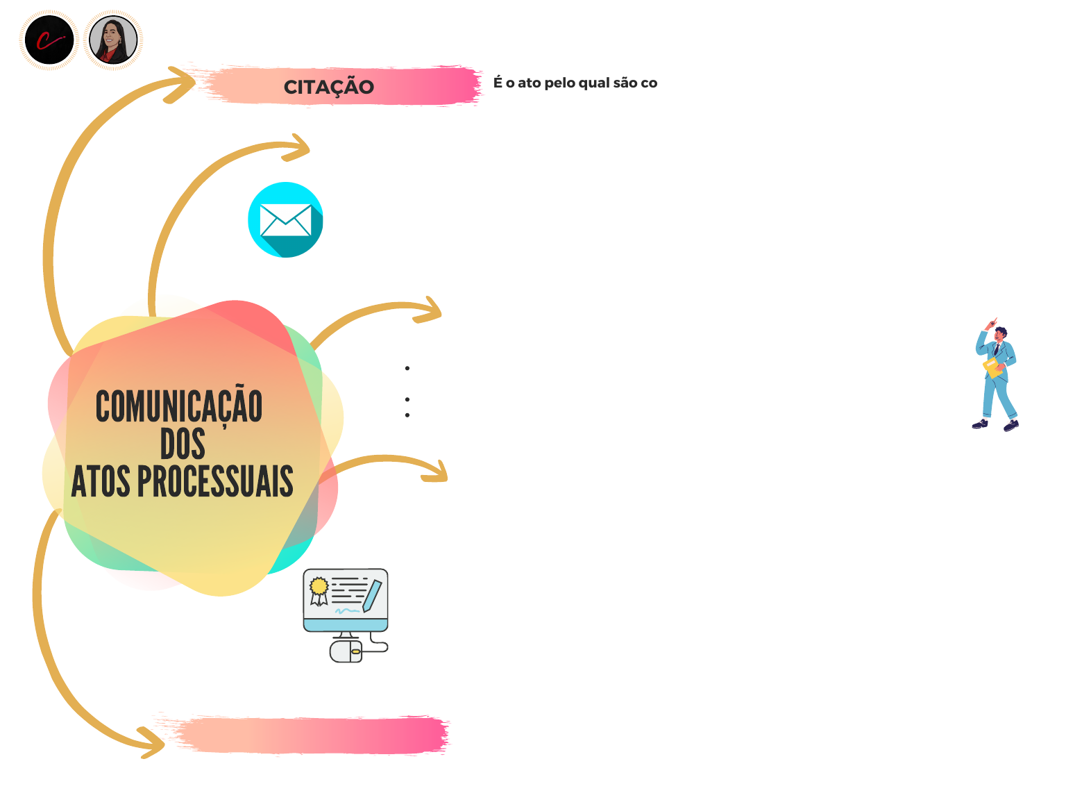 CITAÇÃO PELO CORREIO Por Viviane Amorim COMUNICAÇÃO DOS ATOS PROCESSUAIS CITAÇÃO É o ato pelo qual são convocados o réu, o executado ou o interessado para integrar a relação processual - art. 238, CPC. Ações de estado (que envolvam estado civil das partes como divorcio); Quando o citado for incapaz (seja absoluto ou relativo); Quando o citado residir em local não atendido pelos correios. DESTINATÁRIO: o próprio citado, salvo nos casos de condomínio ou loteamento, quando possível a entrega ao porteiro; HIPÓTESES QUE DESCABE A CITAÇÃO PELO CORREIO - art. 247, CPC: 1. 2. 3. INTIMAÇÃO É o ato processual pelo qual se dá CIÊNCIA A ALGUÉM dos atos e termos doprocesso para que faça ou deixe de fazer algo - art. 269, CPC. CITAÇÃO PELO OFICIAL DE JUSTIÇA Se não houver êxito na citação postal ou quando vedada essa forma de citação teremos pelo oficial de justiça. O oficial de justiça entregará o mandado diretamente ao citando; Se houver suspeita de ocultação, em duas oportunidades, o oficial de justiça procederá a CITAÇÃO POR HORA CERTA - art. 252, CPC. CITAÇÃO POR EDITAL A publicação do edital na rede mundial de computadores, no sítio do respectivo tribunal e na plataforma de editais do Conselho Nacional de Justiça, que deve ser certificada nos autos; A determinação, pelo juiz, do prazo, que variará entre 20 (vinte) e 60 (sessenta) dias, fluindo da data da publicação única ou, havendo mais de uma, da primeira; A advertência de que será nomeado curador especial em caso de revelia. Se não encontrar o citando, caberá a citação por meio de edital; REQUISITOS 1. 2. 3.