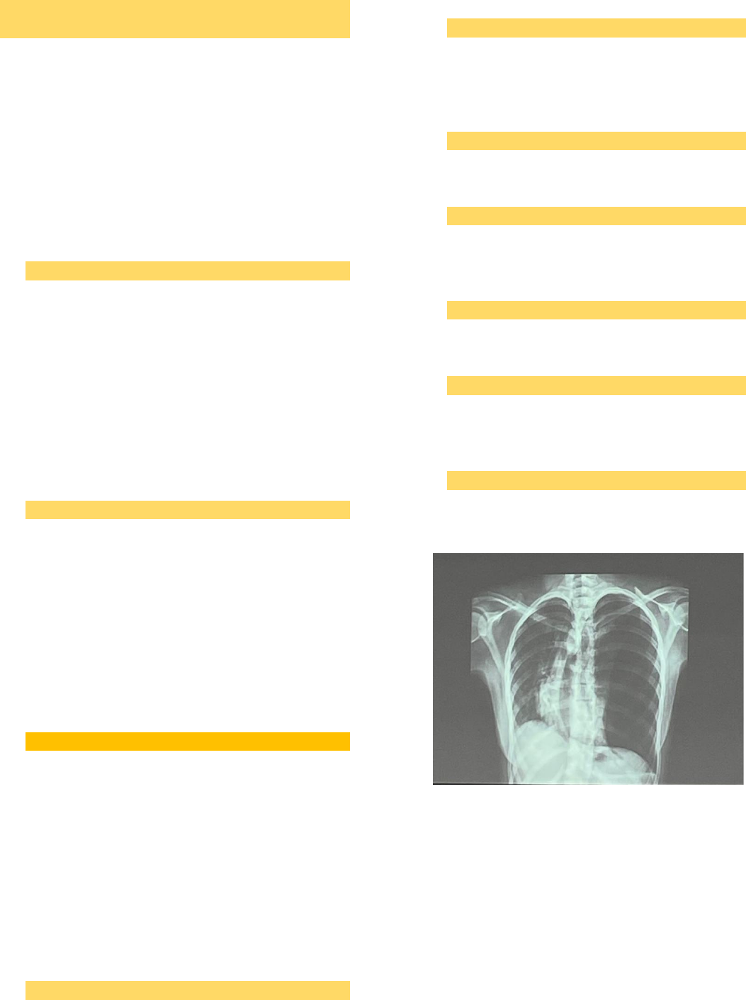 ABCDE RAIO-X DE TÓRAX • A: vias aéreas • B: espaços pleuro-pulmonares • C: índice cardiotóracico/mediastino/vasos da base do coração • D: diafragma – velamento/rebaixamento/elevação • E: fraturas de outros ossos • F: enfisema subcutâneo/partes moles • G: generalidades, presença de tubo, eletrodos • H: hipótese diagnóstica • I: conduta A- VIAS AÉREAS • Analisar traqueia, carina, brônquio fonte direito e esquerdo • Pergunta a ser feita: Tem desvio da traqueia? • O desvio da traqueia precisa ser analisado olhando conjuntamente o processo espinhoso da coluna vertebral • Pergunta a ser feita: Tem sinal de obstrução brônquica? Presença de corpo estranho? “Stop brônquico? As vias estão pérvias? • Sempre analisar presença de massa sólidas, corpo estranho. B-CAMPOS PLEUROPULMONARES • Olhar: transparência – hipotransparência (mais branco), hipertransparência (mais preto) • O hemotórax e pneumotórax alteram a densidade do hemitórax acometido • Olhar: volume – se o hemitórax direito está maior que o esquerdo e vice-versa. • O pneumotórax aumenta o volume do hemitórax acometido, enquanto a atelectasia reduz • Olhar: sinais de pneumotórax, derrame pleural, consolidação, massas tumorais. OBS: PNEUMOTÓRAX • Sinais diagnósticos de pneumotórax: sinal de linha pleural evidente, ausência de trama vascular lateralmente a linha pleural evidente • Outros achados que corroboram com o diagnóstico e indicam sinais de aumento da pressão intratorácica: desvio contralateral das estruturas, atelectasia pulmonar, alargamento dos espaços intercostais do lado acometido e rebaixamento do diafragma do lado acometido. • Sempre se atentar para o grau de dispneia do paciente C-CIRCULAÇÃO/ÁREA CARDÍACA • Olhar: área cardíaca, mediastino, índice cardiotorácico, vasos da base cardíaca • Analisar se tem desvio ou não do mediastino D-DIAFRAGMA • Olhar: paralisia de diafragma, sinal de herniação (sinal da ampulheta), presença de pneumoperitôneo, velamento de seio costofrênico e seio cardiofrênico E-ESQUELETO • Olhar: presença ou não de fraturas de arcos costais, lesão de escápula, clavícula, cabeça do úmero. F-FAT • Análise de partes moles, lesões expansivas ou sinal de enfisema subcutâneo, por exemplo no Pneumotórax, fratura de arcos costais. G-GENERALIDADE • Avaliar a presença de dispositivos, dreno, tubos, acesso venoso central e eletrodos, por exemplo H-HIPOTESE • Elaborar a hipótese diagnóstica • LEMBRE-SE: SEMPRE DESCREVEMOS O HEMITÓRAX QUE POSSUI ALTERAÇÕES I-PRÓXIMO PASSO • Pensar na conduta a ser tomada. IMAGENS • Nesse imagem vemos: A – traqueia desviada para a direita, brônquios fontes pérvios. B-hemitórax esquerdo hipertransparente, apresentando volume aumentado em relação ao hemitórax direito, sinal da linha pleural evidente com ausência da trama vascular lateralmente a linha pleural evidente. Além disso temos atelectasia de hemitórax esquerdo e alargamento dos espaços intercostais. C-desvio contralateral do mediastino. D-velamento do seio costofrênico a esquerda e elevação do seio costofrênico a direita (indicando aumento da pressão). E, F e G – sem alterações. • Hipótese – PNEUMOTÓRAX • Conduta: drenagem do hemitórax esquerdo – 5° EIC, entre a linha axilar média e anterior (zona de segurança), sempre na borda superior da costela inferior IMAGEM TRAUMA TÓRACICO • O trauma torácico corresponde a 20 a 25% das mortes em pacientes politraumatizados • Entretanto a maioria das vitimas pode ser tratada adequadamente quando damos suporte respiratório, analgesia e drenagem pleural • Avaliação inicial do paciente politraumatizado as lesões torácicas devem ser diagnosticadas e tratadas durante o exame primário, principalmente aquelas lesões com risco imediato à vida: ➔ Pneumotórax hipertensivo: fazer toracocentese descompressiva no 2º EIC seguida de drenagem pleural ➔ Pneumotórax aberto: curativo de 3 pontas ➔ Tórax instável: suporte ventilatório e analgesia. ➔ Hemotórax maciço: drenagem pleural e avaliação cirúrgica precoce ➔ Tamponamento cardíaco: pericardiocentese e avaliação cirúrgica precoce. • Monitorização eletrocardiográfica da vítima é fundamental, pois a cianose pode ser um sinal tardio e AESP pode ocorrer. • Fazer o exame neurológico e exposição de forma habitual. PNEUMOTÓRAX HIPERTENSIVO • Ocorre quando há vazamento de ar para o espaço pleural, através de um mecanismo UNIDIRECIONAL. • Com isso temos um colapso do pulmão, com desvio do mediastino para o lado oposto, levando a diminuição do retorno venoso e compressão do pulmão contralateral • Óbito: ocorre justamente pela queda do retorno venoso pelos vasos da base. • Quadro clínico: dor torácica e esforço respiratório. TAQUIDISPNEIA, TAQUICARDIA, HIPOTENSÃO E DISTENSÃO DE VEIAS CERVICAIS • Exame físico: desvio da traqueia, ausência de MV e timpanismo ao lado afetado. • Diagnóstico: clínico • Tratamento imediato: toracocentese descompressiva – 2°EIC linha hemiclavicular com agulha calibrosa. Transforma em PNMTX simples. • Tratamento definitivo: drenagem torácica em selo d’água – 5EIC° zona de segurança • Imagem A – PNMTX hipertensivo a direita. • Imagem B – local toracocentese descompressiva PNEUMOTÓRAX ABERTO • Acontece nos casos de ferimento da parede torácica com diâmetro maior que 2/3 do diâmetro da traqueia • Existe menor resistência a entrada de ar, levando um colabamento do pulmão e só cessa quando as pressões intrapleural e atmosférica se igualam. • Hipóxia e hipercapnia. • Quadro clínico: presença de ferida torácica aspirativa (traumatopneia), desconforto respiratória e instabilidade hemodinâmica. • Tratamento imediato: curativo de 3 pontas, formando uma válvula que impede que o ar atmosférico entre na parede torácica durante a inspiração, 