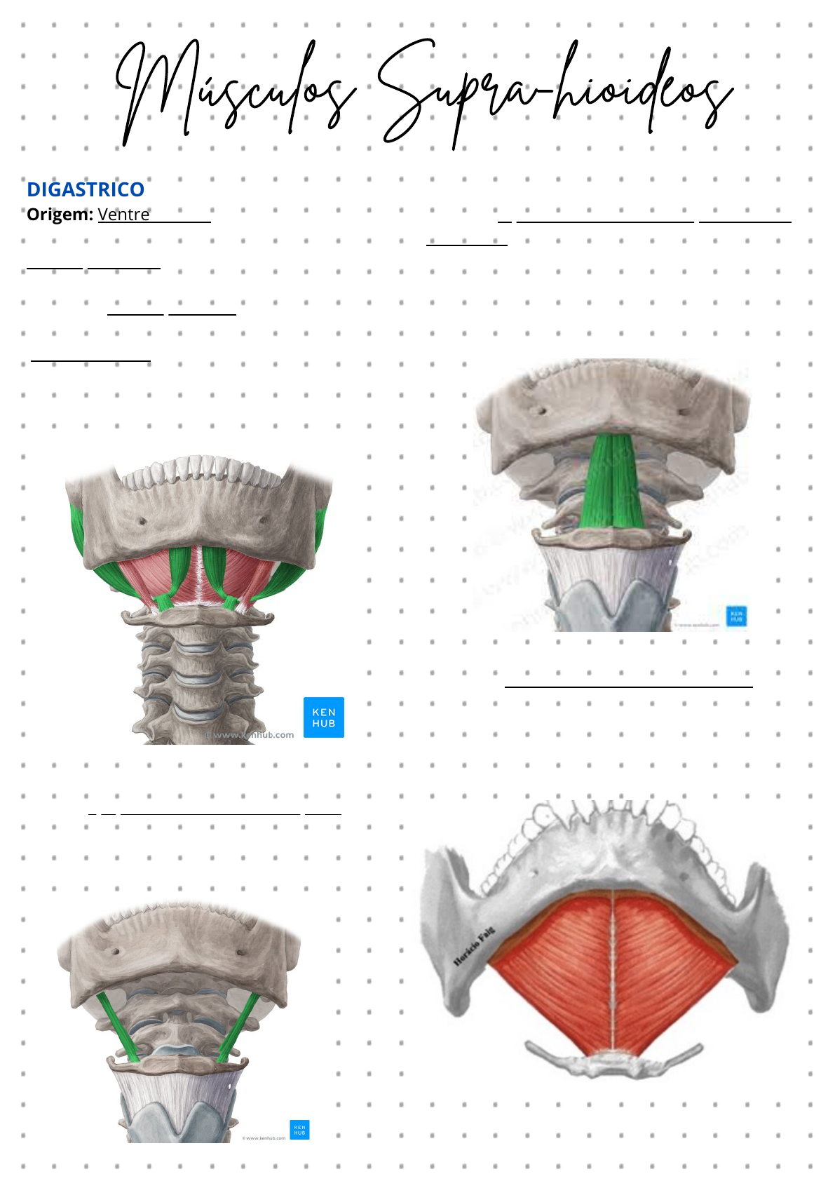 Músculos Supra-hioideos DIGASTRICO Origem: Ventre anteior- Fossa digastrica da mandíbula Ventre posterior- Eminencia mastoidea do osso temporal Inserção: Ventre posterior - Incisura mastóidea e tendão intermediário do hióide Ventre anterior- tendão intermediário do hióide e fossa digástrica Ação: Elevar o hioideo durante a deglutição e ajudar a manter a boca aberta ESTILO-HIÓIDEO Origem: Apofise estiloide do osso temporal Inserção: - Corno maior do hióide; Ação: Elevar e retrair o osso hioideo durante a deglutição GENIO-HIÓIDEO Origem: Espinha mentoniana na sup. interna da mandibula Inserção: - Espinha geniana inferior - Corpo do hióide Ação: mover o hioide anteriormente e auxiliar na abertura e nos movimentos laterais da mandíbula. MILO-HIÓIDEO Origem: Linha milo-hioideo da mandíbula Inserção: Linha milo-hióidea - Rafe milo-hióidea e corpo do hióide Ação: Formar o diafragma oral e elevar o assoalho da boca