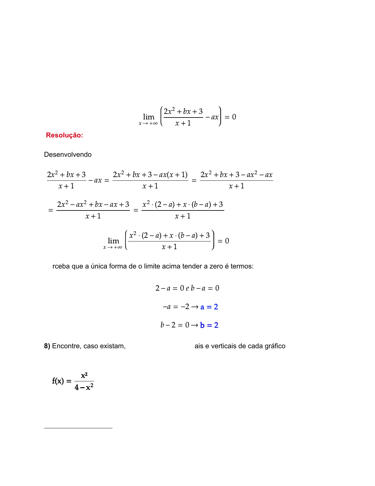 Tiago Lima - Instagram: @professor_disciplinas_exatas Lista - imites - UFRJ - Prof. Rodrigo Cardoso - Q3 e Q8 - Resolvida 3) Determine os valores de a e b de modo que: - ax = 0lim x +∞ → 2x + bx + 3 x + 1 2 Resolução: Desenvolvendo a expressão: - ax = = 2x + bx + 3 x + 1 2 2x + bx + 3 - ax x + 1 x + 1 2 ( ) 2x + bx + 3 - ax - ax x + 1 2 2 = = 2x - ax + bx - ax + 3 x + 1 2 2 x ⋅ 2 - a + x ⋅ b - a + 3 x + 1 2 ( ) ( ) Assim, o limte fica: = 0lim x +∞ → x ⋅ 2 - a + x ⋅ b - a + 3 x + 1 2 ( ) ( ) Perceba que a única forma de o limite acima tender a zero é termos: 2 - a = 0 e b - a = 0 -a = -2 a = 2→ b - 2 = 0 b = 2→ 8) Encontre, caso existam, as assíntotas horizontais e verticais de cada gráfico das funções abaixo: a) f x =( ) x² 4- x2 Resolução: Assintotas Horizontais: Para verificar se há assintotas horizontais é preciso estudar o limite da função tendendo para o infinito; = = = = = = - 1lim x ±∞ → x² 4 - x2 lim x ±∞ → x² x - x2 4 x2 2 lim x ±∞ → 1 - 1 4 x2 1 - 1 4 ±∞ 1 0 - 1 1 -1 Assim, -1 é uma assintota horizontal Assintotas Verticais: Para verificar se há assintotas verticais é preciso estudar o limite da função tendendo para as raízes do denominador; Raízes → 4 - x = 0 -x = - 4 x = 4 x = ± x = ±22 → 2 → 2 → 4 → Devemos estudar o limite da função quando esta tende para 2 e -2 pela esquerda e pela direita: perceba que quando x fica muito próximo de 2 pela direita, a função tende a -∞lim x 2 → + x² 4 - x2 → Para verifcar isso basta substituir valores pouco acima de 2, como : 2, 01;( 2, 0001; 2, 00001) perceba que quando x fica muito próximo de 2 pela esquerda, a função tende lim x 2 → - x² 4 - x2 → a +∞ Para verifcar isso basta substituir valores pouco abaixo de 2, como : 1, 99;( 1, 99999; 1, 9999999) perceba que quando x fica muito próximo de - 2 pela direita, a função tendelim x -2 → + x² 4 - x2 → a +∞ Para verifcar isso basta substituir valores pouco acima de - 2, como :( -1, 99; - 1, 99999; -1, 9999999) perceba que quando x fica muito próximo de - 2 pela esquerda, a função tende lim x -2 → - x² 4 - x2 → a -∞ Para verifcar isso basta substituir valores pouco abaixo de - 2, como : ( -2, 01; - 2, 0001; -2, 00001) Assim, -2 e 2 são uma assintota verticais Os resultados encontrados podem ser verificados no gráfico abaixo: b) f x =( ) 4x² x - 22 Resolução: Assintotas Horizontais: Para verificar se há assintotas horizontais é preciso estudar o limite da função tendendo para o infinito; = = =lim x ±∞ → 4x² x - 22 lim x ±∞ → 4x² x 1 -2 2 x2 lim x ±∞ → 4x² x 1 - 2 x2 lim x ±∞ → 4x² x 1 - 2 x2 = = = = = = +∞lim x ±∞ → 4x 1 - 2 x2 4 ±∞( ) 1 - 2 ±∞( )2 +∞ 1 - 0 +∞ 1 +∞ 1 Como o limite tende para o infinito, não há assintotas horizontais Assintotas Verticais: Para verificar se há assintotas verticais é preciso estudar o limite da função tendendo para as raízes do denominador; Raízes → = 0 = 0 x - 2 = 0 x = 2 x = ±x - 22 → x - 22 2 ( )2 → 2 → 2 → 2 Devemos estudar o limite da função quando esta tende para pela direita e quando 2 tende a pela esquerda, já que o domínio da função é R - :- 2 - ; ] 2 2 [ perceba que quando x fica muito próximo de pela direita, a função tendelim x → 2 + 4x² x - 22 → 2 a +∞ Para verifcar isso basta substituir valores pouco acima de , como : ( 2 ; ; 2, 01 2, 0001 2, 00001) perceba que quando x fica muito próximo de - pela esquerda, a funçãolim x - → 2 - 4x² x - 22 → 2 tende a +∞ Para verifcar isso basta substituir valores um pouco abaixo de ( - , como : - ; - ; -2 2, 01 2, 0001 2, 00001) Assim, - e são uma assintota verticais2 2 Os resultados encontrados podem ser verificados no gráfico abaixo: c) f x =( ) x x + 12 Resolução: Assintotas Horizontais: Para verificar se há assintotas horizontais é preciso estudar o limite da função tendendo para o infinito; = = =lim x ±∞ → x x + 12 lim x ±∞ → x x 1 +2 1 x2 lim x ±∞ → x ±x 1 + 1 x2 lim x ±∞ → x ±x 1 + 1 x2 = = = = = = ± 1lim x ±∞ → 1 ± 1 + 1 x2 1 ± 1 + 1 ±∞( )2 1 ± 1 - 0 1 ± 1 1 ±1 Assim, -1 e +1 são assintotas horizontais Assintotas Verticais: Para verificar se há assintotas verticais é preciso estudar o limite da função tendendo para as raízes do denominador; Raízes: = 0 = 0 x + 1 = 0 x = - 1 Não existe raíz real!x + 12 → x + 12 2 ( )2 → 2 → 2 → Assim, não há assintotas verticais Os resultados encontrados podem ser verificados no gráfico abaixo: d) f x = -( ) 1 x 1 2+ x 1 2 Resolução: Assintotas Horizontais: Para verificar se há assintotas horizontais é preciso estudar o limite da função tendendo para o infinito; - = ⋅ - = ⋅ - = 0 ⋅ 0 -lim x ±∞ → 1 x 1 2 + x 1 2 lim x ±∞ → 1 x lim x ±∞ → 1 2 + x 1 2 1 ±∞ 1 2 +±∞ 1 2 1 2 = 0 ⋅ - = 0 1 2 Assim, 0 é uma assintota horizontal Assintotas Verticais: Para verificar se há assintotas verticais é preciso estudar o limite da função tendendo para as raízes do denominador; Raízes: x + 2 = 0 x = -2; x = 0→ Devemos estudar o limite da função quando esta tende para 0 e -2 pela esquerda e pela direita: - perceba que quando x fica muito próximo de 0 pela direita, a funçãolim x 0+ → 1 x 1 2 + x 1 2 → tende a +∞ Para verifcar isso basta substituir valores pouco acima de 0,( como : 0, 01; 0, 0001; 0, 00001) - perceba que quando x fica muito próximo de 0 pela esquerda, a funçãolim x 0 → - 1 x 1 2 + x 1 2 → tende a +∞ Para verifcar isso basta substituir valores pouco abaixo de 0,( como : - 0, 01; -0, 0001; -0, 00001) - perceba que quando x fica muito próximo de - 2 pela direita, a função lim x -2 → + 1 x 1 2 + x 1 2 → tende a +∞ Para verifcar isso basta substituir valores pouco acima de ( -2, como : - 1, 99; - 1, 99999; -1, 9999999) perceba que quando x fica muito próximo de - 2 pela esquerda, a função tende lim x -2 → - x² 4 - x2 → a -∞ Para v