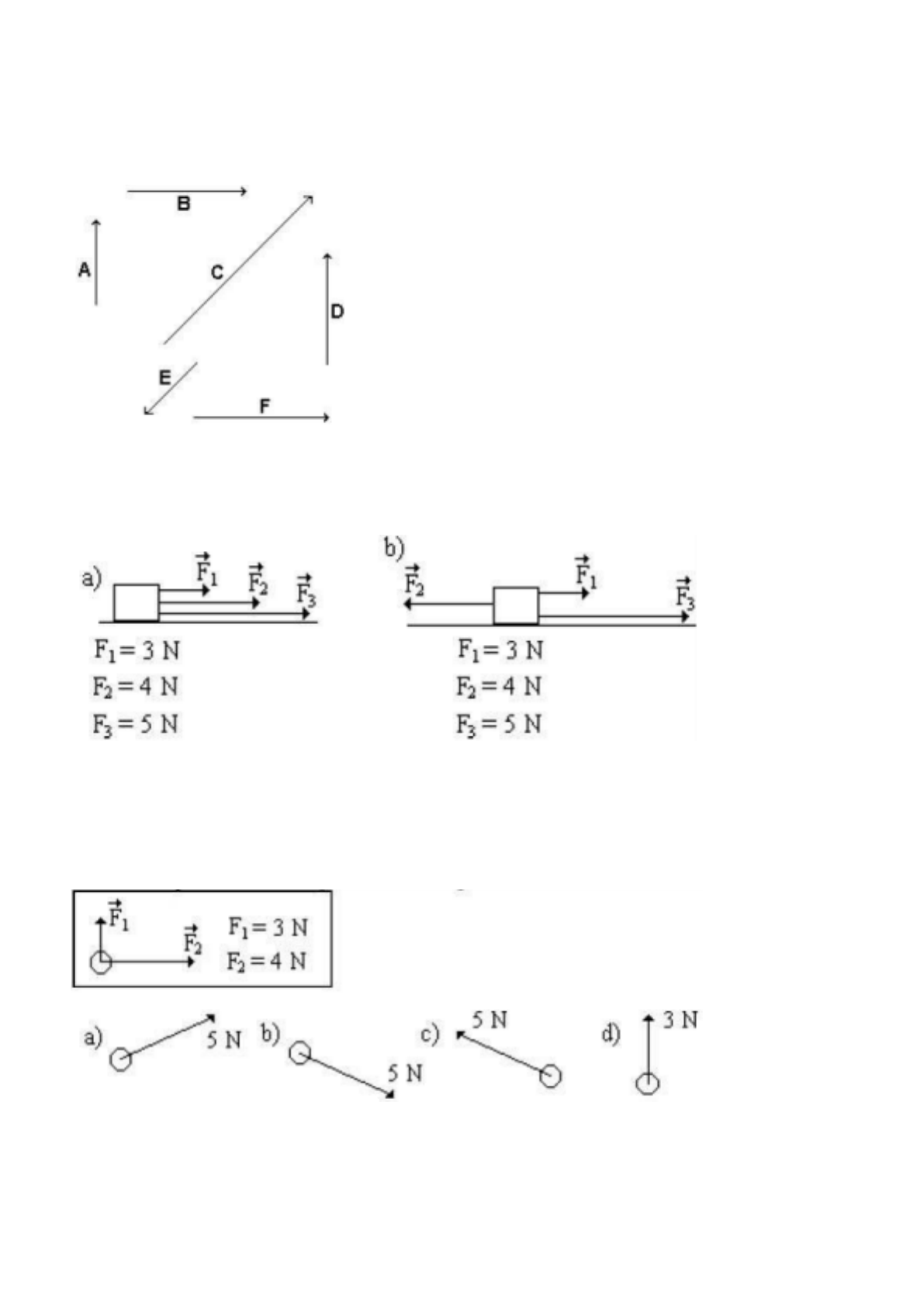 Vetore� - Exercíci�� 1) Observe a figura a seguir e determine quais as flechas que: a) tem a mesma direção; A e D, B e F, C e E. b) tem o mesmo sentido; A e D, B e F. c) tem o mesmo comprimento; D e B. d) são iguais; Nenhuma. 2) Analise o sistema de forças e responda qual é a direção, sentido e módulo da força resultante e represente-a graficamente. a) 12 N, horizontal e para a direita. b) 4 N, horizontal e para a direita. 3) Analise o sistema de forças e responda qual é a direção, sentido e módulo da força resultante nas opções abaixo que melhor representa a força resultante graficamente: Força resultante de 5 N, na diagonal e para a direita. 4) Num cabo-de-guerra, dois garotos puxam a corda para a direita. A força que cada um faz é: 70 N, 30 N. Outros dois puxam a corda para a esquerda, com as forças: 80 N, 45 N. Qual o valor, a direção e o sentido da força resultante? A força resultante será de 25 N, na horizontal e para a esquerda. 5) Determine o vetor soma (resultante) entre dois vetores perpendiculares (ângulo reto) de módulos 6 N e 8 N. A força resultante será 10 N. 6) Um barco recebe de seu motor uma força de intensidade 8 N para a direita, e ao mesmo tempo, sobre ele age uma força de intensidade 2 N para a esquerda, devido à correnteza do rio onde navega. Qual será a intensidade da força resultante dessas duas forças em newtons? A força resultante será 6 N, na horizontal e para a direita. 7) Em uma partícula atuam duas forças de 50 N e 120 N, perpendiculares entre si. O valor da força resultante é : a) 130 N b) 170 N c) 70 N d) 6.000 N e) 140 N 8) Considere as grandezas físicas: I. Velocidade II. Temperatura III. Quantidade de movimento IV. Deslocamento V. Força Destas, a grandeza escalar é: a) I b) II c) III d) IV e) V 9) Um atleta que treina para a prova de caiaque olímpico percebeu que, durante um dia sem vento em um lago, sua velocidade máxima é de 6 m/s. No dia da prova ele rema com velocidade máxima contra o vento, sabendo que a distância a ser percorrida na prova é de 500 m e que a velocidade do vento é 2 m/s calcule o tempo para o atleta concluir a prova. a) 225 s b) 250 s c) 125 s d) 150 s e) 200 s