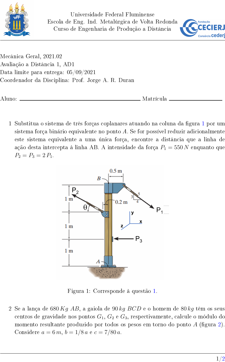 Universidade Federal Fluminense Escola de Eng. Ind. Metalúrgica de Volta Redonda Curso de Engenharia de Produção a Distância Mecânica Geral, 2021.02 Avaliação a Distância 1, AD1 Data limite para entrega: 05/09/2021 Coordenador da Disciplina: Prof. Jorge A. R. Duran Aluno: Matrícula 1 Substitua o sistema de três forças coplanares atuando na coluna da �gura 1 por um sistema força binário equivalente no ponto A. Se for possível reduzir adicionalmente este sistema equivalente a uma única força, encontre a distância que a linha de ação desta intercepta à linha AB. A intensidade da força P1 = 550N enquanto que P2 = P3 = 2P1. Figura 1: Corresponde à questão 1. 2 Se a lança de 680Kg AB, a gaiola de 90 kg BCD e o homem de 80 kg têm os seus centros de gravidade nos pontos G1, G2 e G3, respectivamente, calcule o módulo do momento resultante produzido por todos os pesos em torno do ponto A (�gura 2). Considere a = 6m, b = 1/8 a e c = 7/80 a. 1/2 Universidade Federal Fluminense Escola de Eng. Ind. Metalúrgica de Volta Redonda Curso de Engenharia de Produção a Distância Figura 2: Corresponde à questão 2. 2/2
