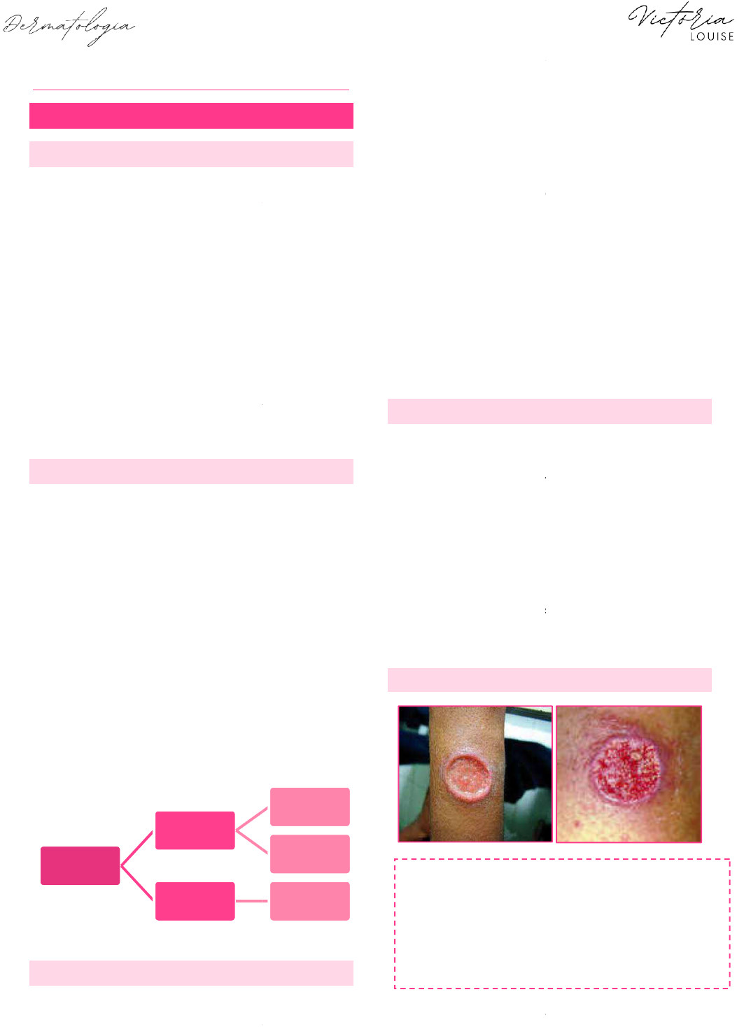 DERMATOLOGIA LEISHMANIOSE TEGUMENTAR AMERICANA INTRODUÇÃO E EPIDEMIOLOGIA Doença parasitária crônica, não contagiosa, causada por diferentes espécies de protozoários gênero Leishmania. Caracteriza-se principalmente pelo acometimento cutâneo e secundariamente ao tecido nasobucofaríngeo, dependendo da espécie de Leishmania e de fatores imunogenéticos do hospedeiro. Polimorfa, grande variedade de lesões cutâneas: úlcera, placas, nódulos, etc. Na América o Brasil representa a área endêmic maior extensão territorial e um dos países com maior casos de notificação da LTA. ETIOLOGIA As espécies do gênero Leishmania estão divididas em dois subgêneros, conforme o comportamento do parasito no tubo digestivo do inseto (vetor). Viannia; Leishmania; No Brasil as três principais espécies são 2 subgêneros, 3 espécies): Leishmania Viannia braziliensis; Leishmania Viannia guyanensis; Leishmania Leishmania amazonenses forma anérgica; BIOLOGIA O protozoário apresenta duas formas: (flagelada) e forma amastigota (aflagelada). Leishmania Viannia Leishmania TEGUMENTAR AMERICANA OLOGIA crônica, não contagiosa, protozoários do se principalmente pelo acometimento e secundariamente ao tecido mucoso , dependendo da espécie de e de fatores imunogenéticos do Polimorfa, grande variedade de lesões cutâneas: área endêmica de e um dos países com estão divididas subgêneros, conforme o comportamento do parasito no tubo digestivo do inseto flebotomíneo principais espécies são (1 gênero, Leishmania Viannia braziliensis; Leishmania Viannia guyanensis; Leishmania Leishmania amazonenses – uas formas: promastigota (aflagelada). No tubo digestivo do inseto flagelada, no homem a forma parasitária (amastigota). A fêmea promove hematofagia amastigota dentro do infectado, transformando em forma promastigota, após 7 a 10 dias a fêmea já está apta a transmitir a doença. A fêmea promove repasto sanguíneo e regurgita no mamífero. Neste momento várias formas promastigotas não metacíclicas infectantes são neutralizadas pela ação lítica do complemento, assim como polimorfonucleares e eosinófilos. Já as formas metacíclicas escapam dos mecanismos de defesa são fagocitadas pelos macrófagos PATOGENIA Resposta predominante TH1 INF gama: ativação dos macrófagos da destruição dos parasitas, levando a forma mais branda. Quando predomina TH2: IL4, IL5, IL10, IL 13 inibem a formação do INF gama e diminuem a formação de granulomas. Cada espécie de Leishmania espécie-específicos, que são maiores determinantes de qual resposta ocorrerá predominantemente (TH1/TH2). LEISHMANIOSE CUTÂNEA Incubação de 2 a 4 semanas. Adenopatia importante. Leishmania Viannia braziliensis Leishmania Viannia guyanensis Leishmania Leishmania amazonenses Lesão inicial pápula eritematosa única ou múltiplas em áreas expostas, com evolução para úlcera de bordas infiltradas, emolduradas, fundo com granulação grosseira vermelho seroso, costumam ser indolores. inseto encontra-se a forma a forma parasitária aflagelada hematofagia adquirindo a forma dentro do macrófago do mamífero , transformando-se no estômago do inseto , após 7 a 10 dias a fêmea já está apta a transmitir a doença. A fêmea promove repasto sanguíneo e regurgita no mamífero. Neste momento várias formas não metacíclicas, ou seja não infectantes são neutralizadas pela ação lítica do complemento, assim como polimorfonucleares e metacíclicas promastigotas que escapam dos mecanismos de defesa são fagocitadas pelos macrófagos. TH1: IL2, IL12, TNF alfa e macrófagos e um aumento da destruição dos parasitas, levando a forma mais TH2: IL4, IL5, IL10, IL 13, inibem a formação do INF gama e diminuem a formação de granulomas. Leishmania apresenta antígenos específicos, que são maiores determinantes ta ocorrerá predominantemente LEISHMANIOSE CUTÂNEA LOCALIZADA Incubação de 2 a 4 semanas. Adenopatia importante. Lesão inicial pápula eritematosa única ou múltiplas em áreas expostas, com evolução para úlcera de bordas infiltradas, emolduradas, fundo com granulação grosseira vermelho-vivo com exsudato seroso, costumam ser indolores. Teste de Montenegro (+), pois resposta imunológica boa. CUTÂNEO MUCOSA E MUCOSA (HIPERÉRGICA) – L(V) BRAZILIENSIS Ocorre geralmente após um ou vários anos da forma cutânea localizada, tendo como fator de risco o tratamento inadequado ou ausente, principalmente em pacientes com lesões acima da cintura pélvica ou múltiplas lesões. Infiltração do septo nasal e desabamento do nariz acometimento da cavidade oral. No palato pode ocorrer granulações gr separadas por sulcos “Cruz da Espúdia ou de Escomel". CUTÂNEO DISSEMINADA Quadro raro, várias lesões de características clássicas, linfonodomegalia, acometimento mucoso (30%), febre , mal estar, dores muscul emagrecimento , anorexia, disseminação linfática. HIV /AIDS. L (V) braziliensis : disseminação mais rápida L (L) amazonensis: disseminação mais lenta CUTÂNEA ANÉRGICA DIFUSA L (L) amazonensis. Teste de Montenegro (+), pois resposta MUCOSA E MUCOSA L(V) BRAZILIENSIS um ou vários anos da forma , tendo como fator de risco o tratamento inadequado ou ausente, principalmente em pacientes com lesões acima da cintura pélvica ou Infiltração do septo nasal e desabamento do nariz e palato pode ocorrer granulações grosseiras separadas por sulcos “Cruz da Espúdia ou de uadro raro, várias lesões de características clássicas, linfonodomegalia, acometimento mucoso (30%), febre , mal estar, dores musculares, emagrecimento , anorexia, disseminação linfática. : disseminação mais rápida : disseminação mais lenta Lesões de aspecto queloidianas múltiplas, placas infiltradas e nódulos não ulcerados, geralmente não ocorre destruição do septo nasal, não ocorre acometimento visceral, muitos parasitas na lesão. Teste de Montenegro geralmente ( DIAGNÓSTICO Provas diretas Exame parasi