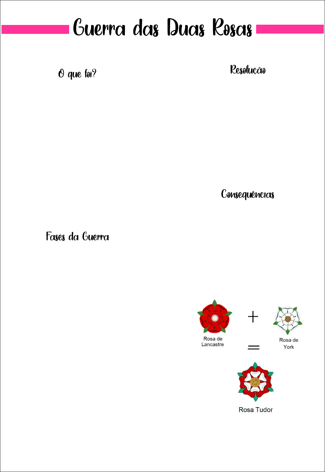• 1445 - 1485 • Disputa pelo poder na Inglaterra; • Família Iorque (rosa branca); • Família Lancaster (rosa vermelha); • Ambas as famílias eram descendentes da família Plantageneta, que reinava na Inglaterra desde o século XII; • Consequência da Guerra dos Cem Anos (1337 – 1453_, com rei Henrique VI (Lancaster) considerado fraco para governar, influenciado por sua esposa, Margarida de Anjou. • Ricardo, Duque de Iorque, se alia a nobres e através da batalha de Saint Alba., captura o rei Henrique VI; • Ricardo se torna rei, mas é assassinado, e seu filho Eduardo IV se torna rei; • O antigo rei Henrique VI consegue fugir, mas ao longo da guerra é capturado três vezes, até a sua morte em 1471, na Torre de Londres; • Em 1483, Eduardo IV morre, e seu filho, Eduardo V se tornaria rei aos 12 anos de idade, mas foi preso pelo seu tio Ricardo III, e faleceu na torre de Londres. • Sem o trono, os Lancaster passaram a apoiar Henrique Tudor, que vivia na Bretanha, (oeste da França); • Henrique Tudor invade a Inglaterra e derruba Eduardo III, se coroando rei Henrique VII, se casando com Isabel de Iorque (filha de Eduardo IV); • Conciliação entre as duas famílias. • Estabelecimento da Dinastia Tudor, que seguiu com Henrique VII, Henrique VIII e Elisabeth I; • Maior enfraquecimento da nobreza feudal, com maior centralização política dos reis; • Formação do Estado nacional. @_lorenaleals