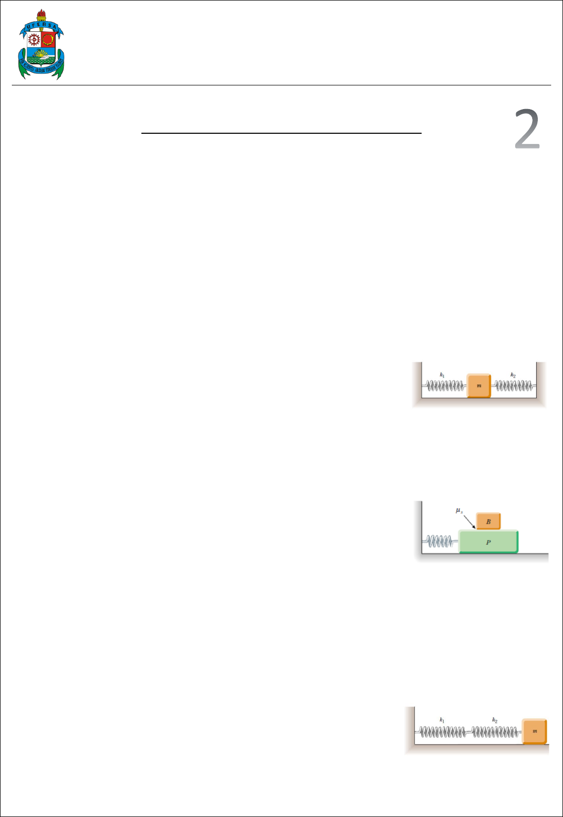 Universidade Federal Rural do Semi-Árido – UFERSA Pró-Reitoria de Graduação – PROGRAD Departamento de Ciências Naturais, Matemática e Estatística – DCME Disciplinas: Ondas e Termodinâmica Professora: Subênia Medeiros Lista de Exercício – Movimento Periódico 1. Em um certo ancoradouro, as marés fazem com que a superfície do oceano se eleve de uma distância d (do nível mais alto ao nível mais baixo) em movimento harmônico simples, com um período de 12,5 h. Quanto tempo leva para a água baixar uma distância 0,250 d a partir do seu nível mais alto? Respostas: 2,08 h 2. Um bloco encontra-se sobre uma superfície horizontal (uma mesa oscilante) que está se movendo horizontalmente para a frente e para trás em movimento harmônico simples com frequência de 2,0 Hz. O coeficiente de atrito estático entre o bloco e a superfície é 0,50. Qual o maior valor possível da amplitude do MHS (Movimento Harmônico Simples) para que o bloco não deslize ao longo da superfície? Respostas: 31 mm 3. Na figura ao lado, duas molas são presas a um bloco que pode oscilar sobre um piso sem atrito. Se a mola da esquerda for removida, o bloco oscilará com uma frequência de 30 Hz. Se, em vez disso, a mola da direita for removida, o bloco oscilará com uma frequência de 45 Hz. Com que frequência o bloco oscilará quando preso às duas molas? Respostas: 54 Hz 4. Na figura ao lado, dois blocos P e B (mB = 1 kg e mP = 10 kg) e uma mola (k = 200 N/m) estão dispostos sobre uma superfície horizontal sem atrito. O coeficiente de atrito estático entre os dois blocos é 0,40. Que amplitude do movimento harmônico simples do sistema blocos-mola faz com que o bloco menor fique na iminência de deslizar sobre o bloco maior? Respostas: 0,22 m 5. Um objeto está se movendo na extremidade de uma mola com um MHS de amplitude A. Se a amplitude for dobrada, o que acontece com a distância total que o objeto percorre em um período? O que acontece com o período? O que acontece com a velocidade máxima do objeto? Discuta como essas respostas estão relacionadas. Respostas: 6. Na figura ao lado, duas molas são ligadas e conectadas a um bloco de massa 0,245 kg que é posto em oscilação sobre um piso sem atrito. Cada uma das molas possui constante elástica k = 6430 N/m. Qual é a frequência das oscilações? Respostas: 18 Hz 7. O deslocamento de um objeto oscilando em função do tempo é mostrado na figura abaixo. Quais são (a) a frequência, (b) a amplitude, (c) o período, (d) a frequência angular desse movimento? Respostas: 8. Na figura ao lado, um bloco pesando 14,0 N, que pode deslizar sem atrito sobre um plano inclinado de um ângulo θ = 40,0◦, está conectado ao topo do plano inclinado por uma mola de massa desprezível com comprimento na configuração não deformada de 0,450 m e constante elástica de 120 N/m. (a) A que distância do topo do plano inclinado encontra-se a posição de equilíbrio do bloco? (b) Se o bloco for ligeiramente puxado para baixo ao longo do plano e solto, qual será o período das oscilações resultantes? Respostas: (a) 0,525 m; (b) 0,686 s 9. Na figura ao lado, a esfera de cima é liberada a partir do repouso, colide com a esfera de baixo, que está em repouso, e gruda-se a ela. Ambas as molas têm 50,0 cm de comprimento. A esfera de cima possui uma massa de 2,0 kg e está inicialmente a uma altura de 10,0 cm acima da esfera de baixo, cuja massa é igual a 3,0 kg. Ache a frequência e o deslocamento angular máximo do movimento após a colisão. Respostas: 0,705 Hz; 14,5º 10. Uma barra metálica delgada e homogênea de massa M possui um pivô em seu centro por onde passa um eixo perpendicular à barra. Uma mola horizontal cuja constante é k possui uma extremidade presa na parte inferior da barra e sua outra extremidade está rigidamente presa a um suporte. Quando a barra é deslocada formando um pequeno ângulo 𝜃 com a vertical e liberada (figura ao lado), mostre que a oscilação é um movimento harmônico angular e calcule seu período de oscilação. (Sugestão: considere pequenos ângulos para que sen 𝜃 ~𝜃 𝑒 cos 𝜃 = 1). Respostas: 2𝜋√𝑀/3𝑘