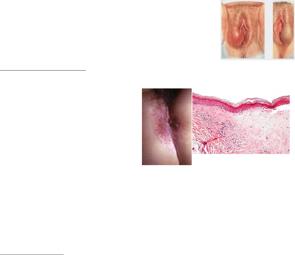 Patologia do Trato Genital Feminino Vulva Cisto de Bartholin · Infecção da glândula de Bartholin produz uma inflamação e pode resultar em abcesso. · Ocorrem em todas as idades e resultam de obstrução do ducto por um processo inflamatório. · Os cistos geralmente são revestidos por epitélio transicional ou escamoso. · Podem crescer de 3 a 5 cm e produzir dor e desconforto local. Distúrbios epiteliais não neoplásicos Líquen escleroso · Apresenta-se como placas ou máculas lisas que podem ficar maiores e coalescer, produzindo uma superfície que lembra porcelana ou papel pergaminho. · Microscopicamente: adelgaçamento da epiderme, degeneração das células basais, queratinização excessiva (hiperqueratose), mudanças escleróticas da derme superficial e por um infiltrado linfocítico em forma de faixa na derme subjacente. · Ocorre em todas as idades, mas é mais comum em mulheres pós-menopausa. · Sugerem que está envolvida em uma reação autoimune. Hiperplasia de células escamosas · Resultante da fricção ou arranhadura da pele para aliviar o prurido. · Apresenta-se como uma leucoplasia. · Microscopicamente: espessamento da epiderme (acantose) e hiperqueratose. Leve infiltrado linfocitário na derme e o epitélio hiperplásico pode exibir atividade mitótica, mas carece de atipia celular. Lesões exofíticas benignas Pólipos fibroepiteliais vulvares: semelhantes aos pólipos cutâneos que ocorrem em qualquer parte da pele. Papilomas escamosos: lesões exofíticas benignas cobertas por epitélio escamoso não queratinizado que se desenvolve nas superfícies da vulva e podem ser únicos ou numerosos. Condiloma plano sifílico Condiloma acuminado · São verrugas genitais benignas causadas por HPVs de baixo risco oncogênico (tipo 6 e 11). · Podem ser solitários ou multifocais e envolvem as regiões vulvares, perineal e perianal. Dificilmente acomete vagina e colo uterino. · Microscopicamente: eixo conjuntivo arborescente, exofítico, papilar, coberto por epitélio escamoso espessado, apresenta atipia coilocitótica (aumento nuclear, hipercromasia e um halo citoplasmático perinuclear). Lesões Neoplásicas Escamosas · Neoplasia maligna incomum, corresponde a 3% dos todos os cânceres genitais em mulheres. · Dois terços ocorrem em mulheres acima de 60 anos e o tipo histológico mais comum é o carcinoma de células escamosas. Carcinomas basaloides e verrucosos · Associados a infecção do HPVs (principalmente o 16) e são 30% dos casos. · Lesão precursora: neoplasia intraepitelial vulvar clásscica (NIV) · Fatores de risco: idade jovem na primeira relação sexual, multiplos parceiros sexuais, parceiro do sexo masculino com multiplas parceiras. · 10 a 30% apresentam lesões vaginais ou cervicais consequentes do HPV. · O risco de carcinoma invasor é mais alto em mulheres acima de 45 anos e imunosuprrimidas. O pico de incidencia é na sexta década de vida. · Morfologia: · NIV clássica: lesão branca discreta (hiperqueratótica) ou lesão levemente elevada e pigmentada. Microscopia: espessamento epidérmico, atipia nuclear, aumento de mitoses e falta de maturação celular. · Carcinomas invasor: podem ser exofíticos ou endurescidos, com ulceração central. Apresentam ninhos e cordões de células pequenas, agrupadas de modo compacto, que não apresentam maturação. · Carcinoma verrucoso: arquitetura exofitica e papilar, e atipia coilocitótica proeminente. Carcinoma queratinizante de células escamosas · Individuos com histórico de longa data de líquen escleroso ou hiperplasia de células escamosas. · Não está relacionado com o HPV. · Representa 70% dos casos. · Lesao precursora: NIV diferenciada ou NIV simples. · Alta frequência de mutações no TP53. · Morfologia: atipia acentuada da camad basal do epitélio escamoso e uma diferenciação de apacerência normal das celulas das camadas mais superficiais. Contém ninhos e línguas de epitélio escamoso maligno com proeminentes pérolas de queratina centrais. Lesões Neoplásicas Glandulares Hidradenoma papilífero · Nódulo bem circunscrito, mais comumente em lábios maiores ou nas pregas interlabiais. · Tendencia a ulceração. · Microscopia: progeções papilares cobertas com duas camadas de células: uma camada superior de células secretoras colunares que cobre uma camada mais profunda de células mioepiteliais aplanadas. · Esses elementos mioepiteliais são característicos das glândulas sudoríparas e dos tumores da glândula sudorípara. Doença de Paget extramamária · Área com traçado geográfico, pruriginosa, vermelha, crostosa, que ocorre geralmente em lábios mariores. · Particular proliferação intraepitelial de células malignas. Essas células são maiores que os queratinócitos e podem estar individualmente ou em grupos. Apresentam citoplasma claro devido a presença de mucopolissacarídeo e expressam citoqueratina 7. · Celulas de Paget exibem diferenciação apócrina, écrina e de queratonócitos e supostamente surgem de células multipotentes encontradas nos ductos de glândulas similares a mama. · Não é tipicamente associada ao câncer subjascente e fica confinada á epiderme da pele vulvar. Vagina Malformações congênitas Vagina septada ou dupla · Falha na fusão total dos ductos de Müller e acompanha um útero duplo. · Podem ser manifestações de síndromes genéticas, exposição intrauterina e dietilestilbestrol ou outros fatores perturbadores da sinalização epitelial-estromal. Adenose vaginal · São áreas residuais de epitélio glandular podem persistir na vida adulta. · Áreas avermelhadas, granulares, contrastando com a mucosa vaginal rosa-clara normal ao redor. · Epitélio mucinoso colunar indistinguível do epitélio endocervical. · 35 a 90% das mulheres expostas a DES no útero. Cistos do ducto de Gartner · Encontrados ao longo das paredes laterais da vagina. · Derivados dos vestígios dos ductos de Wolff. · Consistem em ci