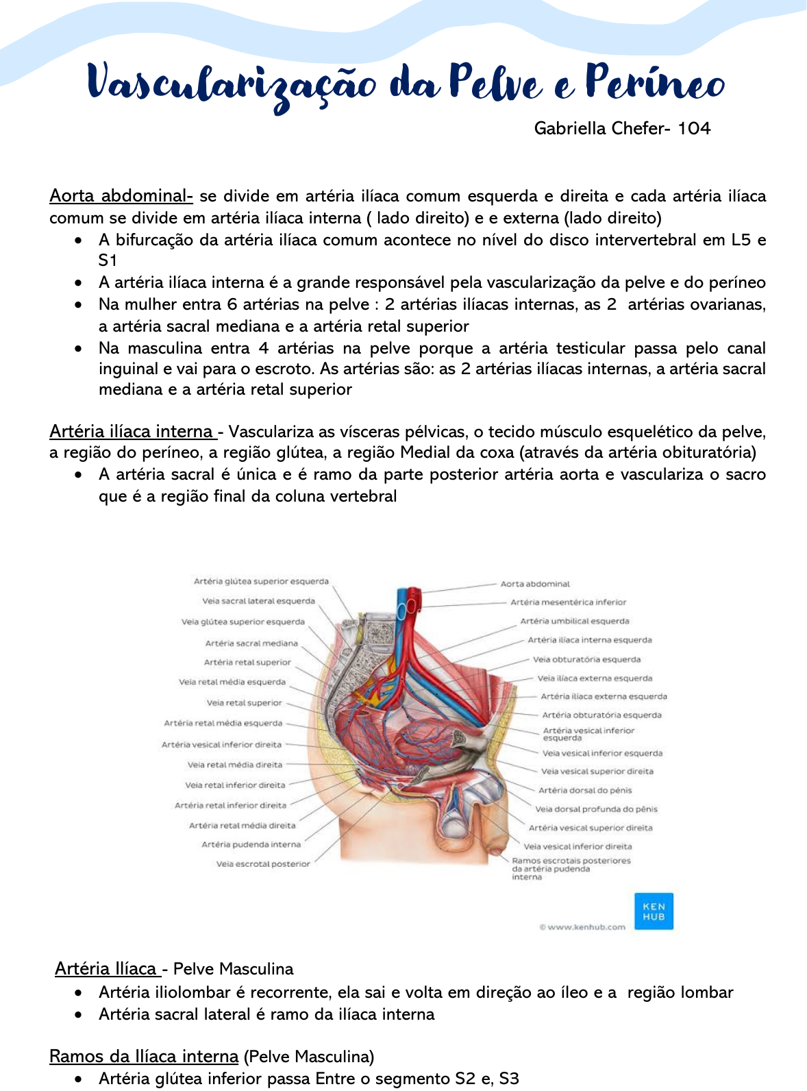 Vascularização da Pelve e Períneo Gabriella Chefer- 104 Aorta abdominal- se divide em artéria ilíaca comum esquerda e direita e cada artéria ilíaca comum se divide em artéria ilíaca interna ( lado direito) e e externa (lado direito) • A bifurcação da artéria ilíaca comum acontece no nível do disco intervertebral em L5 e S1 • A artéria ilíaca interna é a grande responsável pela vascularização da pelve e do períneo • Na mulher entra 6 artérias na pelve : 2 artérias ilíacas internas, as 2 artérias ovarianas, a artéria sacral mediana e a artéria retal superior • Na masculina entra 4 artérias na pelve porque a artéria testicular passa pelo canal inguinal e vai para o escroto. As artérias são: as 2 artérias ilíacas internas, a artéria sacral mediana e a artéria retal superior Artéria ilíaca interna - Vasculariza as vísceras pélvicas, o tecido músculo esquelético da pelve, a região do períneo, a região glútea, a região Medial da coxa (através da artéria obituratória) • A artéria sacral é única e é ramo da parte posterior artéria aorta e vasculariza o sacro que é a região final da coluna vertebral Artéria Ilíaca - Pelve Masculina • Artéria iliolombar é recorrente, ela sai e volta em direção ao íleo e a região lombar • Artéria sacral lateral é ramo da ilíaca interna Ramos da Ilíaca interna (Pelve Masculina) • Artéria glútea inferior passa Entre o segmento S2 e, S3 • Artéria glútea superior passa Entre o tronco lombo sacral e S1 • Artéria vesical inferior vai para região da bexiga e pode dar ramo para a próstata • Artéria pudenda interna vai para região pudenda, que da ramo pra artéria dorsal do pênis e clitóris nas mulheres • Artéria retal média vai para o reto • Artéria obturatória entra no canal obturado e vasculariza os músculos da região medial da coxa • Artéria umbilical – quando na vida fetal serve para levar os nutrientes da mãe para o feto Ilíaca externa da dois ramos • Artéria circunflexa ilíaca profunda • Artéria epigástrica inferior Artéria Ilíaca – Pelve Feminina • Mesma coisa que a pelve Masculina; a diferença é que a mulher tem • Artéria uterina é análoga à artéria para o ducto deferente, além dela ser enovelara e é maior do que ela parece ser pois quando a mulher está grávida, o útero cresce • Artéria vaginal que é analógica a artéria vesical média Artérias que vascularizam o reto • Artéria retal superior que sai da mesenterica inferior • 2 Artérias retais médias saem uma de cada ilíaca interna • 2 Artérias retais inferiores que saem de cada pudenda interna • Quando há congestão porta, a mesenterica inferior fica dilatada e o sangue fica congestionado nas veias, gerando hemorróidas Tronco lombossacral • É quem liga o plexo lombar ao plexo sacral • É formado pela união de L4 e L5 • Plexo lombar – L1 – L 5 • Plexo sacral S1-S5