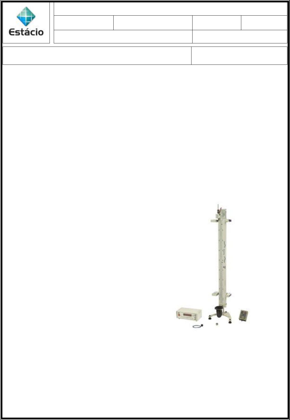 Universidade Estácio de Sá – Campus Macaé Curso: Engenharias Disciplina: Física Experimental Código: CCE0477 Turma: Professor (a): ROBSON FLORENTINO Data de Realização: 29/10/2012 Nome do Experimento: Queda Livre Objetivos: Ao final deste experimento o aluno deverá: Identificar o MRUV e compará-lo com o movimento de queda livre; Determinar, aproximadamente, o valor da aceleração da gravidade no local. Introdução teórica: A Terra possui um campo gravitacional. Dentro deste campo, toda a matéria é atraída para o centro do planeta até que encontre um obstáculo. Durante a história, vários estudiosos tentaram entender este movimento. Aristóteles foi o primeiro a formular uma ideia sobre isso. Segundo ele, dois corpos de massas diferentes cairiam com velocidades diferentes se abandonados a certa altura do solo. Essa ideia permaneceu como regra durante muito tempo. Até que Galileu Galilei formulou um experimento de forma que a resistência do ar não interferisse significativamente nos corpos durante a queda. Nesse experimento ele comprovou que: corpos de diferentes massas caem a mesma velocidade quando a resistência do ar é nula ou desprezível. A esse movimento deu-se o nome de Queda Livre. ③ Aparelhos utilizados:⑥ Painel vertical Tripé universal; Bobina; Esfera; Aparador; ① Sensores fotoelétricos; Cronômetro digital; Prumo; ⑥ ⑦ ⑤ ② ④ ⑧ Roteiro do experimento: Monte e nivele o equipamento necessário de acordo com orientação do professor; Ajuste os sensores no painel vertical com S1 na posição 0mm e S2 na posição 800mm; Energize a bobina e trave a esfera acima do sensor S1; Solte a esfera e anote os dados obtidos; Repita o procedimento com mais 5 posições diferentes para S2 (3 vezes cada, para certificação do resultado); Converta os dados necessários; Utilizando a equação de espaço em queda livre e a velocidade inicial do sistema dada pelo professor, calcule as velocidades para as 6 posições de observação; Preencha a tabela; Construa em papel milimetrado os gráficos do espaço e da velocidade em função do tempo; Calcule a área do gráfico velocidade em função do tempo e compare o resultado com o observado no experimento; Calcule a incerteza do resultado da gravidade obtido no experimento. Use gt = 9,81 m/s2. Dados coletados: Vide tabela 1. Cálculos: Transformando milímetros (mm) em metros (m): 450mm = 0,45m 500mm = 0,5m 600mm = 0,6m 700mm = 0,7m 800mm = 0,8m .tmédio (tabela 1) Tempo médio de 0 à 0,45m Tempo médio de 0 à 0,5m Tempo médio de 0 à 0,6m Tempo médio de 0 à 0,7m Tempo médio de 0 à 0,8m Aceleração do sistema: h = h0 + v0t + 0,8 = 0 + 0,4 . 0,381 + 1,6 = 0,152 + 0,145g 1,448 = 0,145g g = 9,986 m/s2 Incerteza do resultado obtido: Cálculo das velocidades: V = V0 + a.t Velocidade 1 Velocidade 2 Velocidade 3 Velocidade 4 Velocidade 5 v1 = 9,986*0,281 v1 = 2,806m/s v2 = 9,986*0,298 v2 = 2,975m/s v3 = 9,986*0,328 v3 = 3,275m/s v4 = 9,986*0,355 v4 = 3,545m/s v5 = 9,986*0,381 v5 = 3,804m/s Área do gráfico ‘velocidade x tempo’: A = 0,798m Tabelas e Gráficos: Tabela 1: Dados Coletados Distância (m) t1 (s) t2 (s) t3 (s) tm (s) 0,45 0,281 0,280 0,281 0,281 0,5 0,298 0,298 0,298 0,298 0,6 0,328 0,328 0,328 0,328 0,7 0,356 0,355 0,355 0,355 0,8 0,384 0,382 0,382 0,381 Tabela 2: Espaço (m) S0 = 0 S1 = 0,45 S2 = 0,5 S3 = 0,6 S4 = 0,7 S5 = 0,8 Tempo (s) T0 = 0 T1 = 0,281 T2 = 0,289 T3 = 0,328 T4 = 0,355 T5 = 0,381 Velocidade (m/s) V0 = 0,4 V1 = 2,8 V2 = 2,97 V3 = 3,27 V4 = 3,54 V5 = 3,8 Gráficos em anexo. Análise dos resultados: Ao final deste experimento podemos concluir que o movimento de queda livre pertence ao M.R.U.V. Isso foi comprovado já que ao analisarmos o fenômeno em diferentes distâncias, vimos que a velocidade do corpo varia (aumenta) de acordo com o tempo. Isso se deve à atividade do campo gravitacional da Terra sobre os corpos próximos à sua superfície. É válido lembrar que neste experimento, tornamos a resistência do ar desprezível utilizando uma esfera metálica como corpo em queda.