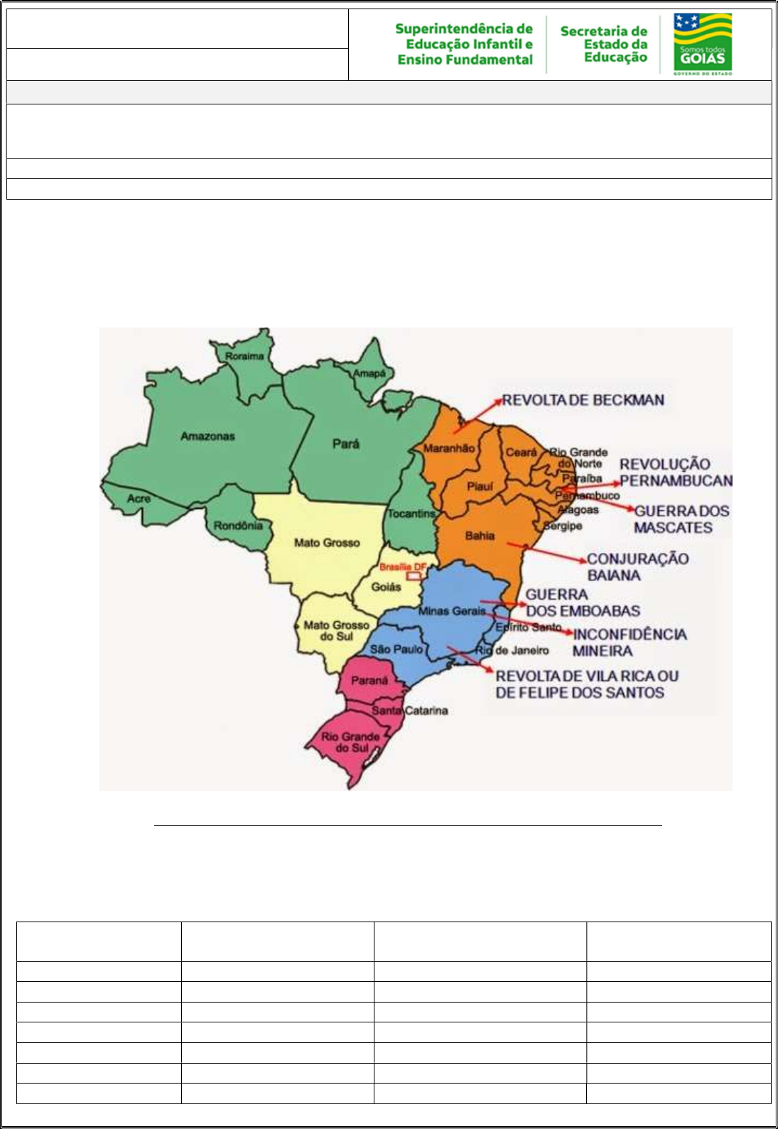 I- OBJETO DE CONHECIMENTO: Rebeliões na América portuguesa: as conjurações mineiras e baiana II- ATIVIDADES: 1. Observe no mapa a seguir – “Brasil: das conjurações à independência” nele está representado os movimentos sociais e rebeliões na América portuguesa. Disponível em: http://gohannippo.blogspot.com/2018/06/crise-no-sistema-colonial-brasileiro.html Acesso em: 07 de maio de 2020. Relacione as revoltas representadas no mapa, pesquise sobre elas, destacando o local, as causas e as principais reivindicações destes movimentos e preencha o quadro a seguir: Revolta ou conjuração Local Causas Reivindicação 8º ANO HISTÓRIA PERÍODO DE REVISÃO – 2ª semana Habilidades Essenciais: (GO-EF08HI05) Explicar os movimentos e as rebeliões da América portuguesa, articulando as temáticas locais e suas interfaces com processos ocorridos na Europa e nas Américas. Nome: Unidade Escolar: 2. Qual dessas revoltas reivindicava o fim da escravidão e igualdade entre negros e brancos? 3. A Inconfidência Mineira e a Conjuração Baiana foram movimentos que ocorreram no final do período colonial e que tinham características semelhantes. Identifique quais são as características que são semelhantes nos dois movimentos e escreva-as no seu caderno. 4. O infográfico a seguir representa as revoltas na América Portuguesa. Quais delas tinham interesses na independência do Brasil? 5. Segundo as informações do infográfico qual é a diferença do caráter das revoltas de Beckman, Gerra dos Mascates e Revolta de Vila Rica com os da Conjuração Baiana e inconfidência Mineira? Disponível em: http://www.blogdofariasjunior.com/2018/10/coluna-do-professor-pixote-brasil.html Acesso em: 07 de jul. de 2020. 6. A inconfidência Mineira e a Conjuração Baiana foram dois movimentos sociais importante e articulavam as temáticas locais e suas interfaces com processos ocorridos na Europa e nas Américas. Pesquise e elabore um quadro comparativo destes dois movimentos e destaque no quadro os principais elementos desta articulação. TABELA COMPARATIVA ENTRE A INCONFIDÊNCIA MINEIRA (1789) E A CONJURAÇÃO BAIANA OU REVOLTA DOS ALFAIATES (1798) Causas imediatas Inspiração ideológica Exemplo inspirador Aspiração Governo proposto Liderança Proposta social Quem foi punido Tipo de punição Disponível em: emad.fflch.usp.br/node/5321 Acesso em: 07 de jul. de 2020.