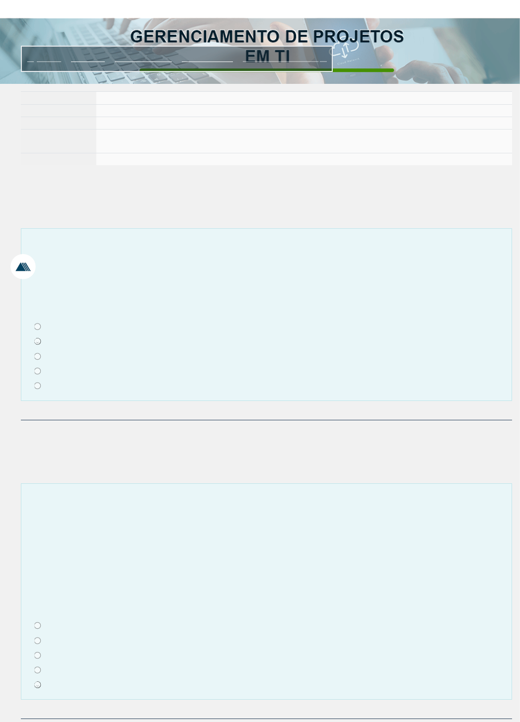 Página inicial / Meus Cursos / ENIAC_20212F_14484 / Materiais de Estudo / Unidade 2 - Exercícios de Cxação Iniciado em segunda, 23 ago 2021, 11:22 Estado Finalizada Concluída em segunda, 23 ago 2021, 11:29 Tempo empregado 7 minutos 42 segundos Avaliar 10,00 de um máximo de 10,00(100%) Questão 1 Correto Atingiu 1,00 de 1,00 Questão 2 Correto Atingiu 1,00 de 1,00 Sua companhia pode aceitar três possíveis projetos. O Projeto A tem um VPL de R$30.000,00 e levará seis meses para ser Cnalizado. O Projeto B tem um VPL de R$60.000,00 e levará três anos para terminar. Já o Projeto C terminará em dois anos e tem um VPL de R$90.000,00. Baseado nesta informação, qual destes projetos você selecionaria? Escolha uma: a. Projeto A b. Projeto C ! c. Os três. d. Projetos A e B. e. Projeto B Você é um gerente de projeto de uma companhia de desenvolvimento de negócios trabalhando em um novo produto de software. O patrocinador do projeto informou que ele deverá ser concluído até 1º de setembro. A companhia planeja a demonstração do novo produto em uma feira de negócios prevista para setembro e, portanto, precisa do projeto concluído a tempo. O patrocinador, porém, também informou que o orçamento foi fechado em R$85.000,00 e que devido aos cortes orçamentários deste ano pode ser complicado aumentá-lo. Você tem que concluir o projeto de acordo com as condições iniciais apresentadas. Qual das seguintes alternativas é a principal restrição para esse projeto? Escolha uma: a. Comunicação b. Orçamento c. Risco d. Qualidade e. Tempo ! 23/08/2021 11:52 Página 1 de 5 Questão 3 Correto Atingiu 1,00 de 1,00 Questão 4 Correto Atingiu 1,00 de 1,00 Questão 5 Correto Atingiu 1,00 de 1,00 O Projeto X tem um período de payback de 36 meses. O Projeto Y tem payback de 48 meses, tem um custo de R$450.000,00 com rendimentos esperados de R$200.000,00 para o primeiro ano, e de R$50.000,00 para o triênio seguinte. Qual projeto você deve recomendar? Escolha uma: a. Projeto Y, devido a ele apresentar informações de rendimento, que são critérios de seleção mais objetivos que o payback . ! b. Projeto Y, devido ao período de payback maior. c. Projeto Y, devido ao rendimento de R$50.000,00 no primeiro triênio. d. Projeto Y, pois apresenta um rendimento de R$200.000,00 no primeiro ano. e. O projeto X,devido ao período de payback menor. Durante a execução do projeto, sua equipe faz uma entrega parcial do projeto ao comprador. Contudo, ele recusa a entrega, aCrmando que não está de acordo com os requisitos da página 300 da especiCcação técnica. Você revê o documento e concorda com a aCrmação do comprador. Qual é a melhor ação a ser tomada? Escolha uma: a. Convocar uma reunião com a equipe para rever os requisitos da página 300. b. Emitir uma ordem de mudança. c. Explicar à sua equipe que o contrato está errado e deve ser alterado. d. Rever os requisitos e se encontrar com o responsável pela entrega do projeto, na equipe, para rever o dicionário de EAP. ! e. Deixar que o problema se resolva sozinho. O Projeto X tem duração estimada de 3 anos e VPL de R$70.000,00, e o Projeto Y tem duração estimada de 5 anos e VPL de R$60.000,00. Qual é o custo de oportunidade do Projeto X? Escolha uma: a. R$35.000,00 b. R$210.000,00 c. R$70.000,00 d. R$60.000,00 ! e. R$130.000,00 23/08/2021 11:52 Página 2 de 5 Questão 6 Correto Atingiu 1,00 de 1,00 Questão 7 Correto Atingiu 1,00 de 1,00 Questão 8 Correto Atingiu 1,00 de 1,00 Você está trabalhando com uma organização e descobre que uma das partes interessadas não está divulgando todos os custos envolvidos com um projeto futuro. Além disso, esse proCssional da gerência de projetos está construindo uma EAP que não inclui todo o trabalho necessário para completar o projeto. O que você deve fazer? Escolha uma: a. Confrontar o gerente de projeto imediatamente. b. Ignorar o problema. c. Escrever um e-mail para a cheCa da gerência de projetos. d. Fazer você mesmo a EAP sem suporte de nenhum outro funcionário. e. Conversar com o gerente de projeto sobre a EAP para que ele a refaça e renita os custos reais do projeto. ! Das alternativas listadas abaixo, qual melhor representa o papel dos projetos no planejamento estratégico? Escolha uma: a. Os projetos devem retroalimentar o planejamento estratégico, a Cm de se avaliar o nível de seu cumprimento. ! b. Os projetos não têm nenhuma importância no planejamento estratégico c. Deve-se desvincular os projetos da estratégia, uma vez que um poder prejudicar o outro. d. Os projetos permitem a elaboração do planejamento estratégico. e. Projetos permitem a não realização da estratégia, devido à necessidade de foco nas operações. A EAP representa uma das mais importantes estruturas do documento gerado durante o planejamento do projeto, servindo de base para outras áreas de conhecimento na gestão dos projetos. A estrutura analítica do projeto é: Escolha uma: a. Cxa e não se altera ao longo do projeto. b. necessária, como parte do termo de abertura do projeto. c. desnecessária para a gestão de riscos do projeto. d. necessária, como parte da declaração do escopo do projeto. e. usada para decompor o projeto em componentes menores, mais facilmente gerenciáveis. ! 23/08/2021 11:52 Página 3 de 5 Questão 9 Correto Atingiu 1,00 de 1,00 Questão 10 Correto Atingiu 1,00 de 1,00 O gerente de projeto é responsável pelo sucesso ou fracasso deste, e é responsável pela condução do planejamento. Você é um gerente de projetos e acaba de coletar os requisitos e deCnir o escopo do projeto. O que deverá ser feito em seguida? Escolha uma: a. A deCnição do escopo. b. O controle do escopo. c. A análise do valor. d. A validação do escopo. e. Criar a EAP. ! Após a seleção do projeto torna-se muito importante gerar a documentação dos projetos que irão compor o portfólio da organização. O documento, que descreve os objetivos, a justiCcativa, as entr