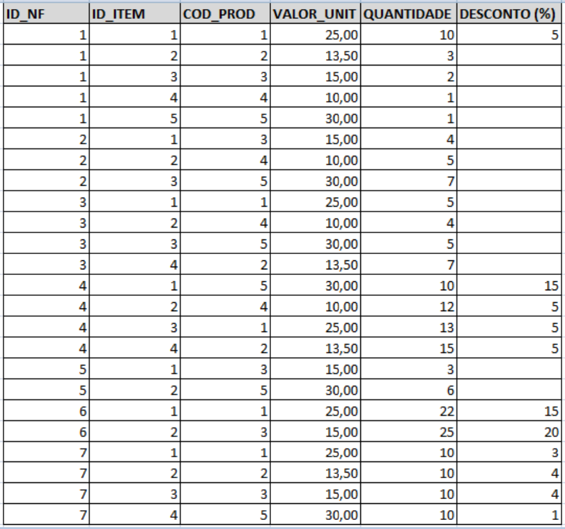 1. Crie, no seu banco de dados, a tabela abaixo, insira os valores apresentados e em seguida escreva as consultas solicitadas abaixo. OBS: Os valores em branco devem ser nulos no banco de dados. a) Pesquise os itens que foram vendidos sem desconto. As colunas presentes no resultado da consulta são: ID_NF, ID_ITEM, COD_PROD E VALOR_UNIT. b) Pesquise os itens que foram vendidos com desconto. As colunas presentes no resultado da consulta são: ID_NF, ID_ITEM, COD_PROD, VALOR_UNIT E O VALOR VENDIDO. OBS: O valor vendido é igual ao VALOR_UNIT - (VALOR_UNIT*(DESCONTO/100)). c) Altere o valor do desconto (para zero) de todos os registros onde este campo é nulo. d) Pesquise os itens que foram vendidos. As colunas presentes no resultado da consulta são: ID_NF, ID_ITEM, COD_PROD, VALOR_UNIT, VALOR_TOTAL, DESCONTO, VALOR_VENDIDO. OBS: O VALOR_TOTAL é obtido pela fórmula: QUANTIDADE * VALOR_UNIT. O VALOR_VENDIDO é igual a VALOR_UNIT - (VALOR_UNIT*(DESCONTO/100)). e) Pesquise o valor total das NF e ordene o resultado do maior valor para o menor. As colunas presentes no resultado da consulta são: ID_NF, VALOR_TOTAL. OBS: O VALOR_TOTAL é obtido pela fórmula: ∑ QUANTIDADE * VALOR_UNIT. Agrupe o resultado da consulta por ID_NF. f) Pesquise o valor vendido das NF e ordene o resultado do maior valor para o menor. As colunas presentes no resultado da consulta são: ID_NF, VALOR_VENDIDO. OBS: O VALOR_TOTAL é obtido pela fórmula: ∑ QUANTIDADE * VALOR_UNIT. O VALOR_VENDIDO é igual a ∑ VALOR_UNIT - (VALOR_UNIT*(DESCONTO/100)). Agrupe o resultado da consulta por ID_NF. g) Consulte o produto que mais vendeu no geral. As colunas presentes no resultado da consulta são: COD_PROD, QUANTIDADE. Agrupe o resultado da consulta por COD_PROD. h) Consulte as NF que foram vendidas mais de 10 unidades de pelo menos um produto. As colunas presentes no resultado da consulta são: ID_NF, COD_PROD, QUANTIDADE. Agrupe o resultado da consulta por ID_NF, COD_PROD. i) Pesquise o valor total das NF, onde esse valor seja maior que 500, e ordene o resultado do maior valor para o menor. As colunas presentes no resultado da consulta são: ID_NF, VALOR_TOT. OBS: O VALOR_TOTAL é obtido pela fórmula: ∑ QUANTIDADE * VALOR_UNIT. Agrupe o resultado da consulta por ID_NF. j) Qual o valor médio dos descontos dados por produto. As colunas presentes no resultado da consulta são: COD_PROD, MEDIA. Agrupe o resultado da consulta por COD_PROD. k) Qual o menor, maior e o valor médio dos descontos dados por produto. As colunas presentes no resultado da consulta são: COD_PROD, MENOR, MAIOR, MEDIA. Agrupe o resultado da consulta por COD_PROD. l) Quais as NF que possuem mais de 3 itens vendidos. As colunas presentes no resultado da consulta são: ID_NF, QTD_ITENS. OBS:: NÃO ESTÁ RELACIONADO A QUANTIDADE VENDIDA DO ITEM E SIM A QUANTIDADE DE ITENS POR NOTA FISCAL. Agrupe o resultado da consulta por ID_NF. 2. Crie uma base de dados Universidade com as tabelas a seguir: Alunos (MAT, nome, endereço, cidade) Disciplinas (COD_DISC, nome_disc, carga_hor) Professores (COD_PROF, nome, endereço, cidade) Turma (COD_DISC, COD_TURMA, COD_PROF, ANO, horário) COD_DISC referencia Disciplinas COD_PROF referencia Professores Histórico (MAT, COD_DISC, COD_TURMA, COD_PROF, ANO, frequência, nota) MAT referencia Alunos COD_DISC, COD_TURMA, COD_PROF, ANO referencia Turma INSIRA OS SEGUINTES REGISTROS: ALUNOS: (2015010101, JOSE DE ALENCAR, RUA DAS ALMAS, NATAL) (2015010102, JOÃO JOSÉ, AVENIDA RUY CARNEIRO, JOÃO PESSOA) (2015010103, MARIA JOAQUINA, RUA CARROSSEL, RECIFE) (2015010104, MARIA DAS DORES, RUA DAS LADEIRAS, FORTALEZA) (2015010105, JOSUÉ CLAUDINO DOS SANTOS, CENTRO, NATAL) (2015010106, JOSUÉLISSON CLAUDINO DOS SANTOS, CENTRO, NATAL) DISCIPLINAS: (BD, BANCO DE DADOS, 100) (POO, PROGRAMAÇÃO COM ACESSO A BANCO DE DADOS, 100) (WEB, AUTORIA WEB, 50) (ENG, ENGENHARIA DE SOFTWARE, 80) PROFESSORES: (212131, NICKERSON FERREIRA, RUA MANAÍRA, JOÃO PESSOA) (122135, ADORILSON BEZERRA, AVENIDA SALGADO FILHO, NATAL) (192011, DIEGO OLIVEIRA, AVENIDA ROBERTO FREIRE, NATAL) TURMA: (BD, 1, 212131, 2015, 11H-12H) (BD, 2, 212131, 2015, 13H-14H) (POO, 1, 192011, 2015, 08H-09H) (WEB, 1, 192011, 2015, 07H-08H) (ENG, 1, 122135, 2015, 10H-11H) HISTÓRICO: INSIRA VALORES PARA TODOS OS ALUNOS EM TODAS AS DISCIPLINAS a) Encontre a MAT dos alunos com nota em BD em 2015 menor que 5 (obs: BD = código da disciplinas). b) Encontre a MAT e calcule a média das notas dos alunos na disciplina de POO em 2015. c) Encontre a MAT e calcule a média das notas dos alunos na disciplina de POO em 2015 e que esta média seja superior a 6. d) Encontre quantos alunos não são de Natal.