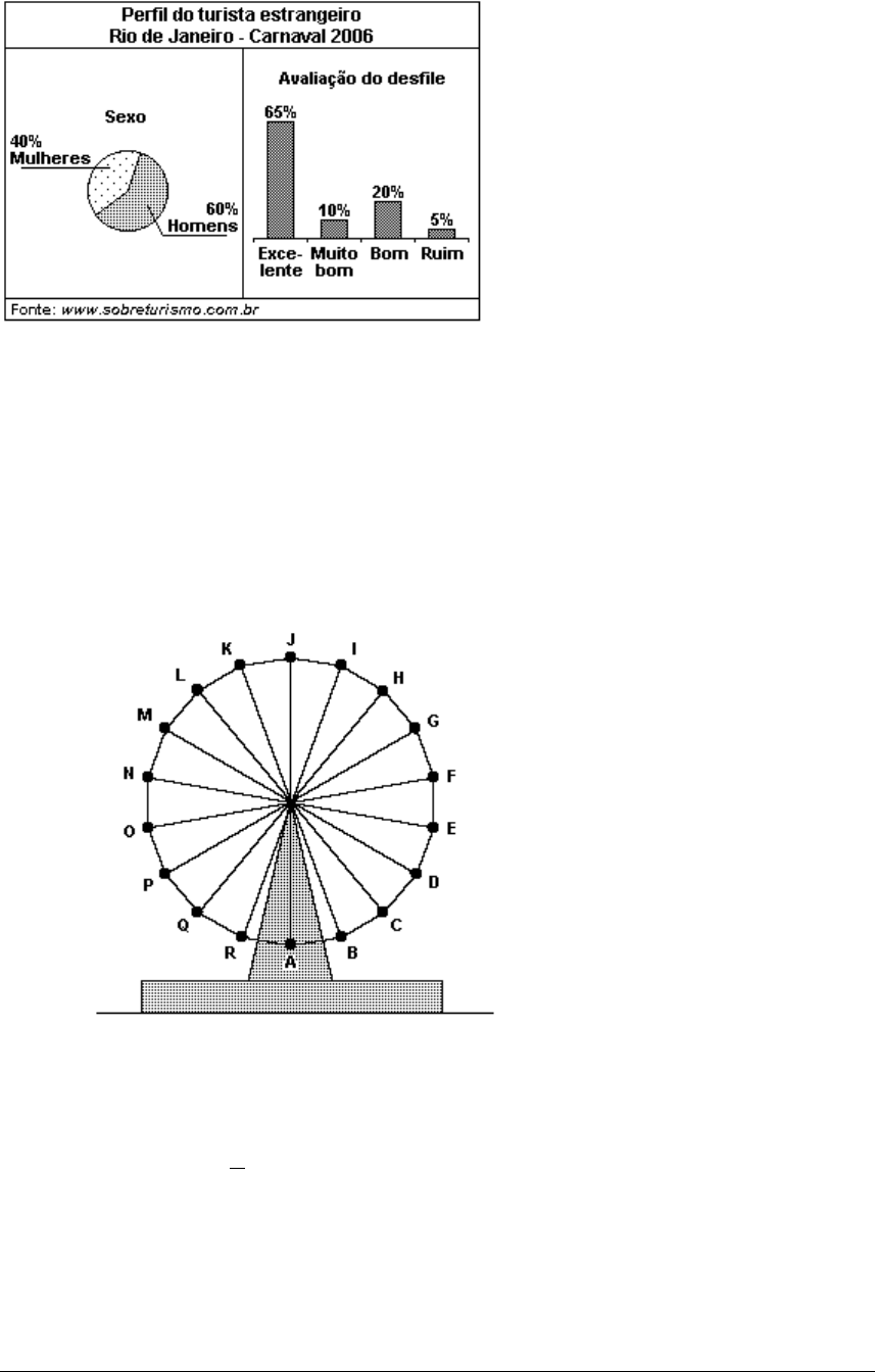 DESAFIO 20 DE MATEMATICA Página 1 de 8 1. O Curso de Turismo da "UniverCidade" realizou uma pesquisa com 1.000 turistas estrangeiros que estavam na cidade do Rio de Janeiro durante o período de Carnaval. A partir dos dados e supondo que em cada critério da avaliação do desfile os percentuais de homens e mulheres mantenham-se os mesmos que os apresentados no gráfico de setores, pode-se afirmar que o número de mulheres que avaliaram o desfile como bom foi a) 400. b) 200. c) 100. d) 80. e) 40. 2. A roda-gigante de um parque de diversões tem dezoito cadeiras, igualmente espaçadas ao longo do seu perímetro e move-se no sentido anti-horário, isto é, no sentido contrário ao dos ponteiros do relógio. Na figura, as letras A, B, C, ... e R indicam as posições em que as cadeiras ficam cada vez que a roda gigante para. Com a roda gigante parada, Bruna senta-se na cadeira que está na posição A, posição mais baixa da roda gigante. A roda gigante move-se 5 6 de uma volta e para. Nesse momento, a letra relativa à posição da cadeira ocupada por Bruna é a) D. b) I. c) K. d) P. e) R. DESAFIO 20 DE MATEMATICA Página 2 de 8 3. Um dos passatempos de Júlia é jogar o sudoku, um quebra-cabeça lógico que virou uma febre mundial. Como estratégia para preencher a grade de sudoku a seguir, Júlia começou analisando as possibilidades de preenchimento da oitava linha e deduziu, corretamente, qual o número a ser colocado na casa marcada com a bolinha preta. Como se joga o Sudoku O objetivo do jogo é preencher uma grade 9×9, subdividida em quadrados 3×3, com os números de 1 a 9, de modo que cada número apareça uma única vez em cada linha, em cada coluna e em cada quadrado 3×3. O número colocado por Júlia foi a) 1. b) 4. c) 6. d) 7. e) 9. 4. Quando estava lendo uma reportagem sobre a sua banda favorita, Paula observou que havia um borrão de tinta no texto, como é mostrado a seguir: Curiosa, Paula determinou que o número de ingressos oferecidos para a área vip foi a) 260. b) 400. c) 540. d) 760. DESAFIO 20 DE MATEMATICA Página 3 de 8 e) 910. 5. Por que Dinheiro? Pesquisas arqueológicas indicam que as moedas surgiram há quase 4 mil anos (2.500 a.C.), o que torna o dinheiro tão antigo quanto as pirâmides do Egito. A primeira moeda cunhada em Roma foi feita em 268 a.C., e se chamava denário - termo que é a origem da palavra dinheiro. (Adaptado de: <http://www.canalkids.com.br> acessado em 12/03/2008) Em um teatro, os aposentados têm um desconto de 20% sobre o preço do ingresso vendido na bilheteria. O Sr. Mateus, que é aposentado, aproveitando-se desse desconto, pagou R$23,00 pelo ingresso no teatro. O valor do ingresso na bilheteria, sem o desconto, é a) R$ 27,00. b) R$ 27,60. c) R$ 28,00. d) R$ 28,75. e) R$ 29,75. 6. Leia o texto a seguir. Tales, o grande matemático do século VI a.C., foi também um próspero comerciante. Certa vez, visitou o Egito em viagem de negócios. Nessa ocasião, ele assombrou o faraó e toda a corte egípcia, medindo a sombra da pirâmide de Quéops, cuja base é um quadrado de 230 metros de lado. Para calcular a altura da pirâmide, Tales fincou verticalmente no solo uma estaca que ficou com altura de 1 metro acima do solo. As medidas dos comprimentos da sombra da pirâmide e da sombra da estaca são, respectivamente, 255 metros e 2,5 metros. (Adaptado de: JAKUBOVIC, J., CENTURION, M. e LELLIS, M.C. "Matemática na Medida Certa".Volume. São Paulo: Scipione) DESAFIO 20 DE MATEMATICA Página 4 de 8 Com base nas informações do texto e das figuras, é válido afirmar que a altura da pirâmide, em metros, é a) 14,80. b) 92,50. c) 148. d) 925. e) 1.480. 7. Eduardo e Mônica estavam brincando de adivinhações com números inteiros positivos. Ao ouvir a resposta de Mônica, Eduardo imediatamente revelou o número original que Mônica havia pensado. O número que Mônica havia pensado era um a) divisor de 12. b) divisor de 15. c) divisor de 24. d) múltiplo de 5. e) múltiplo de 12. 8. Pensando em contribuir com uma alimentação mais saudável para a sua família, o Sr. João está planejando uma horta em um espaço retangular de 1,56 m por 84 cm, disponível em seu quintal. Ele inicia o preparo da horta dividindo o comprimento e a largura do terreno em partes iguais, todas de mesma medida inteira, quando expressas em centímetros. Dessa maneira, o Sr. João formou, na superfície do terreno, um quadriculado composto por quadrados congruentes de modo que as medidas das arestas de cada quadrado tivessem o maior valor possível.Sua intenção é plantar, no centro de cada quadrado obtido, uma única muda. DESAFIO 20 DE MATEMATICA Página 5 de 8 Nessas condições, a quantidade máxima de mudas que pode ser plantada é a) 54. b) 76. c) 91. d) 120. e) 144. 9. Ter condições de acessibilidade a espaços e equipamentos urbanos é um direito de todo cidadão. A construção de rampas, nas entradas de edifícios que apresentam escadas, garante a acessibilidade principalmente às pessoas com deficiência física ou com mobilidade reduzida. Pensando nisso, na entrada de uma ETEC onde há uma escada de dois degraus iguais, cada um com 15 cm de altura, pretende-se construir uma rampa para garantir a acessibilidade do prédio a todos. Essa rampa formará com o solo um ângulo de 30, conforme a figura. Sendo assim, conclui-se que o comprimento da rampa será, em metros, a) 6. b) 5. c) 4. d) 3. e) 2. 10. O Sr. João precisa trocar as telhas da sua casa. Pesquisando nas lojas de material de construção, optou por uma ecotelha. A ecotelha é uma telha ondulada produzida com material reciclável como tubos de pasta de dentes. Entre outras características, ela apresenta elevada resistência à ação dos raios ultravioleta e infravermelhos; não absorve umidade; permite o isolamento térmico; além de ter custo acessível e substituir, com vantagens, o perigoso cimento-amianto. (Adaptado de: http://www.arq.ufsc.br/arq5661/trabalhos_2003-1/ecovilas/ecotelha