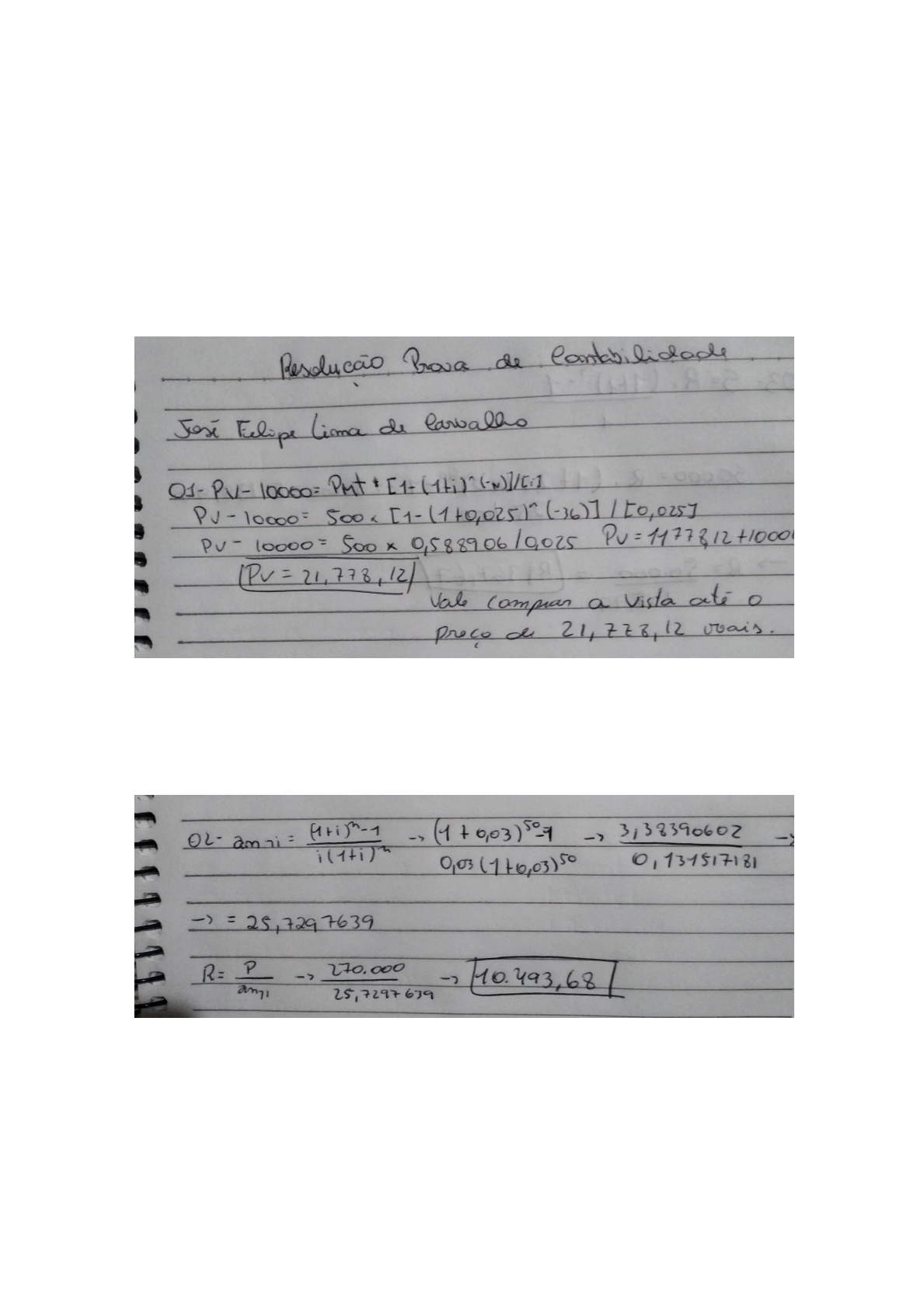 UFPE/CCSA/DCA INTRODUÇÃO À FINANÇAS – 2020.2 – NOITE – 02.08.2021 AVALIAÇÃO ANUIDADES – CAP. 5 para compor a nota do 1º EE NOME: José Felipe Lima de Carvalho CPF: 103.459.834/16 1. Um terreno é vendido por $ 10.000,00 de entrada e 36 prestações mensais de $ 500,00. Sabendo-se que a taxa de juros corrente no mercado é de 2,5% a.m., até que preço vale a pena comprar o terreno à vista? 2. Um sítio é posto à venda por$ 300.000,00 à vista, ou a prazo nas seguintes condições: 10% de entrada e o restante em 50 meses, com juros de 3% a.m. Qual é o valor das prestações? 3. Quanto se deverá depositar mensalmente para que, ao fim de 5 anos, não se processando nenhuma retirada, se tenha $ 50.000,00. Considerar que a instituição paga 2,5% a.m. sobre o saldo credor. 4. Uma pessoa, planejando a construção de uma casa, prevê dispêndios mensais de $ 100.000,00 nos meses de setembro, outubro e novembro. Quanto deve ser depositado mensalmente de janeiro a agosto, do mesmo ano, para que seja possível efetuar tais retiradas? Considerar remuneração de 2% a.m. sobre os depósitos.
