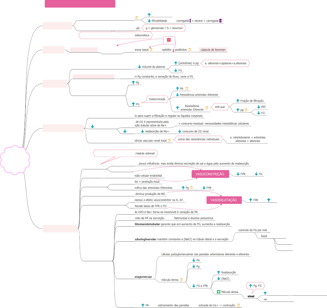 P = pressão hidrostática / p = pressão coloidosmótica + norepinefrina e epinefrina da medula adrenal Filtração glomerular FG = Kf x PEF Kf = permeabilidade x superfície de contato Pressão Efetiva de Filtração = Pg - Pb - pg + pb Barreiras corrente sanguínea membrana basal endotélio fenestrado peso molecular A filtração À medida que o sangue passa no glomérulo Fração de filtração = FG / FPR Mesmo com Pg constante, a variação do fluxo, varia a FG FG é regulada, principalmente, pela Pg Fluxo sanguíneo renal 22% do DC - maior que o necessário para suprir a filtração e regular os líquidos corporais extração de O2 consumo de O2 é representado pela reabsorção tubular ativa de Na+ FG FPR = P a. renal - P v. renal / resistência vascular renal total O controle do FPR SNA simpático forte ativação ativação leve Endotelina liberada em caso de lesão celular endotelial Angiotensina II hormônio circulante + produção local Constrição específica das arteríolas Eferentes Óxido nítrico lesão ao endotélio - diminui produção de NO Prostaglandinas e Bradicininas ameniza o efeito vasoconstritor na A, AF. FG evitando baixa de FPR e FG AUTORREGULAÇÃO A excreção de H2O e Na+ torna-se insensível à variação de PA O Balanço Glomerulotubular O efeito discreto da PA na excreção Feedback tubulogloerular controle da FG por meio feedback arteriolar aferente eferente Complexo justaglomerular renina e ANGII vasoconstrição eferente vasodilatação aferente Miogênica Luana Gonçalves Ferreira - UPE - Gus - 09