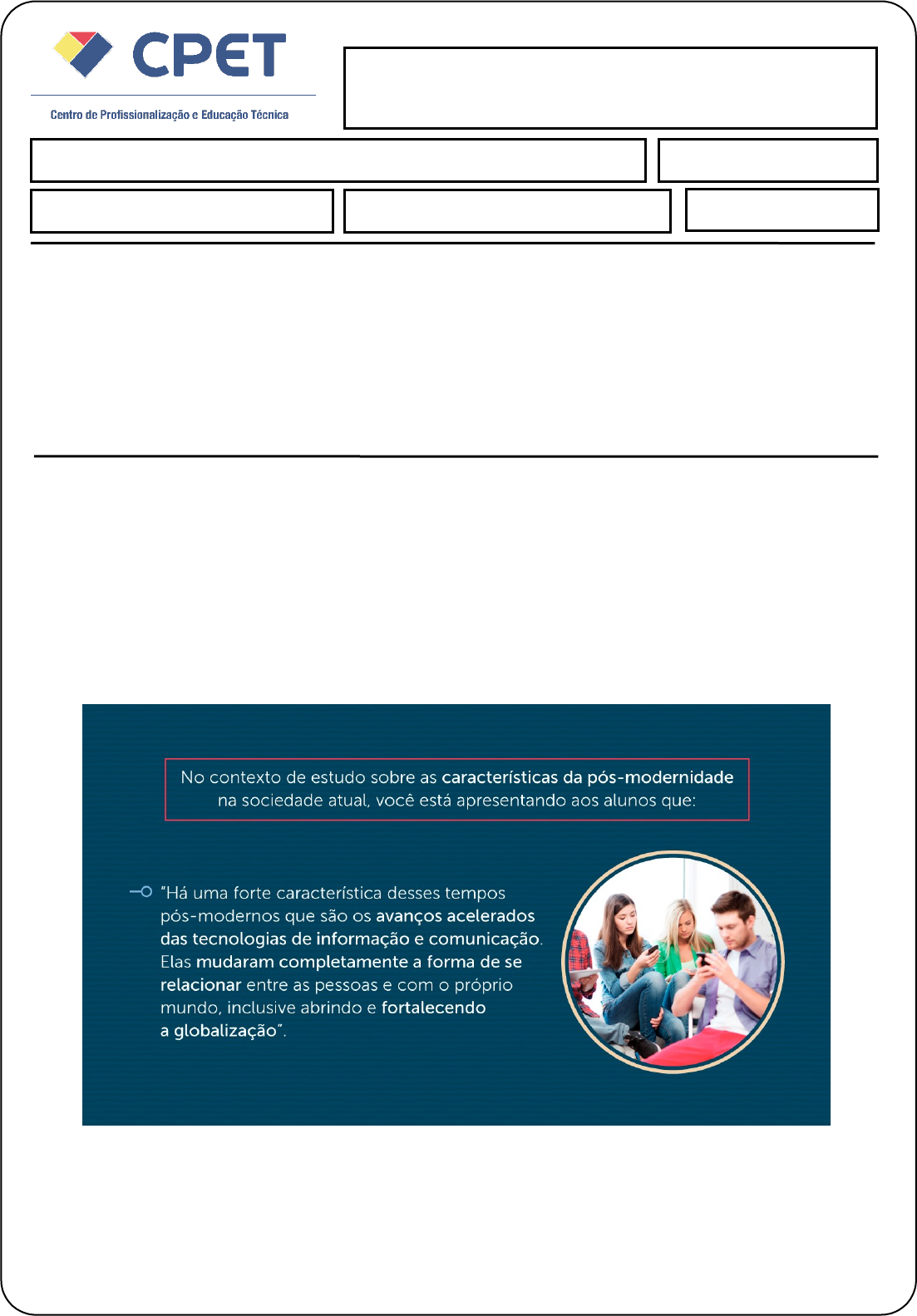 Teoria da História e Historiografia Aluno (a): Data: 27 / 05 / 2021. Avaliação Pesquisa/Prática NOTA: INSTRUÇÕES: · Esta Avaliação contém 1 (uma) questão, totalizando 10 (dez) pontos. · Você deve preencher dos dados no Cabeçalho para sua identificação · Nome / Data de entrega · As respostas devem ser digitadas abaixo de cada pergunta. · Ao terminar, grave o arquivo com o nome Avaliação Pesquisa/Prática. · Envio o arquivo pelo sistema. Muitos fenômenos constituem as características da pós-modernidade, mas a sua identificação é perceptível, na contemporaneidade, nas transformações constantes da tecnologia e das relações sociais, assim como, nos movimentos culturais que apresentam a relatividade sobre as concepções, antes propostas como dogmas de verdades absolutas. Atualmente, características como o relativismo e a indiferença nos processos intelectuais ou nas investigações científicas são elementos naturais e aceitáveis como construção da história da humanidade. Suponha que você é professor de História do ensino fundamental. Para continuar com essa aula, responda as questões que você deve transmitir aos alunos: a) Quais recursos tecnológicos são testemunhos da pós-modernidade? São testemunhas da pós-modernidade o celular, notebook, o DVD, o CD, o MP3, a clonagem, o implante de órgão, próteses e órgãos artificiais engendram uma geração de seres em estados artificiais que colocam em xeque a originalidade ou naturalidade do humano. As invenções tecnológicas decodificadas como o computador, o relógio digital, o telefone celular, as secretarias eletrônicas, o vídeo, os satélites, as Nets redes (sistema htt// e www) e os códigos de barras são fatos da pós-modernidade. b) Como eles influenciam nas relações sociais da atualidade? A pós-modernidade tem predomínio do instantâneo, da perda de fronteiras, gerando a idéia de que o mundo está cada vez menor através do avanço da tecnologia, diante de um mundo virtual, imagem, som e texto em uma velocidade instantânea. Em verdade, um dos grandes méritos da pós-modernidade é o fato da relativa universalização do conhecimento, onde a globalização fez com que, via de regra, o acesso à muitos bens ou mesmo à informação ficasse mais próximo, alcançável, até mesmo para as classes menos favorecidas. Mudam-se valores e costumes: é o novo, o individualismo, que valem. A aceleração transforma o consumo numa rapidez onde quase tudo é descartável. A publicidade manipula desejos, promove e cria novas imagens e signos, eventos como espetáculos, valorizando o que a mídia dá ao transitório da vida. As telecomunicações possibilitam imagens vistas em todas as partes do planeta, facilitando a mercadificação de coisas e gostos. Avaliação Pesquisa/Prática