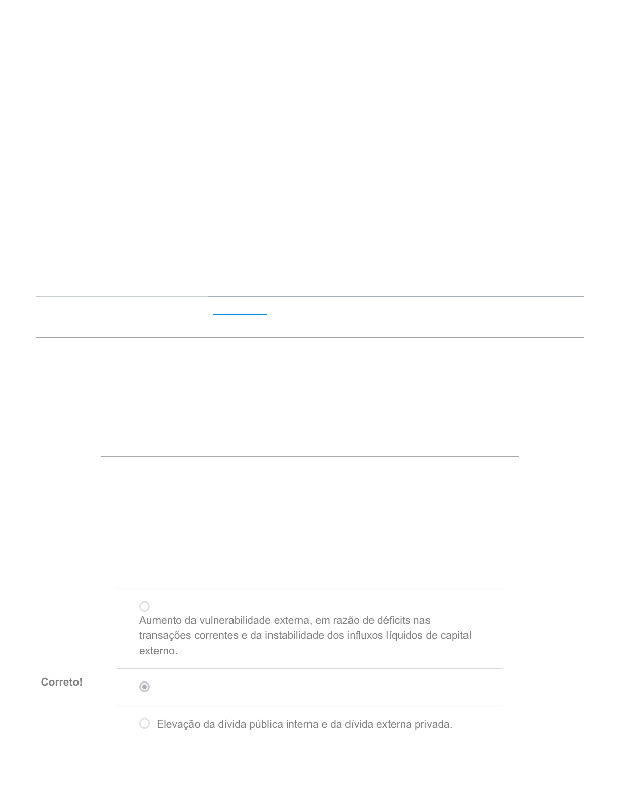 Atividade Objetiva 07 Entrega 5 de nov de 2018 em 1:00 Pontos 4 Perguntas 2 Disponível 21 de out de 2018 em 23:00 - 5 de nov de 2018 em 23:59 15 dias Limite de tempo Nenhum Este teste não está mais disponível, pois o curso foi concluído. Histórico de tentativas Tentativa Tempo Pontuação MAIS RECENTE Tentativa 1 11 minutos 4 de 4 Pontuação deste teste: 4 de 4 Enviado 5 de nov de 2018 em 10:31 Esta tentativa levou 11 minutos. 2 / 2 ptsPergunta 1 As reformas liberalizantes dos anos 1990 (privatizações e aberturas comercial e financeira), juntamente com a apreciação cambial e taxa de juros elevada, impactaram fortemente a dinâmica macroeconômica do país, com os seguintes efeitos, EXCETO. Aumento da vulnerabilidade externa, em razão de déficits nas transações correntes e da instabilidade dos influxos líquidos de capital externo. Barateamento das tarifas de serviços públicos.Correto!Correto! Elevação da dívida pública interna e da dívida externa privada. Atividade Objetiva 07: Tópicos em Economia Brasileira - 2018/2 https://pucminas.instructure.com/courses/910/quizzes/5846 1 of 3 24/08/2021 16:43 https://pucminas.instructure.com/courses/910/quizzes/5846/history?version=1 https://pucminas.instructure.com/courses/910/quizzes/5846/history?version=1 Limites à elevação de preços nos ramos produtores de bens comercializáveis, contribuindo para o combate à inflação. Barateamento das tarifas de serviços públicos. 2 / 2 ptsPergunta 2 Quanto à chamada crise da dívida externa brasileira da primeira metade da década de 80, é CORRETO afirmar que se enfrentou a crise com a geração de superávits comerciais e, para tanto, a adoção de um regime de câmbio nominal fixo foi fundamental. apesar da elevação da taxa de juros norte-americana em 1979 não houve dificuldade nos anos 80 em se obter recursos no sistema financeiro internacional, uma vez que o problema era o pagamento dos juros da dívida já existente. houve uma diminuição da inflação na primeira metade da década em função da recessão. a recessão ocorrida no Brasil dificultou ainda mais o enfrentamento da crise da dívida dado o efeito que essa recessão tinha de diminuir as exportações brasileiras. Atividade Objetiva 07: Tópicos em Economia Brasileira - 2018/2 https://pucminas.instructure.com/courses/910/quizzes/5846 2 of 3 24/08/2021 16:43 a redução das taxas de crescimento econômico e a desvalorização da taxa de câmbio permitiram a geração de superávits comerciais necessários para pagar os encargos da dívida externa. Correto!Correto! A queda na renda decorrente da redução das taxas de crescimento econômico (isso causa redução das importações) e a desvalorização da taxa de câmbio (isso causa o aumento das exportações) permitiram a geração de superávits comerciais necessários para pagar os encargos da dívida externa. Pontuação do teste: 4 de 4 Atividade Objetiva 07: Tópicos em Economia Brasileira - 2018/2 https://pucminas.instructure.com/courses/910/quizzes/5846 3 of 3 24/08/2021 16:43
