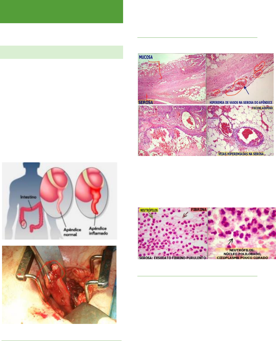 DOENÇAS INFLAMATÓRIAS INTESTINAIS Amanda Liberato – 4° período / Processos fisiopatológicos II APENDICITE → O apêndice é um divertículo verdadeiro normal do ceco e está sujeito a inflamação aguda ou crônica. → A apendicite é considerada uma inflamação aguda desse apêndice; → A inflamação surge devido à obstrução do lúmen do apêndice, podendo ser por fecálito (fezes petrificadas), fezes normais, hiperplasia linfoide e agentes infecciosos. * Incidência maior em homens. PATOGENIA → Aumento progressivo na pressão intraluminal, comprometendo o fluxo venoso de saída; → Causas: cálculo biliar, tumor, vermes, fezes, fecálito. → Aumento da proliferação bacteriana → Isquemia – inflamação catarral-aguda/ gangrenosa/supurativa/hiperplásica- edema tecidual; MORFOLOGIA → Vasos subserosos congestos: → Infiltrado de neutrófilos perivascular em todas as camadas; Ulcerações podem estarpresentes ou não; Casos graves com exsudação febrinopurulenta/ necrose hemorrágica gangrenosa. MANIFESTAÇÕES CLÍNICAS → Dor periumbilical no quadrante inferior direito; → Náusea, vômito e febre de baixo grau; → Sinal de McBurney positivo, perda de sensibilidade localizada a dois terço da distância entre umbigo e a espinha ilíaca anterossuperior direita. → Sinal de McBurney: dor ao realizar a descompressão. DOENÇA DIVERTICULAR → É uma condição patológica adquirida caracterizada por dilatações saculares/herniações (divertículos) da mucosa e da submucosa através das camadas musculares da parede intestinal e mais comuns no cólon esquerdo, principalmente no sigmoide; → Diverticulite: inflamação das hérnias; → Diverticulose: formação das bolhas (semelhante a hérnias); → Múltiplos; → Bolhas externas adquiridas: mucosa e submucosa do cólon que se projeta pela camada muscular do cólon; → Fatores de risco: dieta deficiente em fibras, rica em sal, obesidade, carnes e açucares; → Mais presente em pessoas acima de 60 anos. PATOGENIA → Hipotônico: instala-se como decorrência do afrouxamento da musculatura lisa do intestino; → Hipertônico: acontece quando há aumento anormal do tônus dessa mesma musculatura e pelo crescimento significativo da pressão do cólon. → Pontos fracos: locais de inserção dos vasos mesentéricos na parede intestinal. → A presenta da obstrução contrui para favorecer a proliferação de patógenos e, consequentemente, o surgimento da diverticulite. → A diverticulite pode apresentar um abcesso ou uma perfuração, ou seja, sangramento pode estar presente também. MORFOLOGIA → Pequenas bolsas externas em forma de cantil, podendo ter 0,5 a 1cm de diâmetro; → Distribuição regula lado a lado com as tênias do cólon; → Parede fina com mucosa achatada ou atrófica; → Submucosa é comprometida; → Muscular própria adelgaçada; → Hipertrofia da camada circular própria; → Pressão aumentada, o que pode ocasionar perfurações. → Classificação: DOENÇA CELÍACA → Enteropatia sensível ao glúten; → É mediada pelo sistema imunológico, disparada pela indigestão de alimentos que contém glúten, consequência de uma pré- disposição genética ou doenças autoimunes; PATOGENIA → Glúten → Gliadina (fração solúvel do glúten) → Gliadina induz as C. epiteliais a liberar IL-15 → Ativação de linfócitos CD8+ → Linfócitos expressam NKG2D e receptor MIC-A → Enterócitos expressando MIC-A → Linfócitos se diferenciam em citotóxicos → Danos na barreira epitelial → Passasgem dos compostos de gliadinas para a lâmina própria → Desamidados pela transglutaminase tecidual → Peptideos de gliadina interagem com proteínas HLA – DQ2 ou HLA – DQ8 → Estimulação da TCD4+ que produz toxinas → Danos tissular enterócitos. * Ligação de linfócitos e enterócitos, por meio das MIC-A, o linfócito se torna citotóxico e promove o dano endotelial. * HLA é um tipo de MHC de classe II, pois estimulam as células TCD4+. MORFOLOGIA → Enterite difusa com atrofia ou perda total da vilosidade; → No epitélio, há degeneração vacuolar, as microvilosidades da borda em escova somem e há o aumento dos linfócitos intra- epiteliais; → Na lâmina própria: plasmócitos, linfócitos, macrófagos, eosinófilos e mastócitos em grande número; → As criptas: se tornam alongadas e tortuosas em razão da hiperplasia de suas células; Atividade mitótica aumentada; → Perda de células nas vilosidades e o aumento das criptas podem não alterar a espessura da mucosa. → Endoscopia: atrofia e pregas serrilhadas da mucosa, modularidade e padrão de mosaico da mucosa, porém não são achados sensíveis para doença celíaca; → Comparações: MANIFESTAÇÕES CLÍNICAS → diarréia, flatulência, perda de peso, fadiga, estatorréia; → Manifestações extra-intestinais de má absorção: anemia, sangramentos, osteopenia ou osteoporose, sintomas neurológicos, distúrbios hormonais, dermatite herpetiforme. → Dermatite herpetiforme: caracterizada por aglomerados de lesões pruriginosas e urticárias, bem como vesículas, pápulas e bolhas: → Dermatite herpetiforma: erupção cutânea, papulovesicular pruriginosa simétrica, na superfície extensora dos cotovelos: DIAGNÓSTICO → diagnóstico definitivo baseia-se em documentação clínica da má absorção, demonstração da lesão intestinal em amostra do intestino delgado e melhora dos sintomas e da histologia (biópsia 4 fragmentos) da mucosa com a retirada do glúten da dieta; → Laboratorial – IgA e Ac contra antitransglutaminase; → Análise Genética (DQ2 DQ8) -15 a 30%.