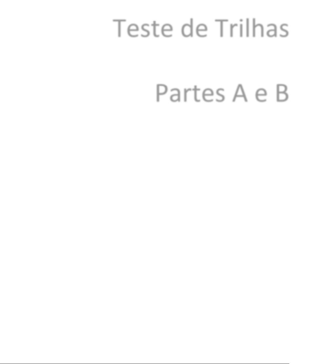Teste de Trilhas Partes A e B - Caderno de Aplicação - José Maria Montiel * Alessandra Gotuzo Seabra Descrição, evidências de validade e dados normativos em: Montiel, J. M., & Seabra, A. G. (2012). Teste de Trilhas: Partes A e B. Em: A. G. Seabra, & N. M. Dias (Org.), Avaliação neuropsicológica cognitiva: atenção e funções executivas (pp. 79-85). Vol. 1. São Paulo: Memnon. Dias, M. N., & Tortella, G. Evidências de validade do Teste de Trilhas: Partes A e B. Em: A. G. Seabra, & N. M. Dias (Org.), Avaliação neuropsicológica cognitiva: atenção e funções executivas (pp. 67-74). Vol. 1. São Paulo: Memnon. Dias, N. M., Trevisan, B. T., Seabra, A. G. Dados normativos do Teste de Trilhas: Partes A e B. Em: A. G. Seabra, & N. M. Dias (Org.), Avaliação neuropsicológica cognitiva: atenção e funções executivas (pp. 75-78). Vol. 1. São Paulo: Memnon. Para eficácia ótima da aplicação deste teste, imprima este Caderno de Aplicação do Teste de Trilhas: Partes A e B em papel tamanho carta (21,59 cm x 27,94 cm). Teste de Trilhas: Parte A Letras (Montiel e Seabra) Nome: ___________________________________________________________________________________ Sexo: � F � M - Data de nascimento: ____/____/____ - Escolaridade: ____________________________ Ocupação: ______________________________________________ - Data de aplicação: ____/____/_____ Instruções Você fará um teste de atenção em que você deverá ligar letras. Veja o exemplo abaixo. Há algumas letras, que estão ligadas, a partir do início da letra “A”, até o fim “D”, seguindo a ordem alfabética. No exemplo abaixo estão ligados “A”, “B”, “C” e “D”. Exemplo: A Início B C D Fim Na folha seguinte haverá 12 letras, de “A” a “L”. Você deverá fazer o mesmo, ligando desde o início, na letra “A”, até o fim, na letra “L”. Você terá um minuto para realizar a atividade. Faça o mais rápido que puder. A Início C F H L Fim B D E I J K G Teste de Trilhas: Parte A Números (Montiel e Seabra) Nome: ___________________________________________________________________________________ Sexo: � F � M - Data de nascimento: ____/____/____ - Escolaridade: ____________________________ Ocupação: ______________________________________________ - Data de aplicação: ____/____/_____ Instruções Você fará um teste de atenção em que você deverá ligar alguns números. Veja o exemplo abaixo. Há alguns números, que estão ligados, a partir do início “1”, até o fim no número “4”, seguindo a ordem numérica. No exemplo abaixo estão ligados “1”, “2”, “3” e “4”. Exemplo: 1 Início 3 2 4 Fim Na folha seguinte haverá 12 números, de “1” a “12”. Você deverá fazer o mesmo, ligando os números desde o início “1” até o fim no número “12”. Você terá um minuto para realizar a atividade. Faça o mais rápido que puder. Teste de Trilhas: Parte B Letras / Números (Montiel e Seabra) Nome: ___________________________________________________________________________________ Sexo: � F � M - Data de nascimento: ____/____/____ - Escolaridade: ____________________________ Ocupação: ______________________________________________ - Data de aplicação: ____/____/_____ Instruções Você fará um teste de atenção em que você deverá ligar letras e números. Veja o exemplo abaixo. Há algumas letras e alguns números, que estão ligados, a partir do início, na letra “A”, até o fim, no número “2”, alternando entre uma letra e um número, seguindo as ordens alfabética e numérica. No exemplo abaixo estão ligados “A”, “1”, “B” e “2”. Exemplo: A Início 2 Fim 1 B Na folha seguinte haverá 12 letras, de “A” a “L”, e 12 números, de “1” a “12”. Você deverá fazer o mesmo, ligando letras e números alternadamente, desde o início na letra “A” até o fim no número “12”. Você terá um minuto para realizar a atividade. Faça o mais rápido que puder. A Início C 2 1 B D 5 3 H L 12 Fim F 8 K E 4 I 10 J 6 G 9 7 11