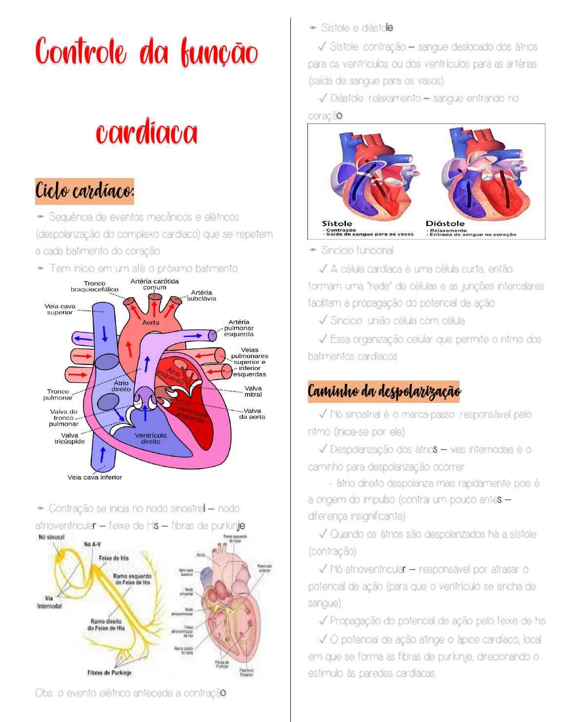 Camila Mariana Castro de Oliveira Medicina Nove de Julho BMF 2- Fisiologia ➛ Sequência de eventos mecânicos e elétricos (despolarização do complexo cardíaco) que se repetem a cada batimento do coração ➛ Tem início em um até o próximo batimento ➛ Contração se inicia no nodo sinoatrial – nodo atrioventricular – feixe de His – fibras de purkinje Obs: o evento elétrico antecede a contração ➛ Sístole e diástole ✓ Sístole: contração – sangue deslocado dos átrios para os ventrículos ou dos ventrículos para as artérias (saída de sangue para os vasos) ✓ Diástole: relaxamento – sangue entrando no coração ➛ Sincício funcional: ✓ A célula cardíaca é uma célula curta, então formam uma “rede” de células e as junções intercalares facilitam a propagação do potencial de ação. ✓ Sincício: união célula com célula ✓ Essa organização celular que permite o ritmo dos batimentos cardíacos ✓ Nó sinoatrial é o marca-passo: responsável pelo ritmo (inicia-se por ele) ✓ Despolarização dos átrios – vias internodais é o caminho para despolarização ocorrer - átrio direito despolariza mais rapidamente pois é a origem do impulso (contrai um pouco antes – diferença insignificante) ✓ Quando os átrios são despolarizados há a sístole (contração) ✓ Nó atrioventricular – responsável por atrasar o potencial de ação (para que o ventrículo se encha de sangue) ✓ Propagação do potencial de ação pelo feixe de his ✓ O potencial de ação atinge o ápice cardíaco, local em que se forma as fibras de purkinje, direcionando o estimulo às paredes cardíacas Camila Mariana Castro de Oliveira Medicina Nove de Julho BMF 2- Fisiologia ➛ Analise do perfil elétrico do coração ✓ Onda P: despolarização atrial / sístole atrial ✓ Onda QRS: despolarização ventricular/ sístole ventricular ✓ Onda T: repolarização ventricular/ diástole ventricular ➛ Sístole atrial: etapa que corresponde a finalização de preenchimento ventricular ✓ Valvas atrioventricular fechadas se abrem e permitem que o sangue flua dos átrios para os ventrículos ✓ Valvas semilunares permanecem fechadas ✓ Nessa fase: átrios se contraem simultaneamente com a abertura da valva AV, forçando o sangue a ir aos ventrículos ➛ Sístole ventricular (diástole atrial) a) Contração isovolumétrica (inicialmente) – não gera deslocamento do sangue / aumento da pressão b) Ejeção rápida (pico de pressão) c) Ejeção lenta (vai diminuindo a pressão) ✓ Valvas semilunares fechadas ✓ Ventrículos começam a se contrair e a pressão intraventricular aumenta rapidamente ✓ Volume ventricular de sangue permanece o mesmo ➛ Diástole ventricular a) Relaxamento isovolumétrico – todas as valvas cardíacas se fecham, não há sangue passando entre as câmaras cardíacas / diminuição da pressão b) Enchimento rápido c) Enchimento lento ✓ Abertura das valvas atrioventriculares e fechamento das valvas semilunares 1) Sístole atrial 2) Contração ventricular isovolumétrica 3) Ejeção ventricular 4) Relaxamento ventricular isovolumétrico 5) Diástase – enchimento ventricular Camila Mariana Castro de Oliveira Medicina Nove de Julho BMF 2- Fisiologia ➛ Dinâmica valvar ✓ Sístole: valvas pulmonar e aórtica abertas; valvas atrioventriculares fechadas ✓ Diástole: valvas pulmonar e aórtica fechadas; valvas atrioventriculares abertas ➛ 1° bulha (B1) - TUMmm ✓ Grave (40-50 Hz) ✓ Prolongada (0,15seg) ✓ Evento determinante: - Fechamento das valvas AV na sístole ventricular - Ausculta no 5° espaço intercostal ➛ 2° bulha (B2) – TÁ ✓ Aguda (70Hz) ✓ Breve (0,11seg) ✓ Evento determinante: - Fechamento das valvas semilunares - Ausculta no 2° espaço intercostal (valva pulmonar à esquerda do esterno e valva aórtica à direita ➛ Débito cardíaco: ✓ Quantidade de sangue ejetado pelo coração em mL/min ou L/min ✓ DC= 5 a 6L/min ✓ DC = FC x VS (deve se ajustar às demandas de O2) ➛ Fração de ejeção: ✓ Porcentagem de sangue ejetado pelo coração a cada batimento cardíaco ✓ FE = 55 a 75% ➛ Volume sistólico: ✓ Volume de sangue ejetado pelo coração a cada sístole ventricular ✓ Normal = 50 a 70 mL ➛ Volume sistólico final: ✓ Volume de sangue que permanece no coração após a sístole ventricular ✓ Normal = 60 a 70 mL ➛ Volume diastólico final: ✓ Volume de sangue dentro do ventrículo ao final da diástole ✓ Normal = 120 a 140 mL ➛ Trabalho cardíaco: Fase A: final da sístole – pressão baixa no ventrículo / 50 mL Fase A-B: diástole – preenchimento do ventrículo com sangue Fase B: final da diástole – 120 mL sangue / mantem pressão Fase B-C: contração isovolumétrica – contrai e vai aumentando a pressão até o momento de abrir a válvula aórtica e ejetar sangue Fase C: abertura da válvula aórtica Fase C-D: ejeção – pressão aumenta e começa a cair pois o volume já diminuiu muito Fase C-A: relaxamento isovolumétrico / diminui pressão e abre a válvula atrioventricular Camila Mariana Castro de Oliveira Medicina Nove de Julho BMF 2- Fisiologia ✓ A área do gráfico pode mudar, dependendo do trabalho do coração ➛ Debito sistólico: (DS) ✓ Não é constante frente a grande variação da FC ✓ 50-70 mL/sístole ✓ Depende: - Retorno venoso - Contratilidade miocárdica - Resistencia à ejeção
