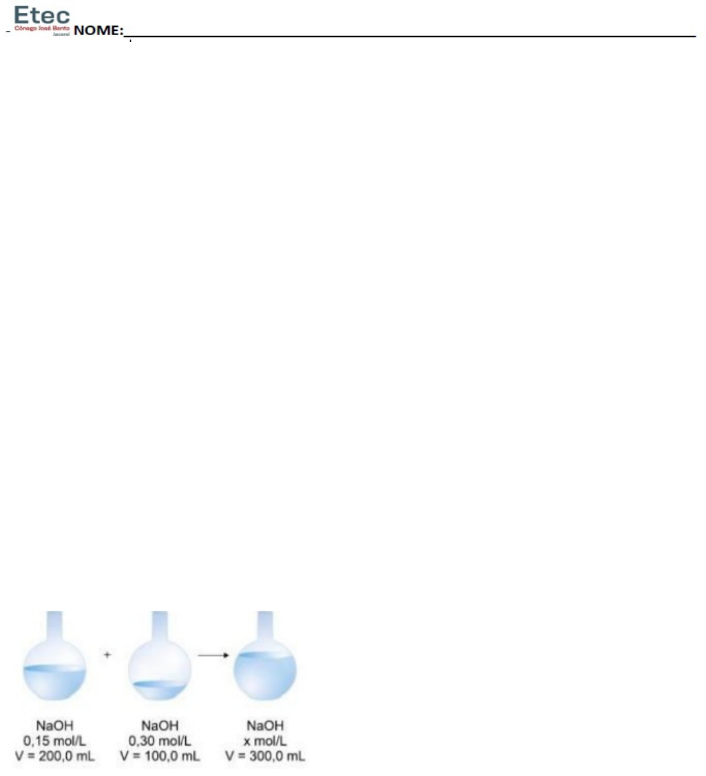 TS1 – 2º BIM- TPI - TA– 3º ETIM de Tec. de Química – Com consulta ao caderno e tabelas Ob.: As questões número 4, 8 e 10 só serão válidas com seus respectivos cálculos 1ª) Uma solução 0,05 M de glicose, contida em um béquer, perde água por evaporação até restar um volume de 100 ml, passando a concentração para 0,5 M. O volume de água evaporada é, aproximadamente: a) 50 ml b) 100 ml c) 500 ml d) 900 ml e) 1 000 ml 2ª) Pipetaram-se 10 ml de uma solução aquosa de NaOH de concentração 1,0 mol/L. Em seguida foi adicionada água suficiente para atingir o volume final de 500mL. A molaridade da solução final é: a) 5,0.10-3 mol/L. b) 2,0.10-2 mol/L. c) 5,0.10-2 mol/L. d) 0,10 mol/L. e) 0,20 mol/L. 3ª) Em 50g de uma solução de ácido sulfúrico de 63% em massa é adicionado 400g de água. A porcentagem em massa do ácido sulfúrico na solução obtida é: a) 7%. b) 9%. c) 10%. d) 12%. e) 16%. 4ª) Deseja-se diluir um litro da solução de H2SO4 a 80% e de densidade 2,21g/cm3 até o volume de cinco litros. Quais são as concentrações molares do H2SO4, antes e depois da diluição? 5ª) Misturam-se 200 ml de solução de hidróxido de potássio de concentração 5,0g/L com 300 ml de solução de mesma base com concentração 4,0g/L. A concentração final em g/L é: a) 0,5 b) 1,1 c) 2,2 d) 3,3 e) 4,4 6ª) Observe a figura abaixo: O valor de x é: a) 0,100 b) 0,150 c) 0,200 d) 0,225 e) 0,450 7ª) Uma enfermeira precisa preparar 0,50 L de soro que contenha 1,5.10-2 mol de KCℓ e 1,8.10-2 mol de NaCℓ, dissolvidos em uma solução aquosa de glicose. Ela tem à sua disposição soluções aquosas de KCℓ e NaCℓ de concentrações, respectivamente, 0,15 g/ml e 0,60.10-2 g/ml. Para isso, terá que utilizar x ml da solução de KCℓ e y ml da solução de NaCℓ e completar o volume, até 0,50 L, com a solução aquosa de glicose. Os valores de x e y devem ser, respectivamente: a) 2,5 e 0,60.102 b) 7,5 e 1,2. 102 c) 7,5 e 1,8. 102 d) 15 e 1,2. 102 e) 15 e 1,8. 102 8ª) A molaridade de uma solução X de ácido nítrico é o triplo da molaridade de outra solução Y de mesmo ácido. Ao se misturar 200 ml da solução X com 600 ml da solução Y, obtém-se uma solução 0,3 mol/L do ácido. Quais são os valores da molaridade das soluções X e Y? 9º) A respeito das soluções: Assinale (V) verdadeiro ou (F) falso. ( ) Quando diluímos uma solução, estamos aumentando o número de mol do soluto. ( ) Quando diluímos uma solução, estamos aumentando o número de mol do solvente. ( ) Na evaporação de uma solução aquosa de um composto iônico, o número de mols do soluto não se altera. ( ) Quando misturamos duas soluções de mesmo soluto, porém com molaridades diferentes, a solução final apresenta uma molaridade com valor intermediário às molaridades iniciais. ( ) Ao misturarmos soluções de solutos diferentes, sem que haja reação, na verdade o que ocorre é uma simples diluição de cada um dos solutos. 10ª) Misturamos 200 ml de uma solução aquosa de H2SO4 1,0 mol/L com 200 ml de uma solução aquosa de KOH 3,0 mol/L. Determine a molaridade da solução final em relação: a) Ao ácido. b) À base. c) Ao sal formado.