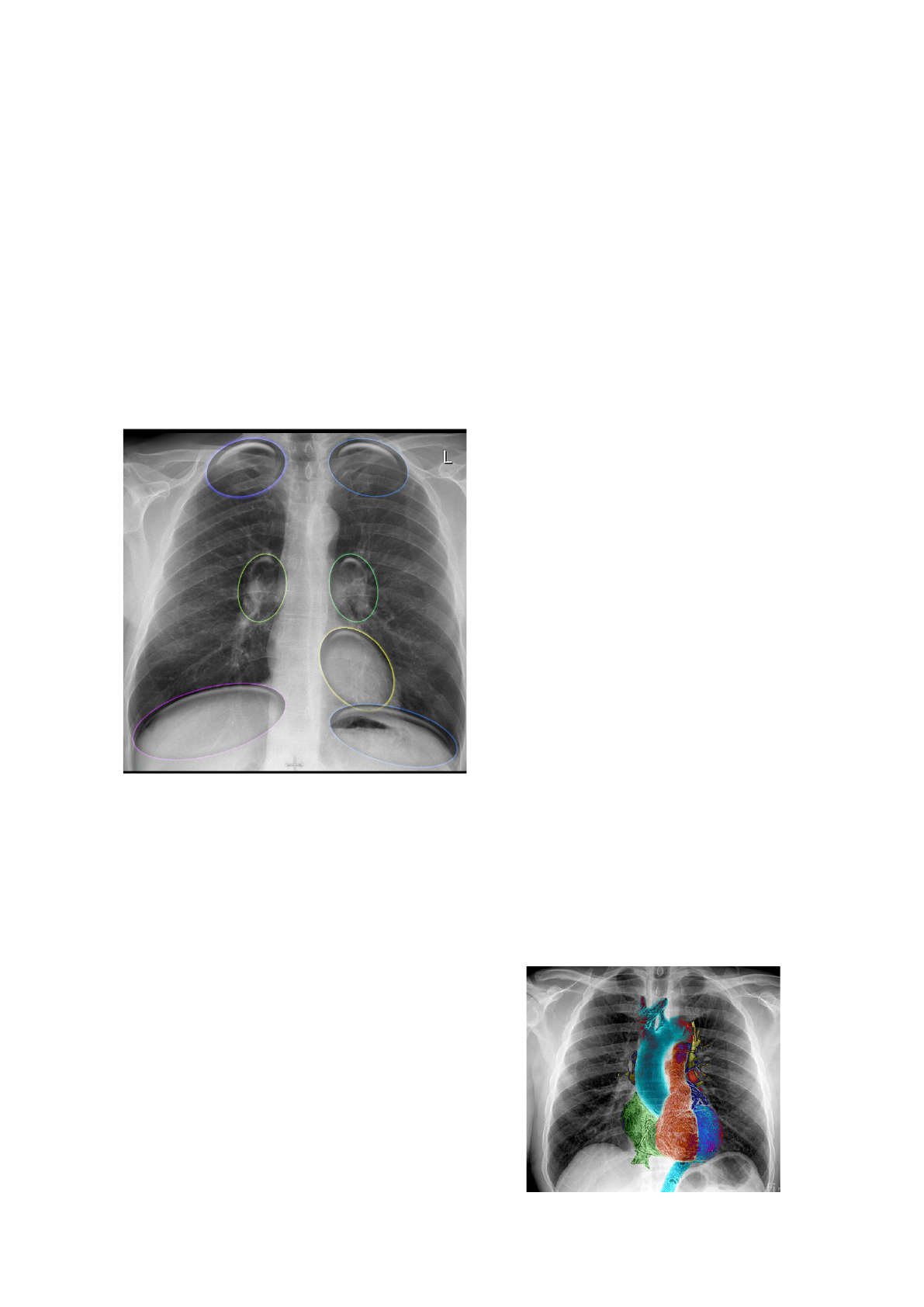 Radiologia Torácica Áreas Escondidas Áreas mais difíceis de serem vistas por sobreposição de estruturas; Áreas atrás das clavículas, áreas dos hilos pulmonares, área retrocardíaca e áreas atrás dos diafragmas; Na tomografia é mais fácil de conseguir enxergar essas questões; Cúpula diafragmática é maior na parte anterior, o que faz com que uma parte posterior acabe ficando escondida; o perfil acaba mostrando uma parte; Área Retrocardíaca ➢ Área mais densa; ➢ Difícil diferenciação; Coração e Pericárdio Átrio esquerdo Estrutura mais posterior; Recebe sangue das vv. pulmonares que correm horizontalmente em direção ao átrio; Apêndice atrial pode ser visto como uma pequena bolsa logo abaixo do tronco pulmonar; A borda posterior superior do coração é formada pelo átrio esquerdo; O alargamento pode causar uma protuberância do contorno posterior superior; Átrio direito Recebe sangue da vv. cava inferior e superior; Aumento causa dilatação do contorno direito do coração; Ventrículo esquerdo Situado à esquerda e posteriormente ao ventrículo direito; Alargamento resulta em um aumento do coração parcial a esquerda e na visão lateral abaulamento do contorno posterior inferior; Ventrículo direito Estrutura mais anterior; Situada atrás do esterno; Seu alargamento resultará quando for visão PA em um aumento do coração para a esquerda e pode fazer com que a borda esquerda do coração seja formada pelo VD; Aumento do átrio e ventrículo esquerdo faz com que a linha da vv. cava “suma”; Cenário Aa. pulmonar, VE, VD aumentados; Possíveis HP e IC congestiva; Cardiomegalia; Prótese valvar aórtica ou mitral Pega a imagem em perfil e divide o coração em dois de forma diagonal; A que ficar inferior é mitral; Superior a essa linha é aórtica; Marca-passo e dispositivos elétrico cardíacos Eletrodos - Posterior colocado no átrio esquerdo e anterior e mais inferior no ventrículo direito; Importante olhar se os eletrodos estão íntegros, se não estão quebrados. Cenário Derrame Pericárdico; Coração perde o formato dele, fica em formato triangular/disforme; Aumentado; Padrão-ouro é Ecocardiograma; Paciente pós-operatório de cirurgia cardíaca e esôfago, a tomografia de tórax é mais específico que o raio-x; Importante injetar contraste para analisar de forma mais assertiva; Um dos achados iniciais da IC é a alteração da vascularização do pulmão (terço superior tem o mesmo calibre e quantidade de vasos do terço inferior - Sinal de IC); Lobos inferiores dos pulmões mais vascularizados; Pericardite Faz processo inflamatório do pericárdio e calcificar; Se calcificou ele não deixa o coração distender para encher na diástole e faz uma pericardite constritiva; No raio-x a borda inferior fica mais branca, assim como a anterior e lateral; Pode levar a pericardite constritiva; Calcificação do miocárdio Coração quando infarta, ele cicatriza como tecido fibrótico; Esse tecido pode calcificar e às vezes ossificar; Coxins adiposos epipericárdicos Área de gordura dentro do mediastino; Borda do coração não consegue ser vista; Normalmente é do lado direito; Cardiomegalia assimétrico, parte mais hipodensa; Cisto pericárdico - Alteração congênita; pode fazer efeito compressivo sobre o parênquima pulmonar; Hilos pulmonares Estruturas de comunicação do mediastino com o pulmão; Cursam os brônquios, aa. e vv. pulmonares e tecido linfático; Hilos tem partes moles. Hilo esquerdo se encontra mais superior que o direito, nunca deve ser inferior; Aa. pulmonar esquerda é superior a direita; Vv. pulmonares são sobrepostas ao átrio esquerdo; na visão de perfil é de difícil visualização; E na visão AP são sobrepostas às aa. pulmonares, ou seja, é difícil visualizar as vv. pulmonares; A aa. pulmonar direita é mais verticalizada e mais arredondada, por sair anterior ao brônquio principal direito; A vv. pulmonar esquerda é mais superior e posterior que as aa. pulmonar direita; Normalmente tem a largura de um dedo tanto a aa. direita como a esquerda; Aa. pulmonar direita é mais fácil de ser visualizada do que a esquerda; Atelectasia do lobo inferior direito Aumento do mediastino Unilateral Infecção - Tuberculose - Viral - Bacterial; Tumores - Linfoma / Metástases - Pulmão, cabeça e pescoço; Tireóide; Vascular - Aneurisma pulmonar arterial / estenose; Bilateral Sarcoidose / Silicose; Infecção - TB / Viral / Bacteriana; Tumor - Linfoma e metástases; Vascular - HP / Doença da Valva Mitral / Embolismo recorrente / Shunt esquerda para direita; Sarcoidose Hilos pulmonares aumentados; Linfonodomegalia bilateral predominantemente dos hilos e paratraqueal; Não caseosa;