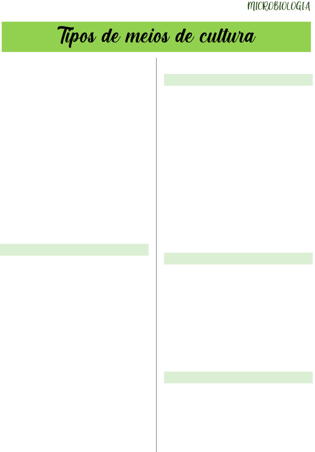 Sandy Caroline • ‘’Para se obter sucesso no cultivo, é necessário o conhecimento das exigências nutricionais do micro-organismo a ser isolado’’ Meio de cultura: solução ou gel nutriente utilizado para promover o crescimento de microrganismos em laboratório Tubo de ensaio – meio líquido : crescimento mais rápido Meio sólido: meio líquido + ágar 1,5% - células imobilizadas É o ágar que faz o meio ficar em forma de gel Colônia= aglomerado de células; formada a partir de uma célula ‘’ todas as células de uma colônia são idênticas ‘’ TIPO BÁSICO DE MEIOS DE CULTURA Meio quimicamente definido: a composição química exata do meio é conhecida; preparada com quantidades precisas de substâncias químicas altamente purificadas Meio indefinido (complexo): a composição química do meio não é conhecida; preparado com compostos químicos derivados da digestão de produtos naturais, como a caseína, carne, soja, levedura Meio enriquecido: contém nutrientes especiais que permitem o crescimento de um grupo específico de organismo; exemplos: Brain heart infusion (BHI) para favorecer o crescimento de microrganismos fastidioso, como o Streptococcus, pneumococcus e meningococcus; THM: tioglicolato e cisteina para anaeróbios MEIOS DE CULTURA ESPECIAIS Fornecem informações especiais sobre os microrganismos, auxiliando na caracterização e identificação Meio seletivo: favorece o crescimento de alguns microrganismos e suprime o crescimento de outros Meio diferencial: proporciona uma mudança visível, quando ocorre uma reação química especifica; exemplo: mudança na cor (ágar sangue é um exemplo) Meio seletivo e diferencial Meio reduzido: favorece o crescimento de microrganismos anaeróbios COLETA DE AMOSTRAS MICROBIOLÓGICAS Amostras devem ser: ❖ Livres de contaminação externa ❖ Representativas do universo do qual foram colhidas ❖ Examinadas logo após a obtenção (de preferência) ❖ Armazenadas sob baixas temperaturas Inoculação em meio líquido – plaqueamento em meio sólido – colônias isoladas CARACTERIZAÇÃO DO MICRORGANISMO Determinação de características: ❖ Morfológicas (microscopia de luz) ❖ Fisiológicas (testes bioquímicos) ❖ Resistência (antibiograma) ❖ Sorológicas (imunoensaios) Sandy Caroline • ❖ Genéticas (PCR) CARACTERIZAÇÃO MORFOLÓFICA Análise da morfologia colonial Análise da morfologia celular (tamanho, forma e arranjo celulares) esfregaço e coloração simples ou diferencial CARACTERIZAÇÃO FISIOLÓGICA Testes bioquímicos: análise da atividade enzimática; teste de fermentação de substratos ↪ Utilizados na identificação rápida de microrganismos; os resultados variam de 4 a 24 horas Perfil de utilização de substratos por multiensaios ↪ Contêm um grande número de meios seletivos e diferenciais ↪ Ocupam pouco espaço em incubadora ↪ Oferecem uma maneira mais rápida e confiável para a identificação de patógenos ANÁLISE DA ATIVIDADE ENZIMÁTICA Prova da coagulase: Capacidade do microrganismo de coagular o plasma sanguíneo Prova da catalase: a catalase converte o peróxido de hidrogênio em oxigênio molecular e água CARACTERIZAÇÃO DE RESISTÊNCIA Teste de sensibilidade a antibióticos (antibiograma)
